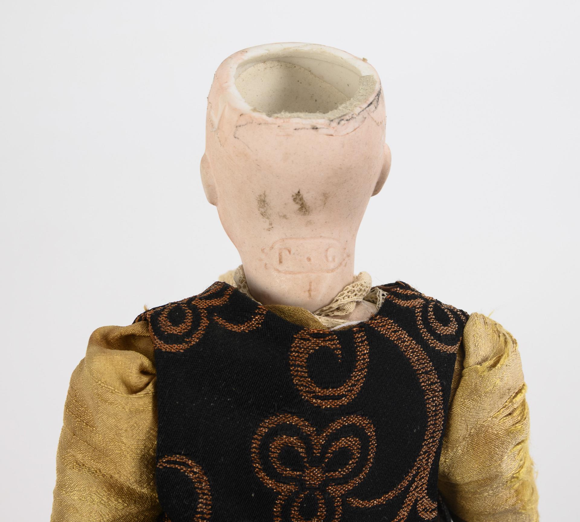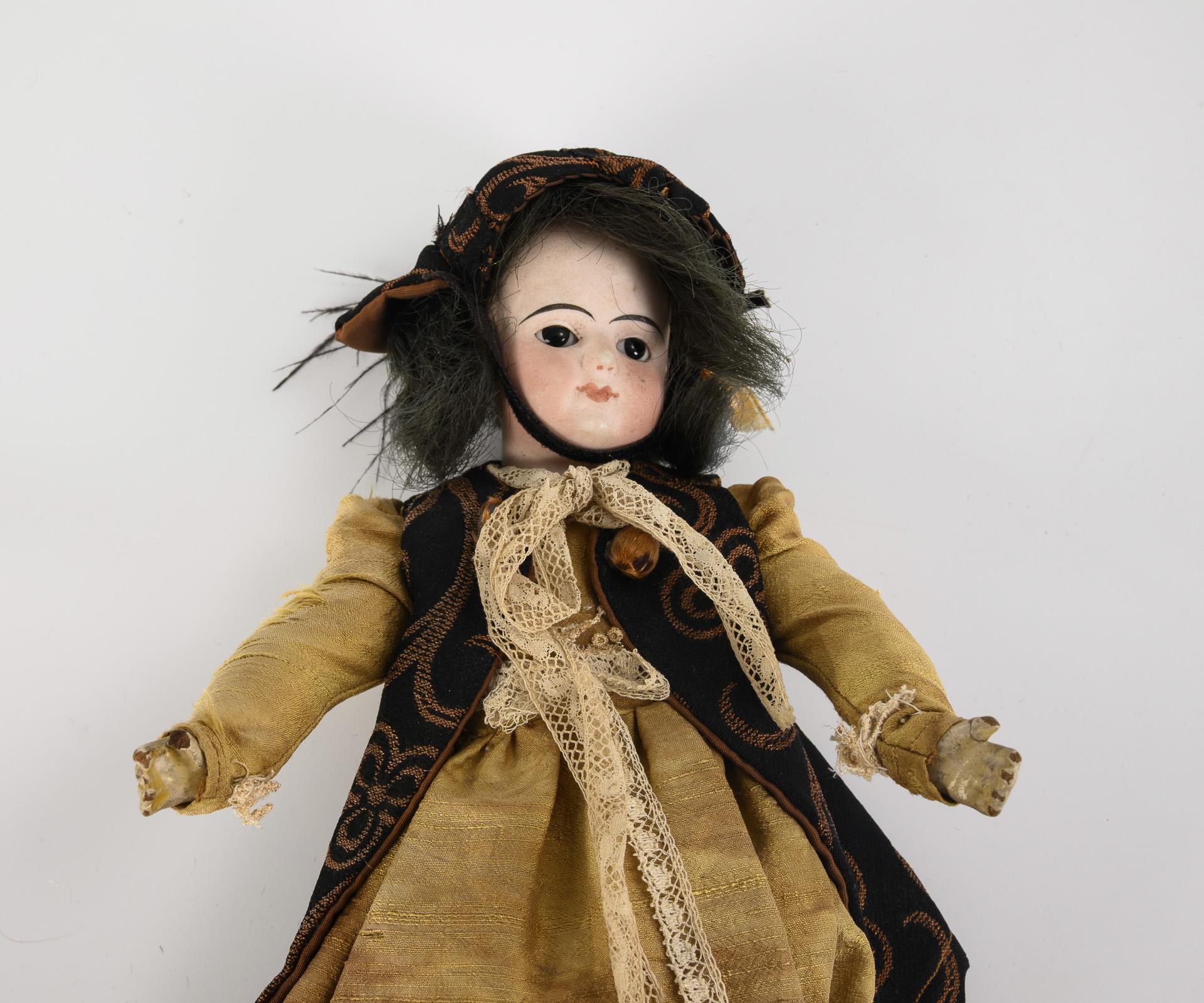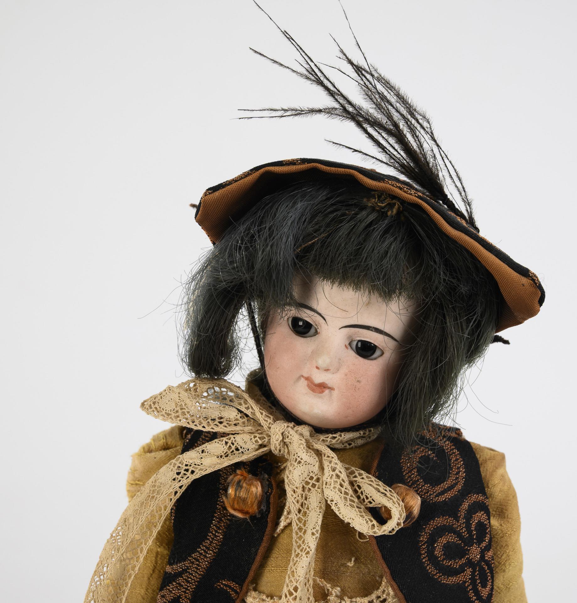 Kurbelkopf, feste braune Glasaugen, geschlossener Mund, blaustichige Perücke. Schlanker, 5-teiliger Körper. Braunes Wildseidenkleid, Weste, passender Hut. Kopf durchleuchtet: ohne Risse, lediglich winzige Chips an Halskurbel und Kopfkrone. Körper mit Defekten, Finger minimal bestoßen, Füße geklebt.