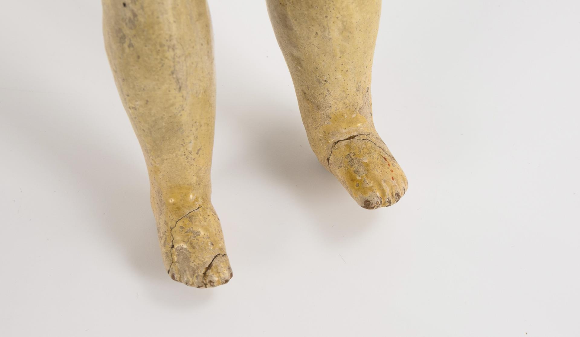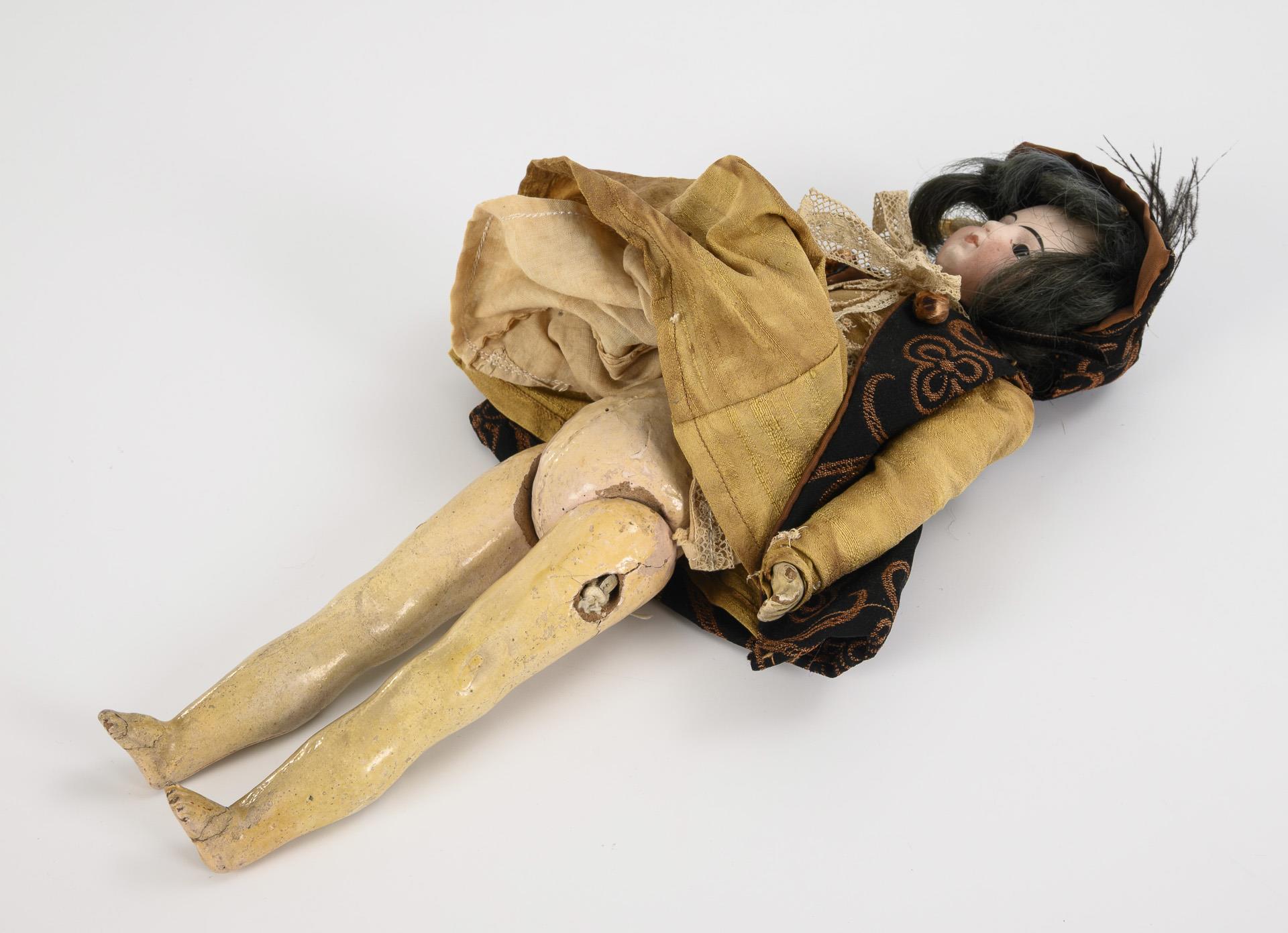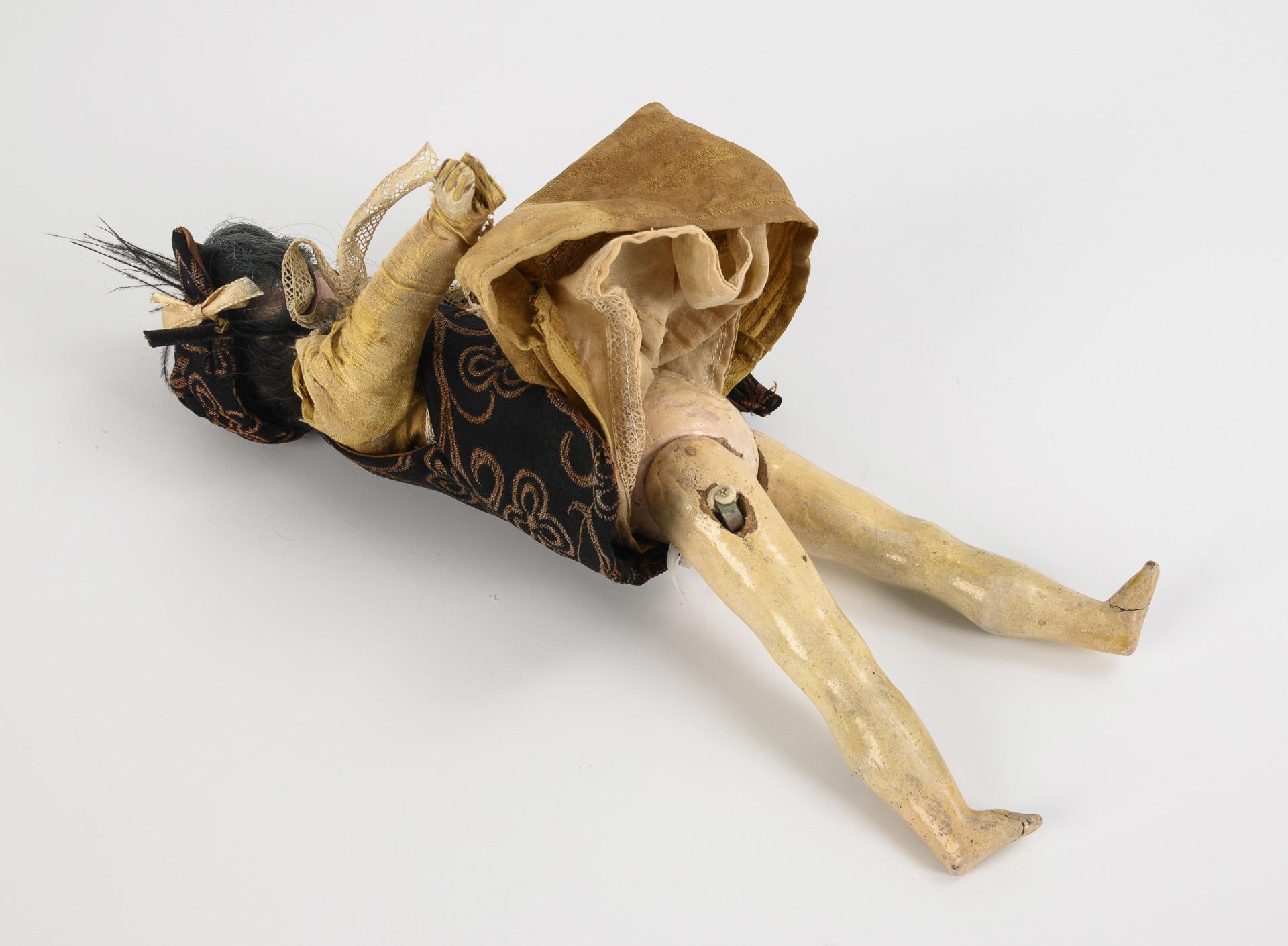 Kurbelkopf, feste braune Glasaugen, geschlossener Mund, blaustichige Perücke. Schlanker, 5-teiliger Körper. Braunes Wildseidenkleid, Weste, passender Hut. Kopf durchleuchtet: ohne Risse, lediglich winzige Chips an Halskurbel und Kopfkrone. Körper mit Defekten, Finger minimal bestoßen, Füße geklebt.