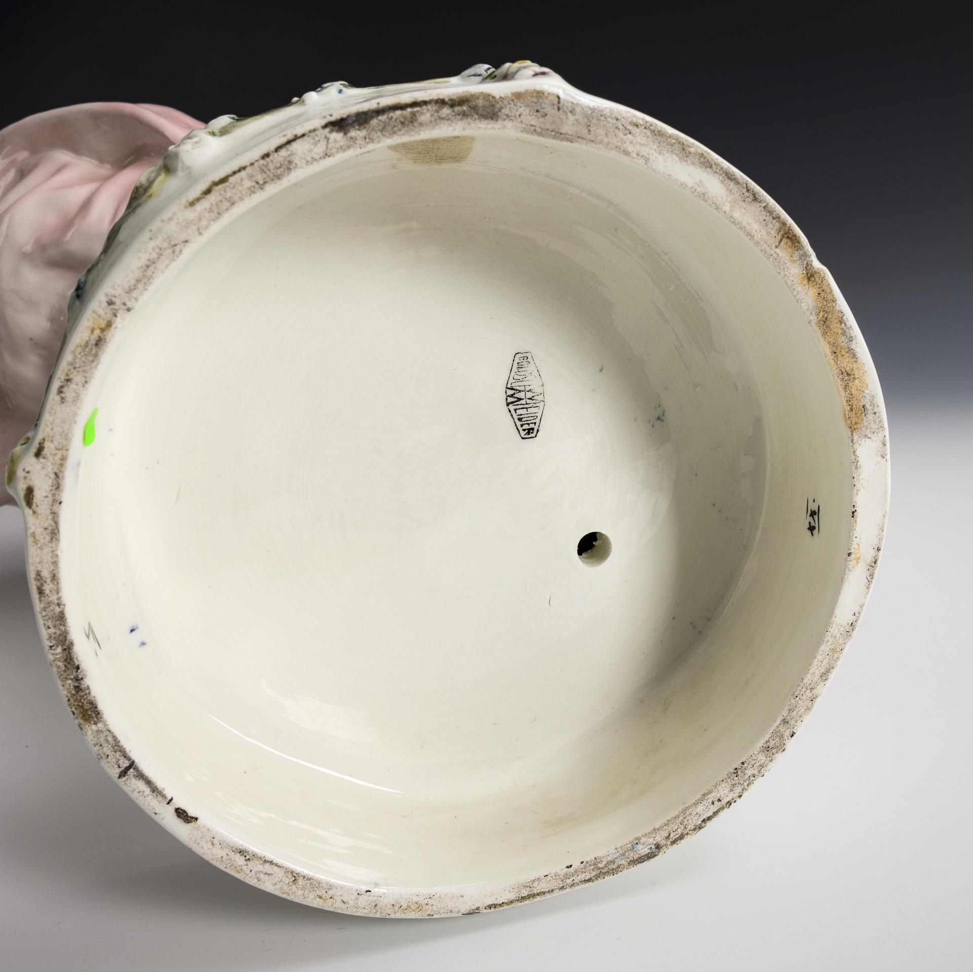 Stehendes Mädchen in rosafarbenem Kleid, mit Blumenkranz im Haar und ausgestrecktem Arm, auf Rundsockel mit reliefierter Blumengirlande. Beide Hände restauriert.
