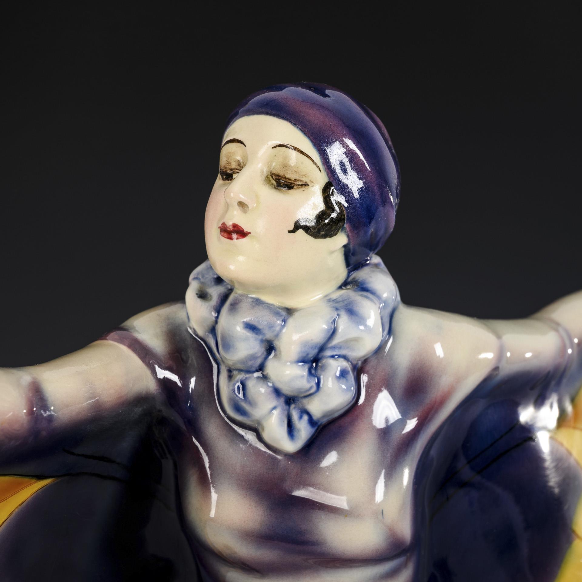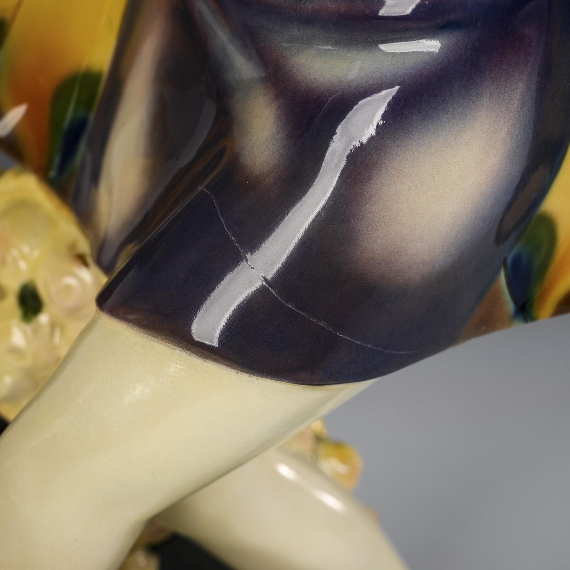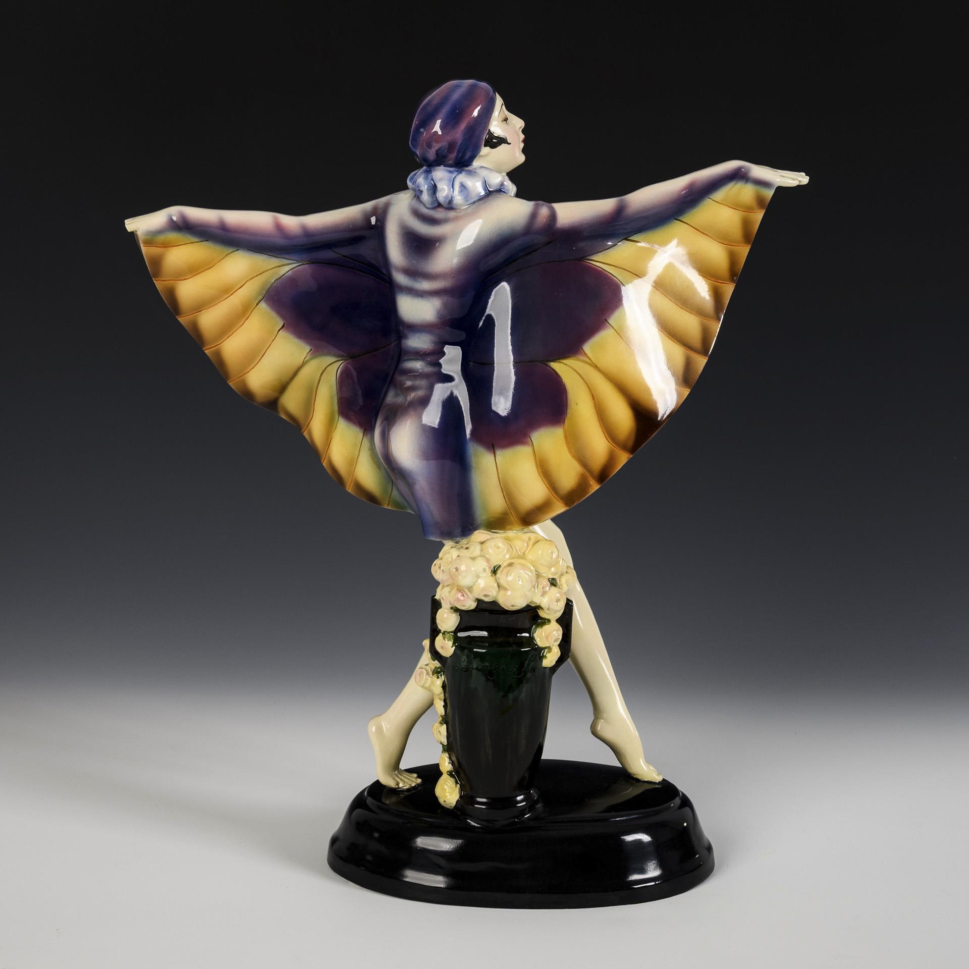 Tänzerin in einem violett-gelben Kleid mit grünen Punkten beim faunalen Ausdruckstanz nach dem berühmten Vorbild der deutschen Tänzerin Niddy Impekoven (1904-2002), auf schwarzem Ovalsockel. Oft auch als "Schmetterlingstänzerin" bezeichnet. Restauriert, 1 Hand fehlt, Oberschenkel rissig.