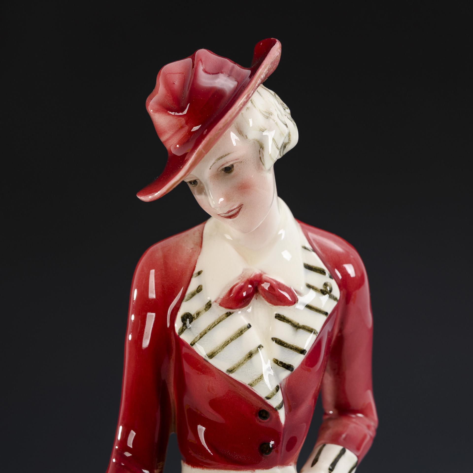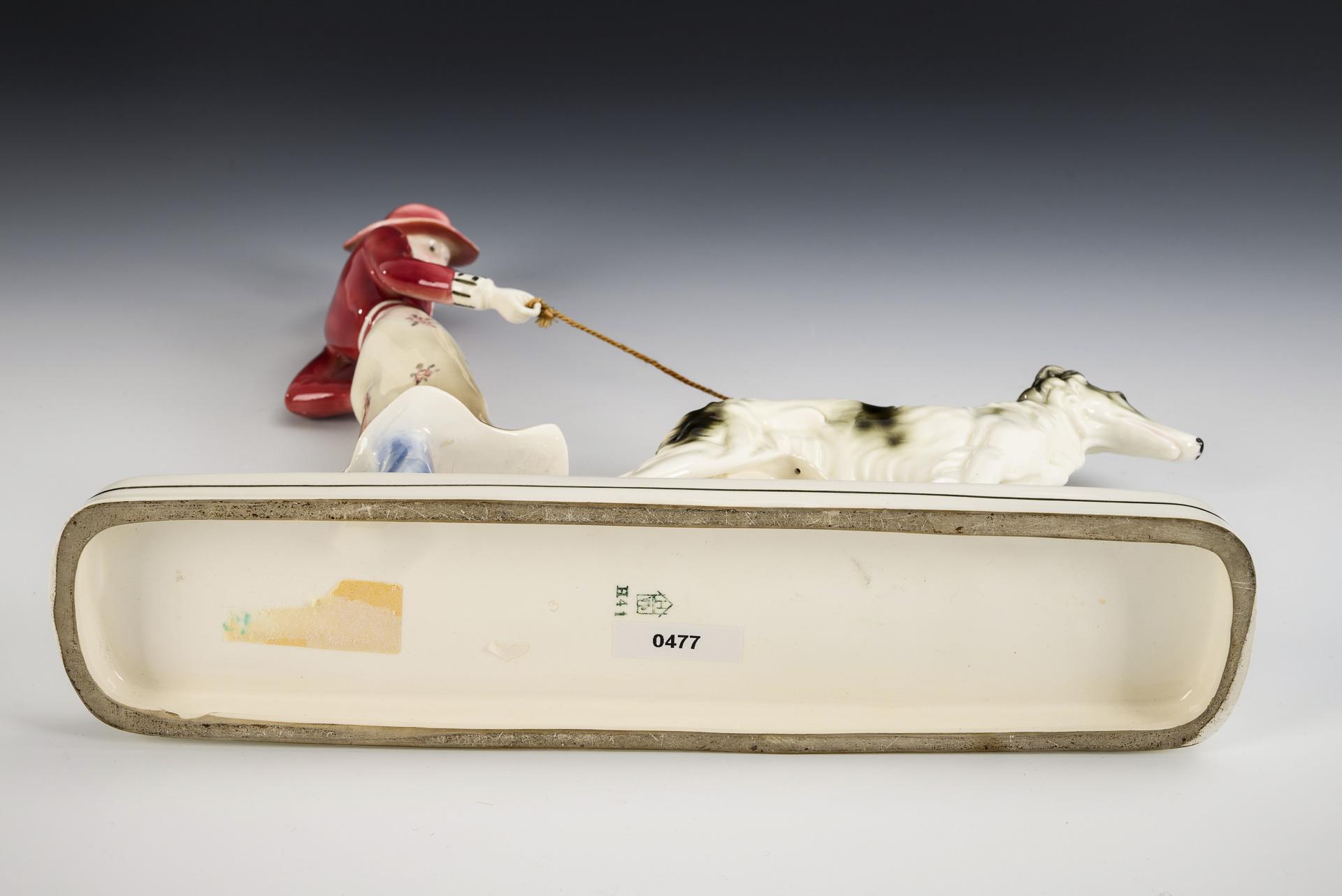 Figurengruppe mit einer Dame in roter Jacke und Hut, die einen Barsoi ausführt, auf länglichem Sockel. Windhund mit feinem Riss am Rumpf.