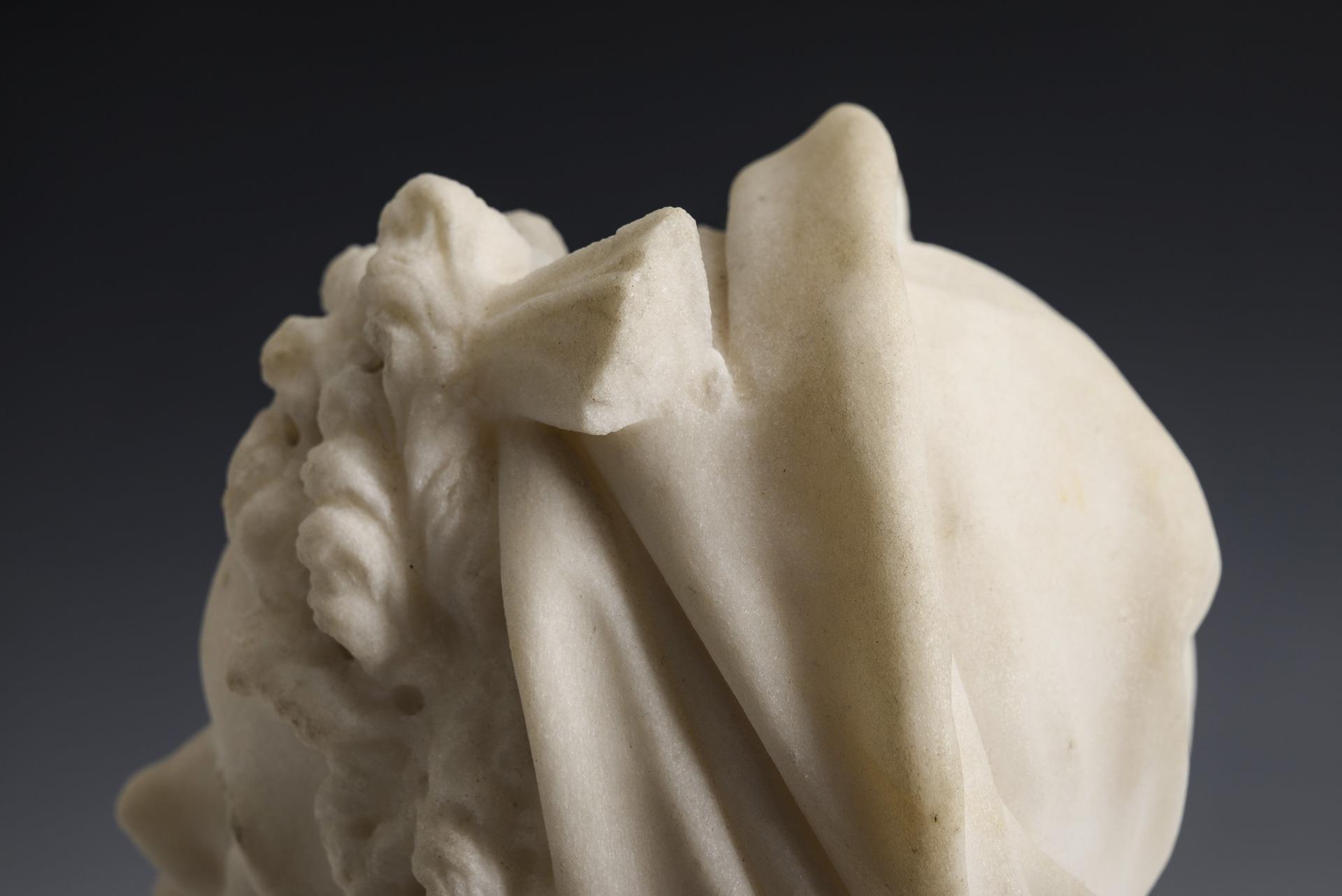 Junge Frau mit einer durch ein Tuch zurückgehaltenen Frisur, großen Ohrringen und einer Perlenkette. Kleine Ausbrüche im Gesicht, an den Haaren und an der Rückseite des Tuches, Sockel bestoßen.
