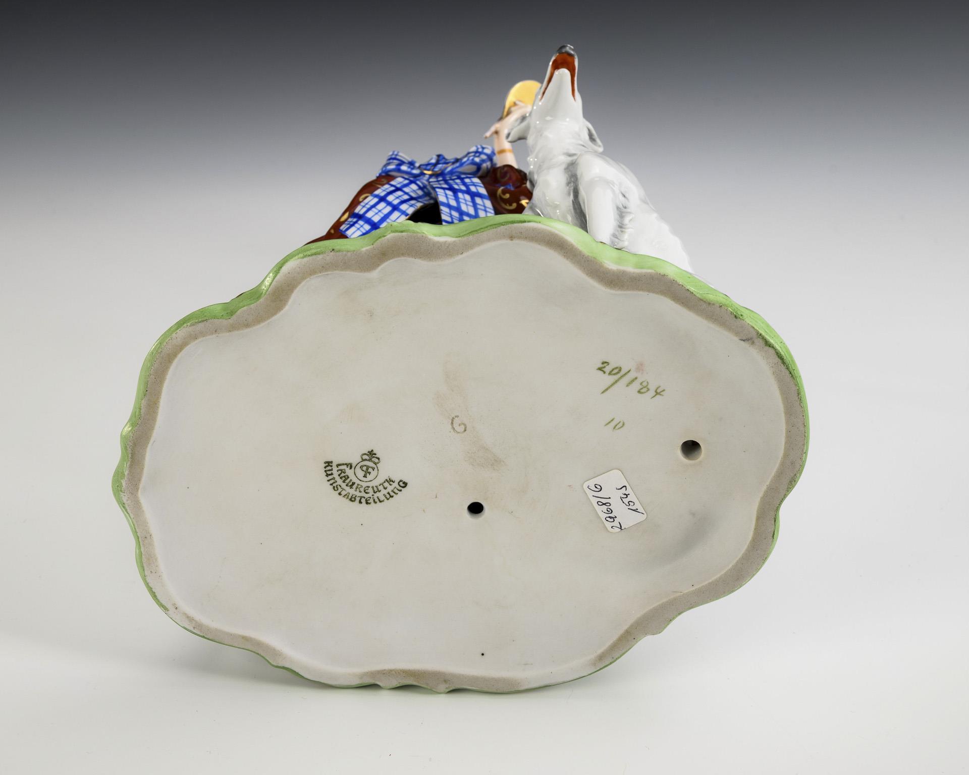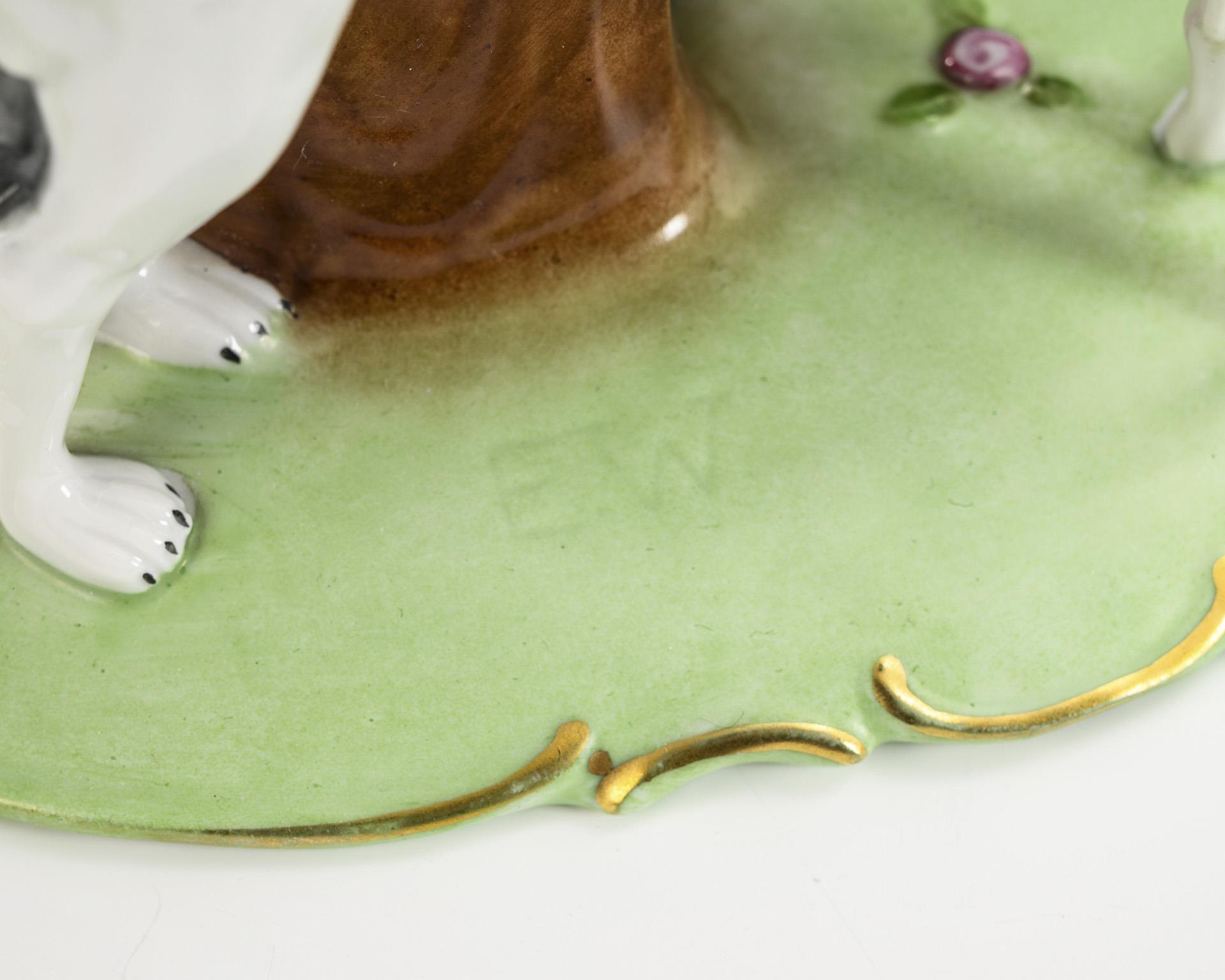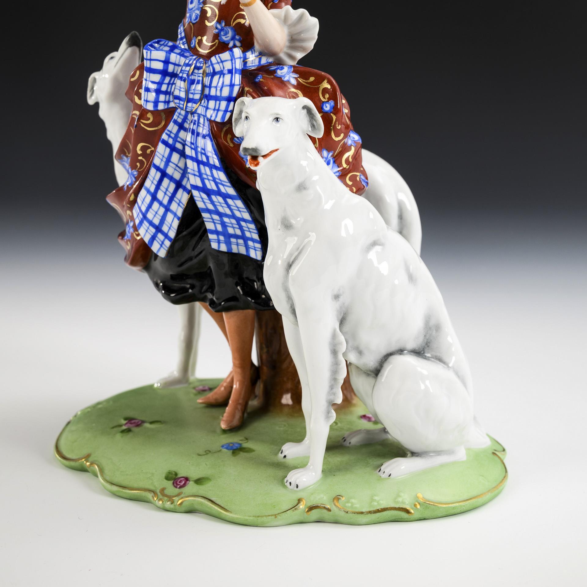 Auf einem Natursockel stehende, sich das Haar frisierende Rokokodame mit Spiegel, ihr zur Seite zwei Windhunde sitzend. Rechte Hand geklebt, verso kleine Farbabplatzer am Rock.