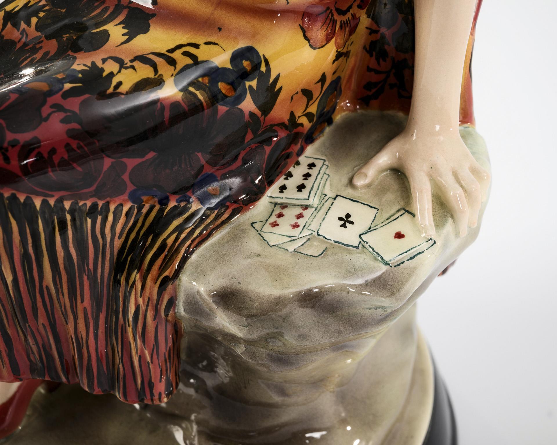 Auf einem Steinfelsen sitzende Dame (im Werksverzeichnis geführt als "Zigeunerin") in geblümtem Kleid mit Spielkarten, auf schwarzem Rundsockel.