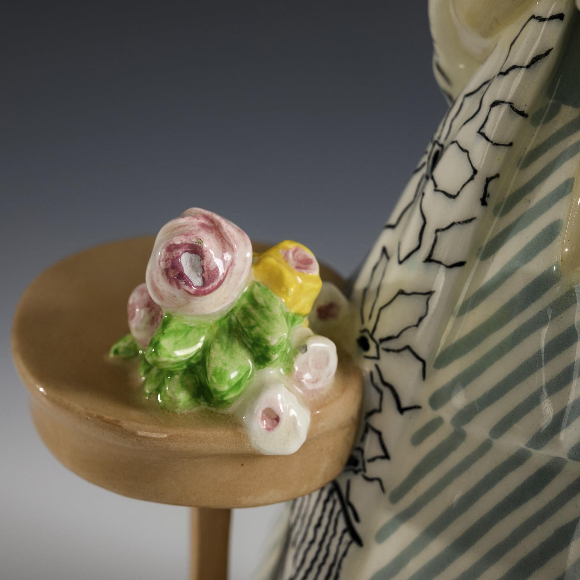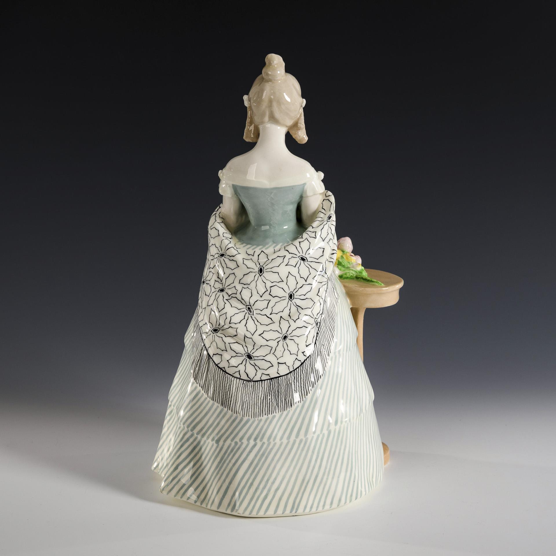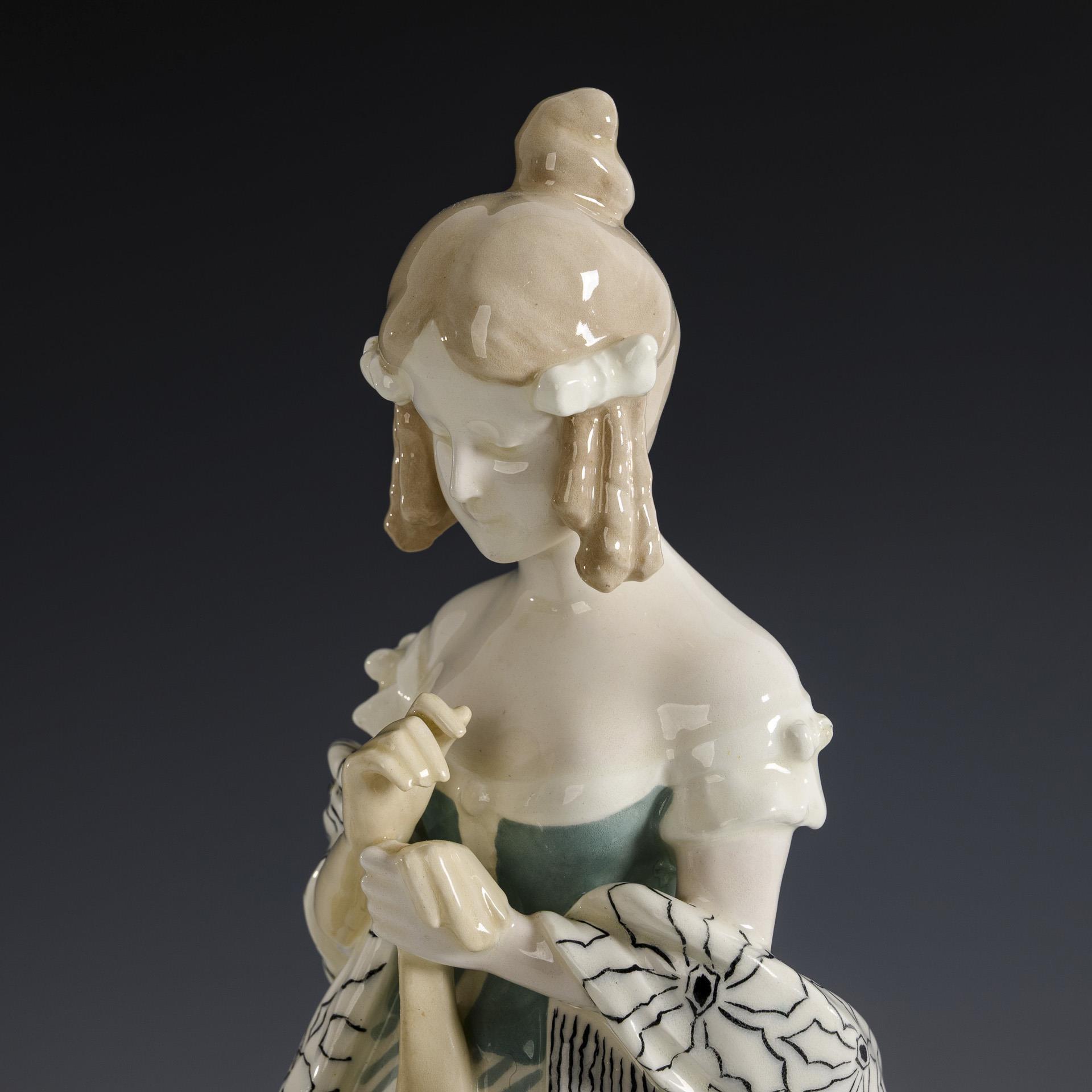 Jugendstil-Figur "Biedermeier-Mädchen mit Tischchen und Blumenstrauß". Wiener Manufaktur Friedrich Goldscheider.