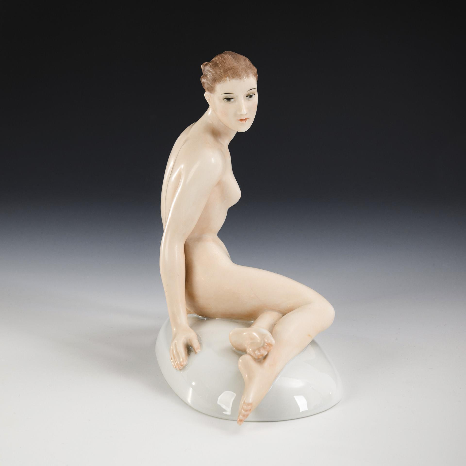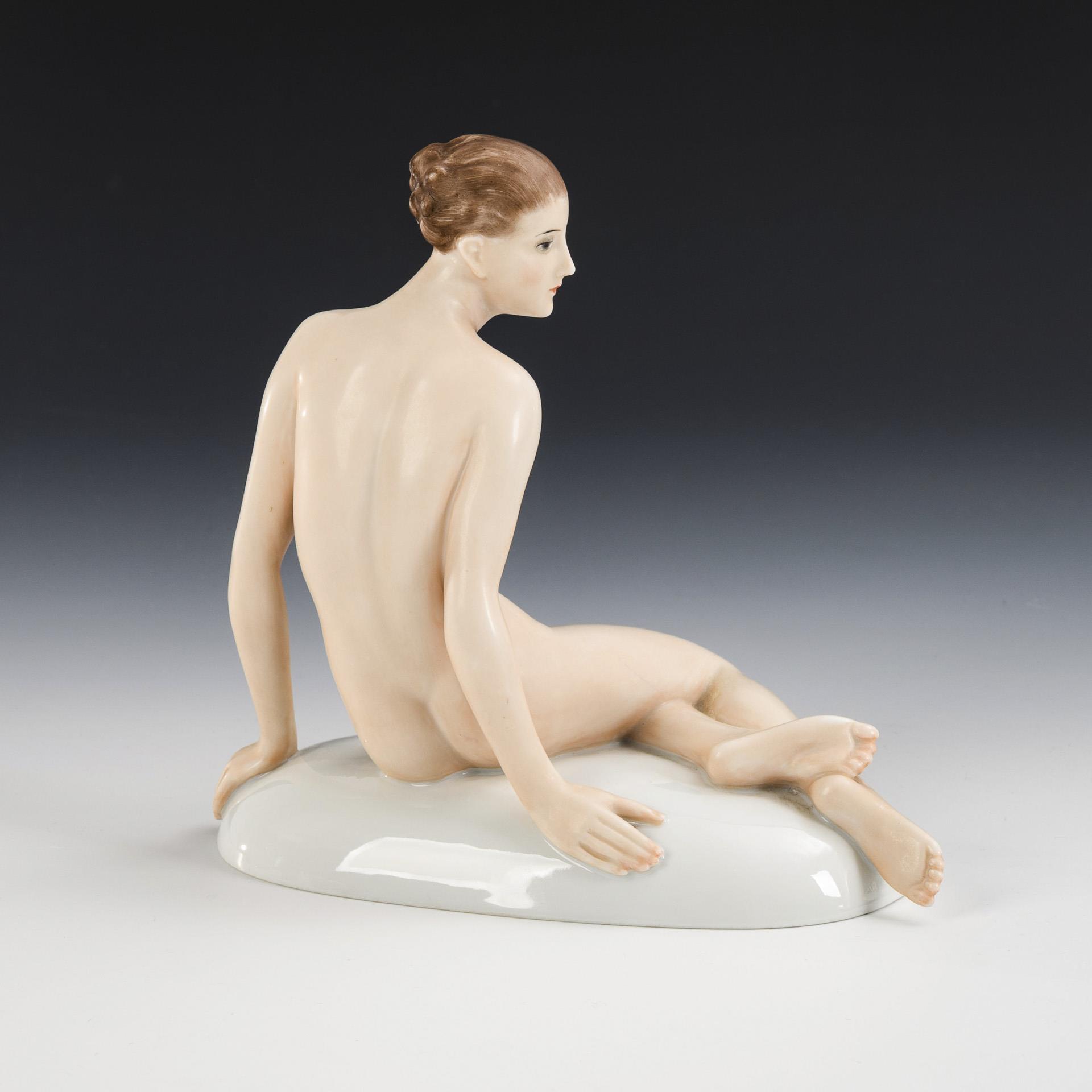 Auf einer Rundplinthe sitzende nackte junge Frau.