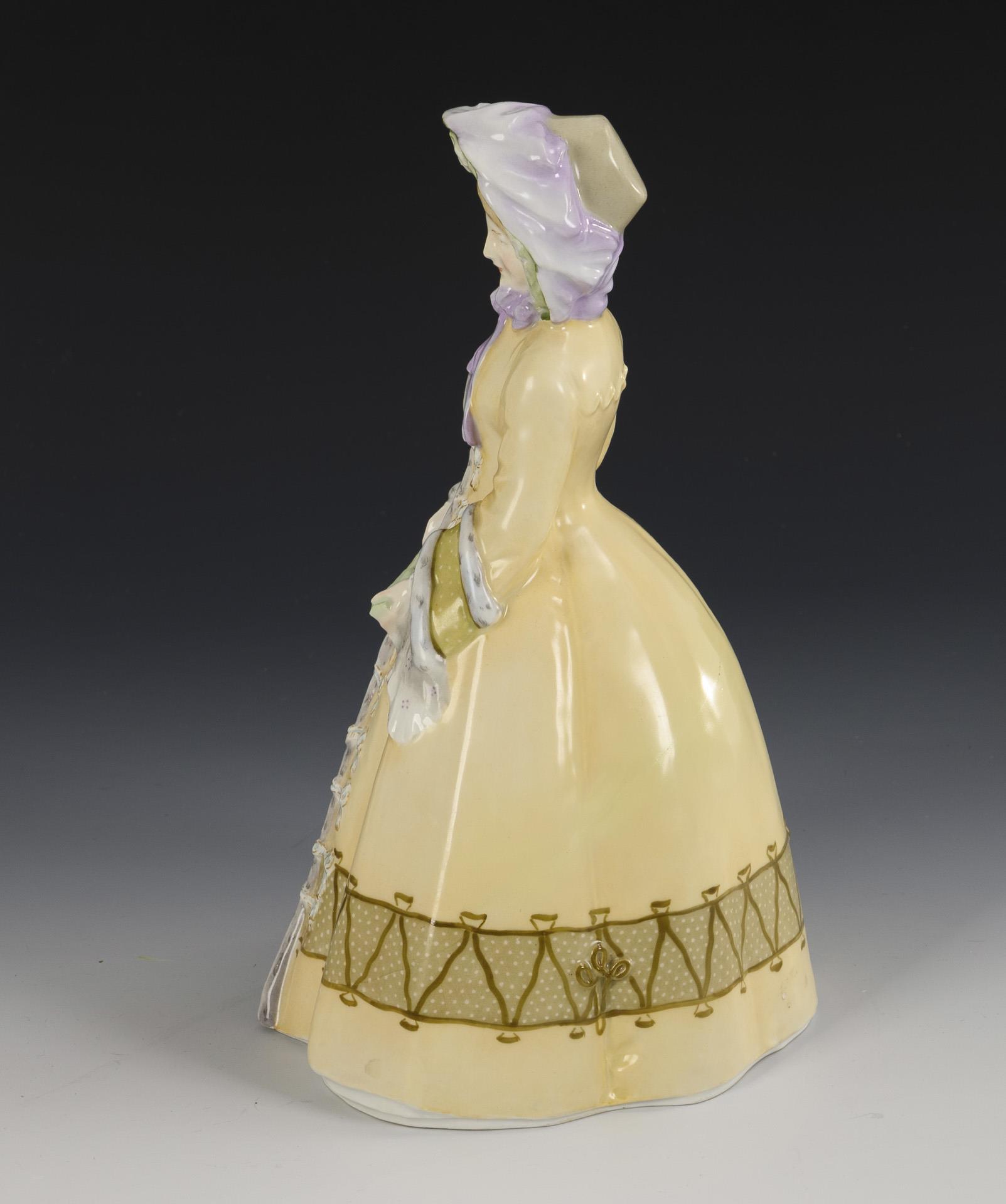 Figur der Schauspielerin Agnes Sorma (1862-1927) mit großem Hut und Fächer, die Figur der Minna von Barnhelm in dem gleichnamigen Stück von Gotthold Ephraim Lessing darstellend. Restaurierung am Stand.