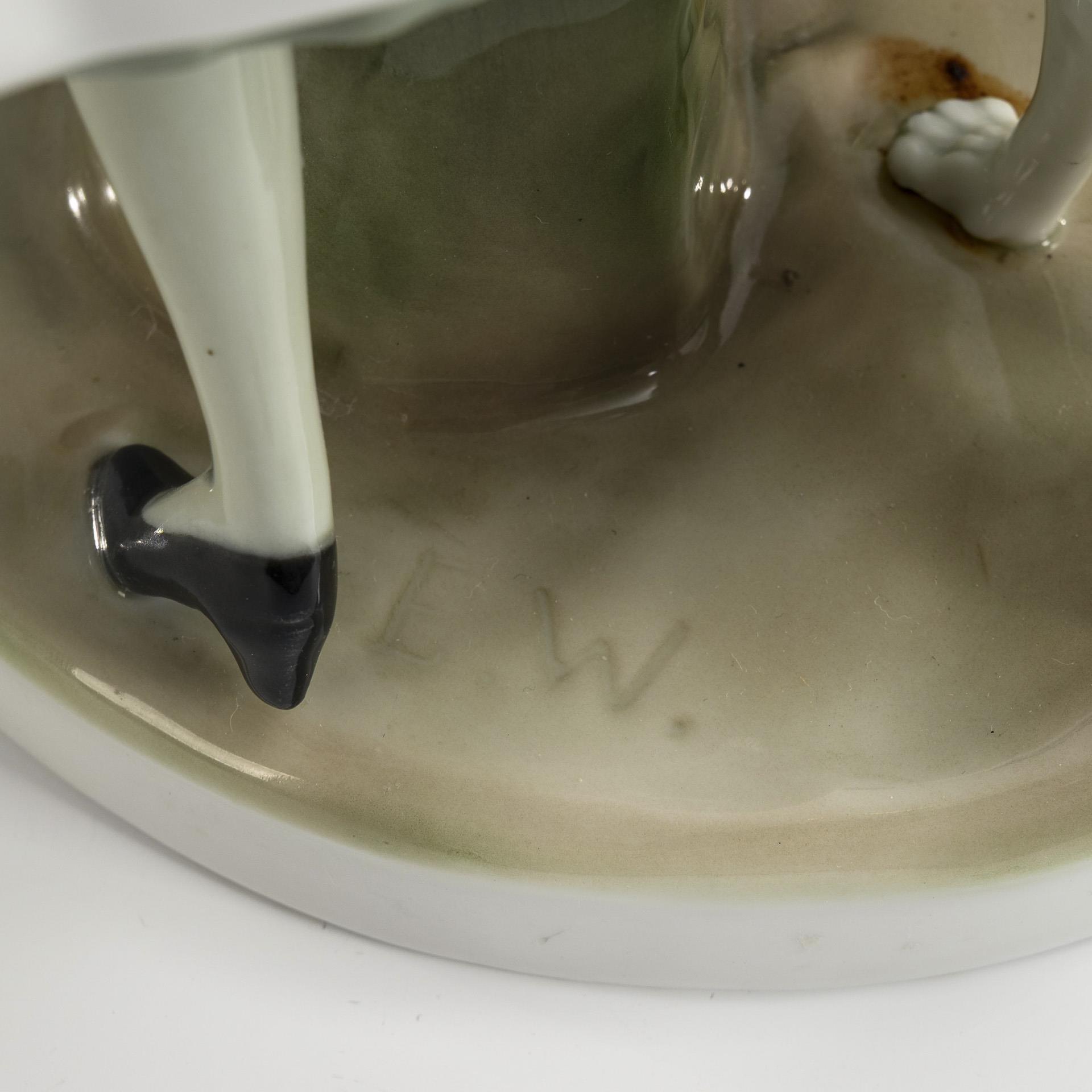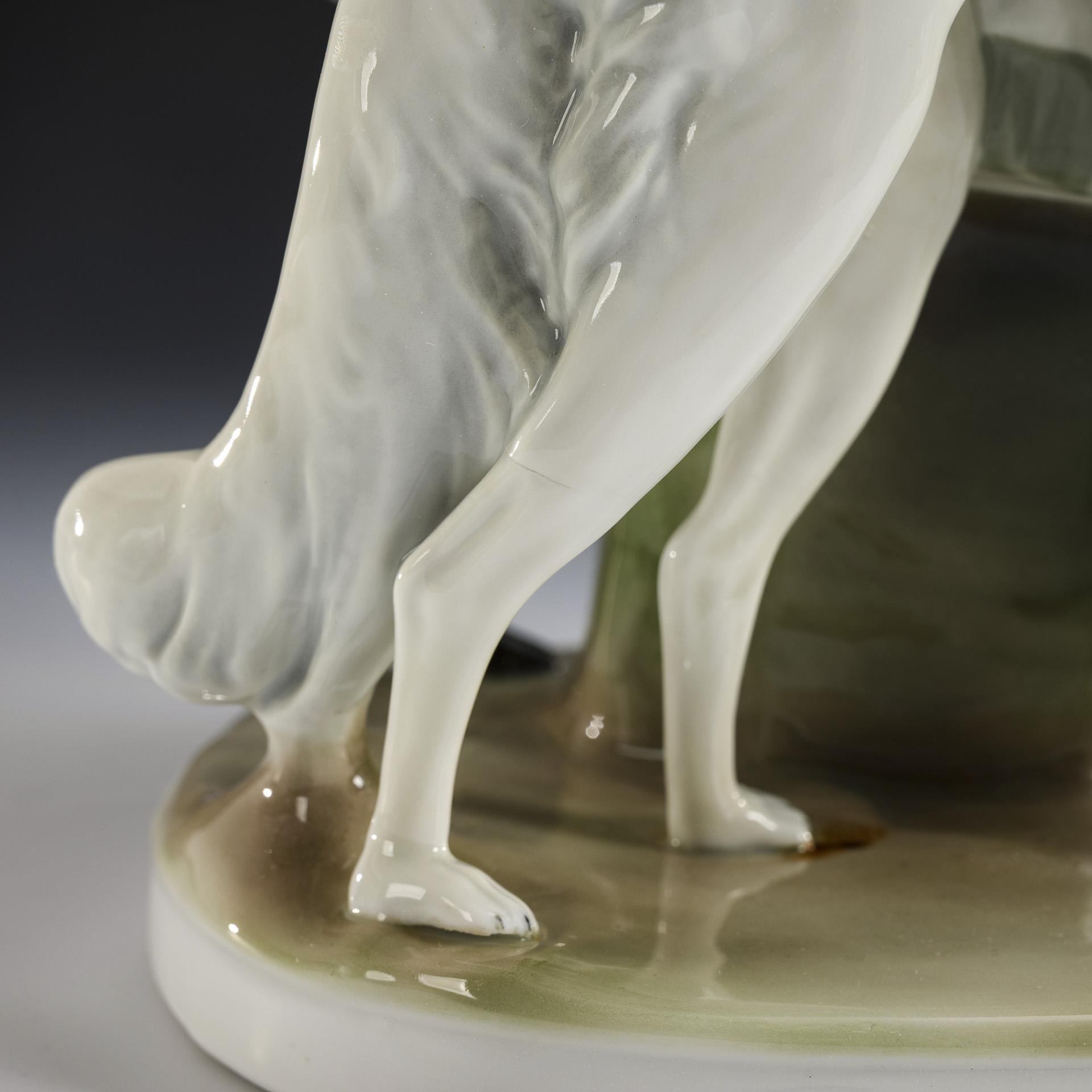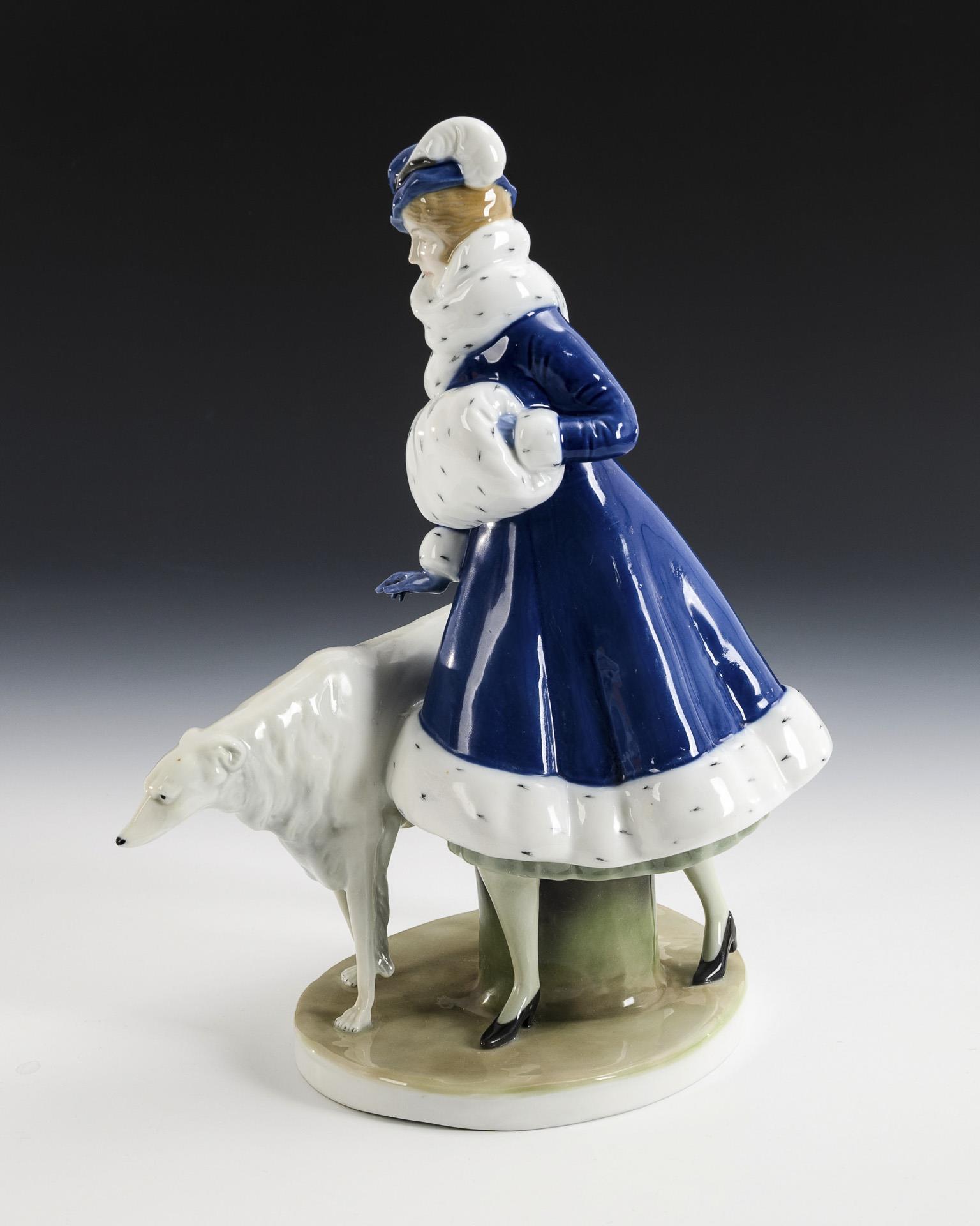 Auf einer Ovalplinthe laufende junge Dame mit Muff und Pelz, zu ihrer Linken ein Windhund laufend. Rechte Hand der Dame, Mantelsaum und rechte Schulter des Hundes restauriert.