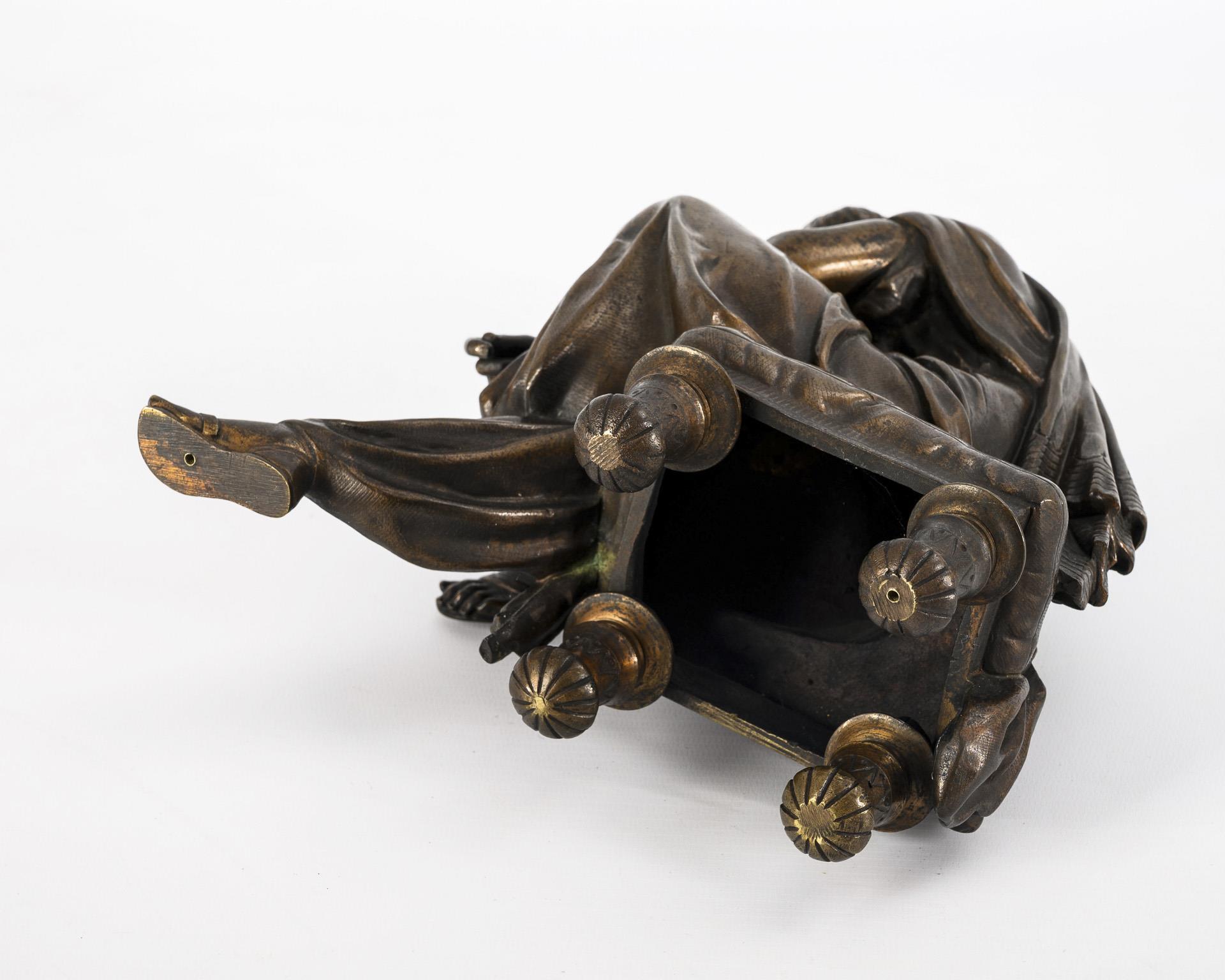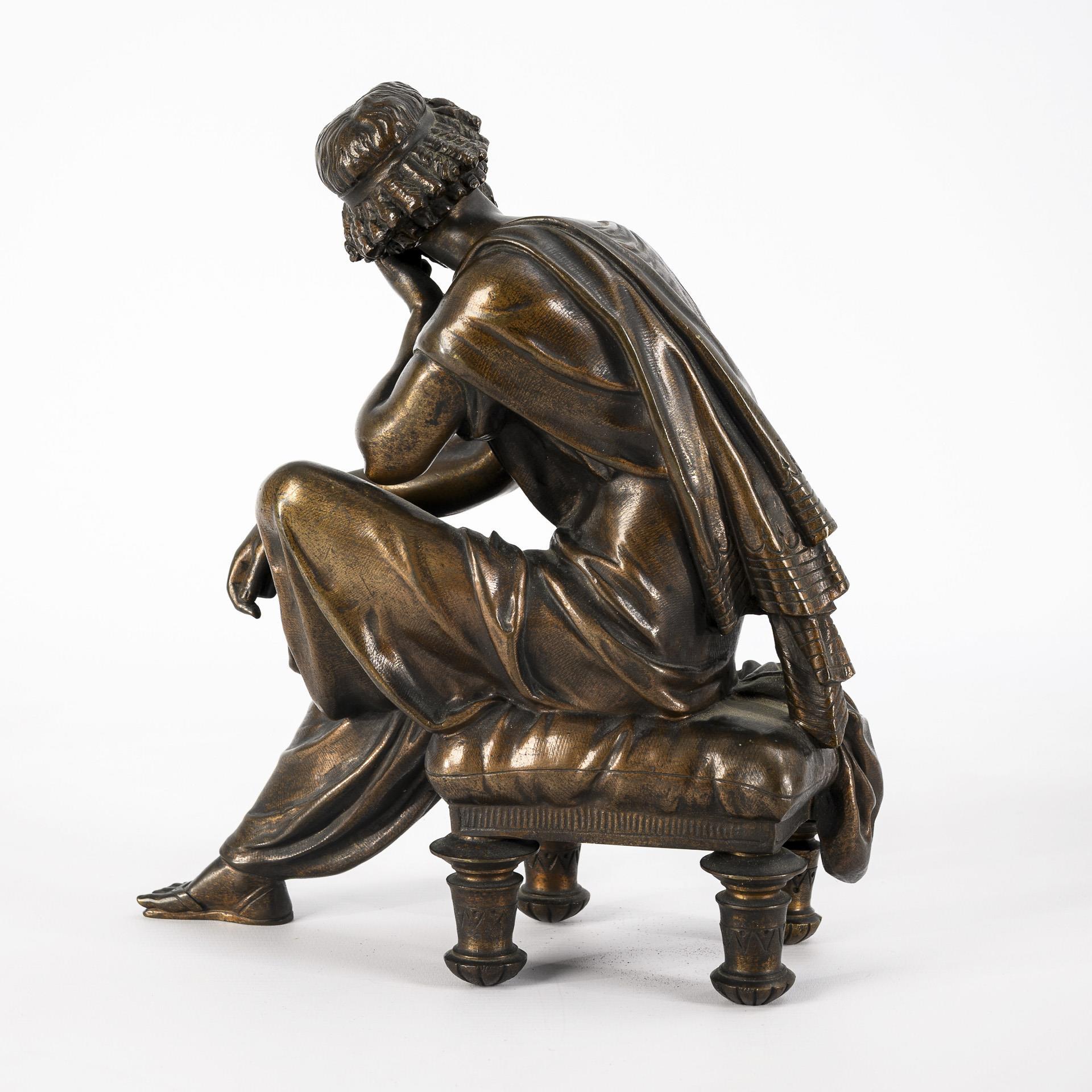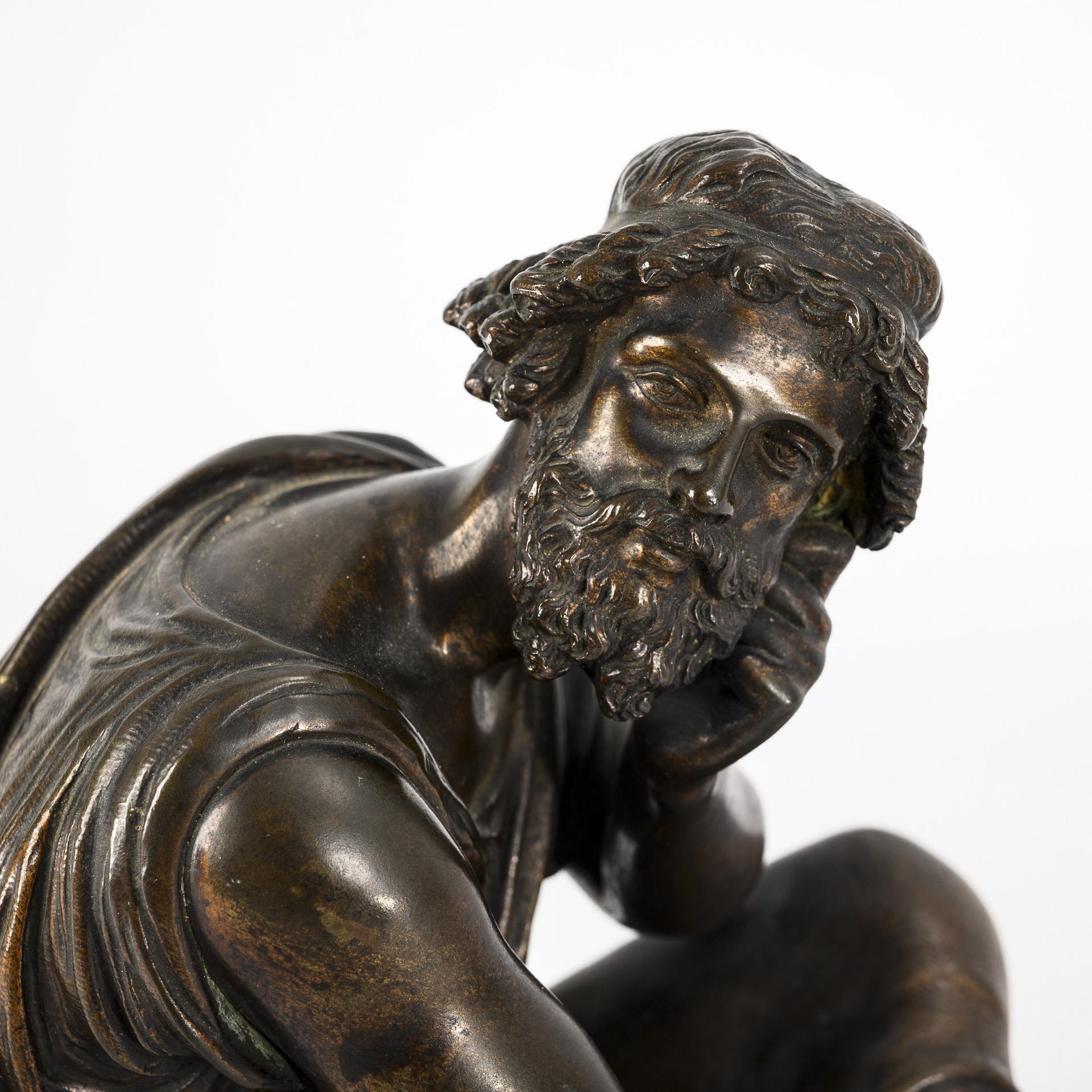 In nachdenklicher Pose sitzender bärtiger Mann mit Blick zur Seite. Patina etwas fleckig, Verschraubung eines Stuhlbeines gelockert.