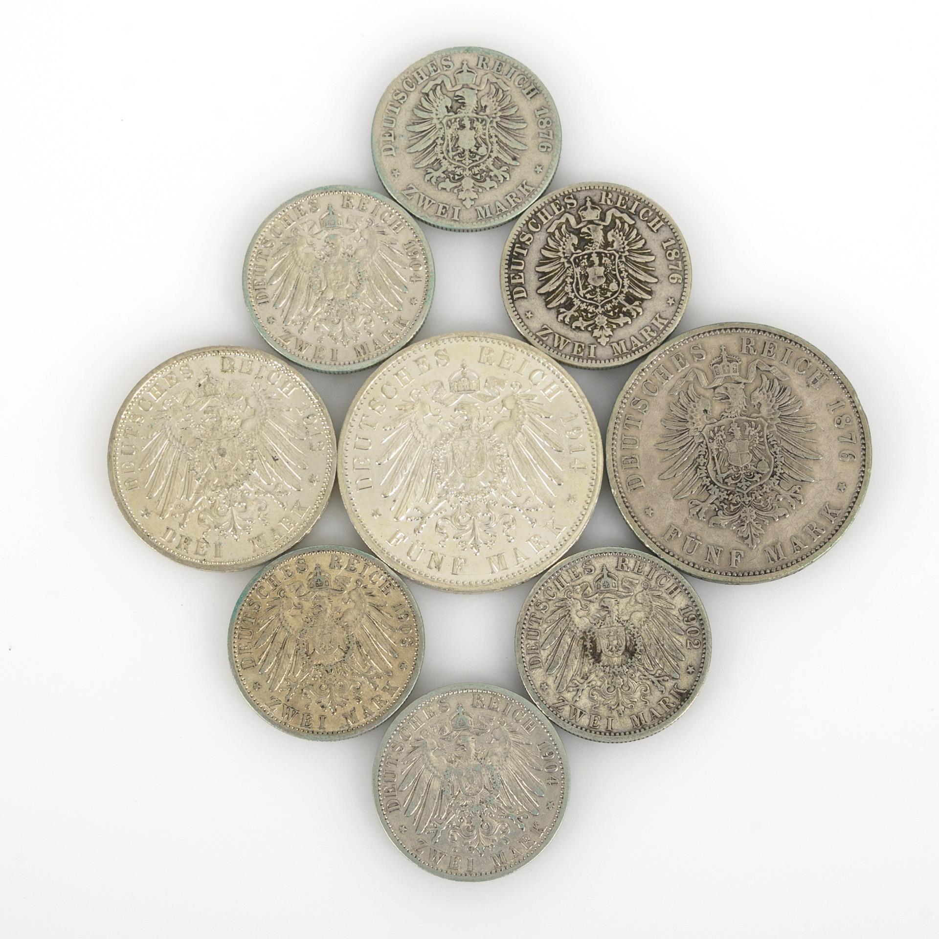 5 Mark 1876, "Wilhelm deutscher Kaiser König v. Preussen" / 5 Mark 1914, "Wilhelm II. Deutscher Kaiser König von Preussen", in Uniform. / "Wilhelm II. Deutscher Kaiser König v. Preussen" auf 3 Mark 1912; 2x 2 Mark 1904; 2 Mark 1908; 2 Mark 1902 / "Wilhelm Deutscher Kaiser König v. Preussen" auf 2 Mark 1876 und 2 Mark 1876, Münzort C. Sonst Alle Münzort A. Zustand: sehr schön.