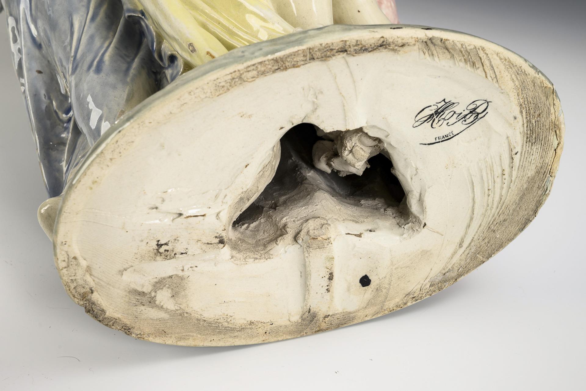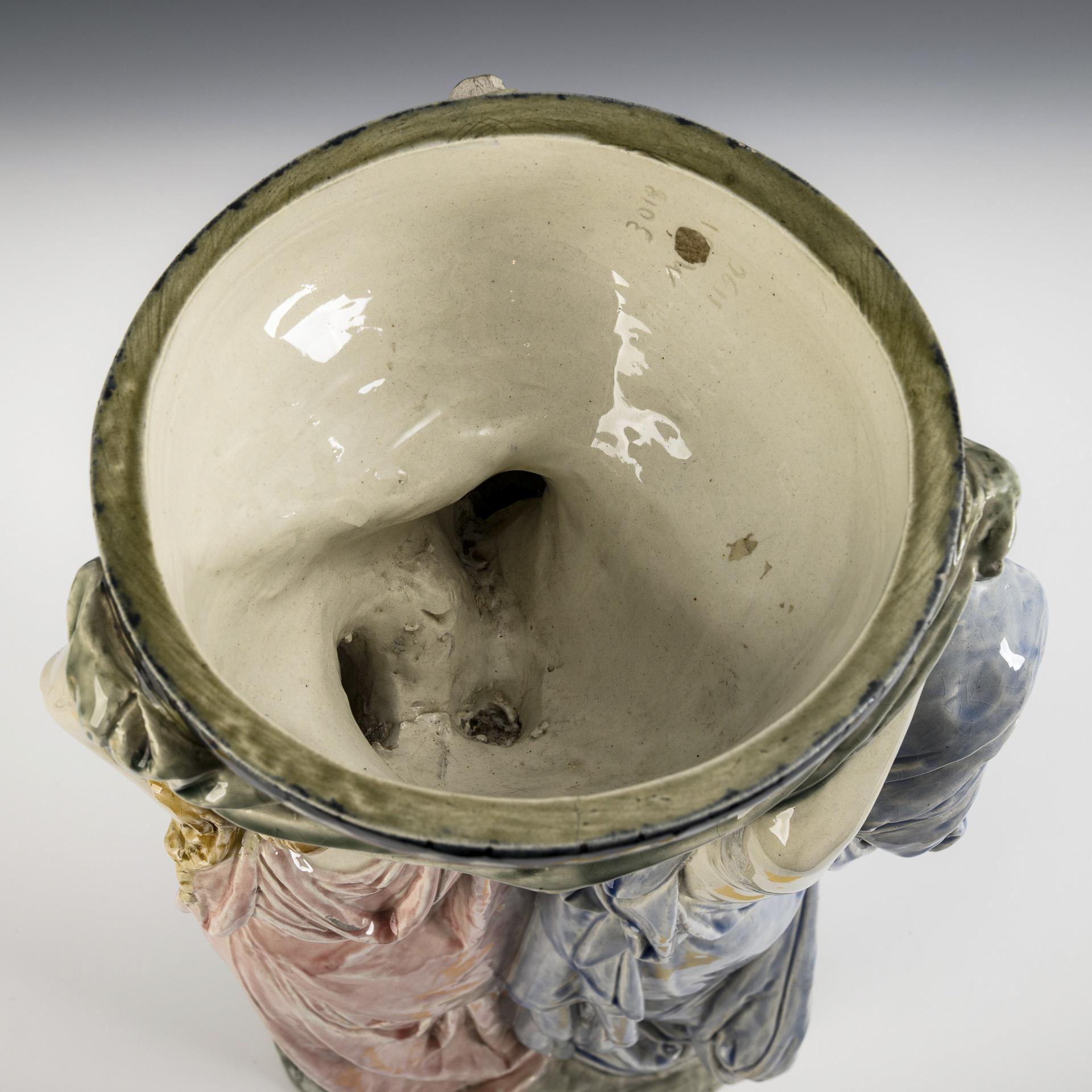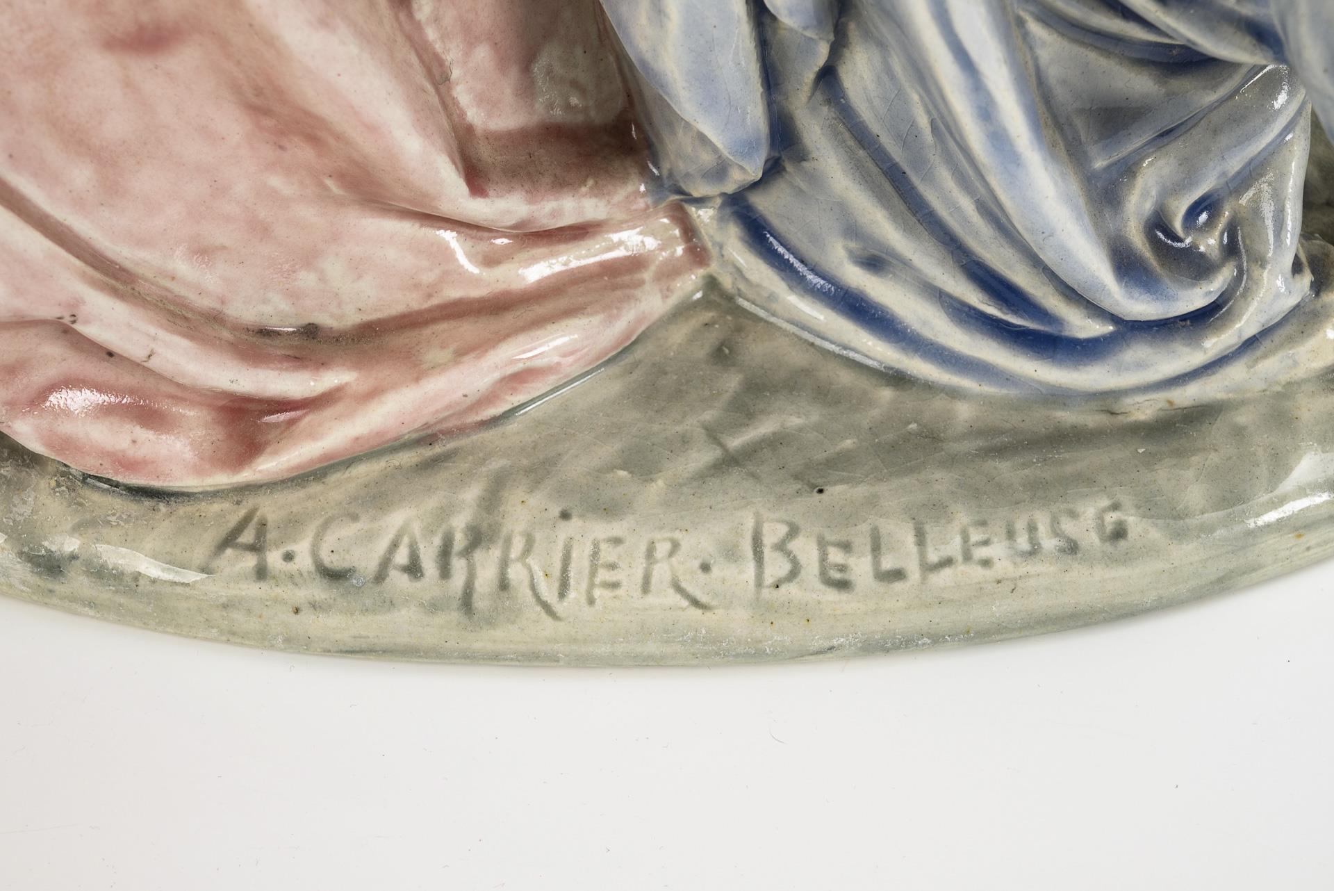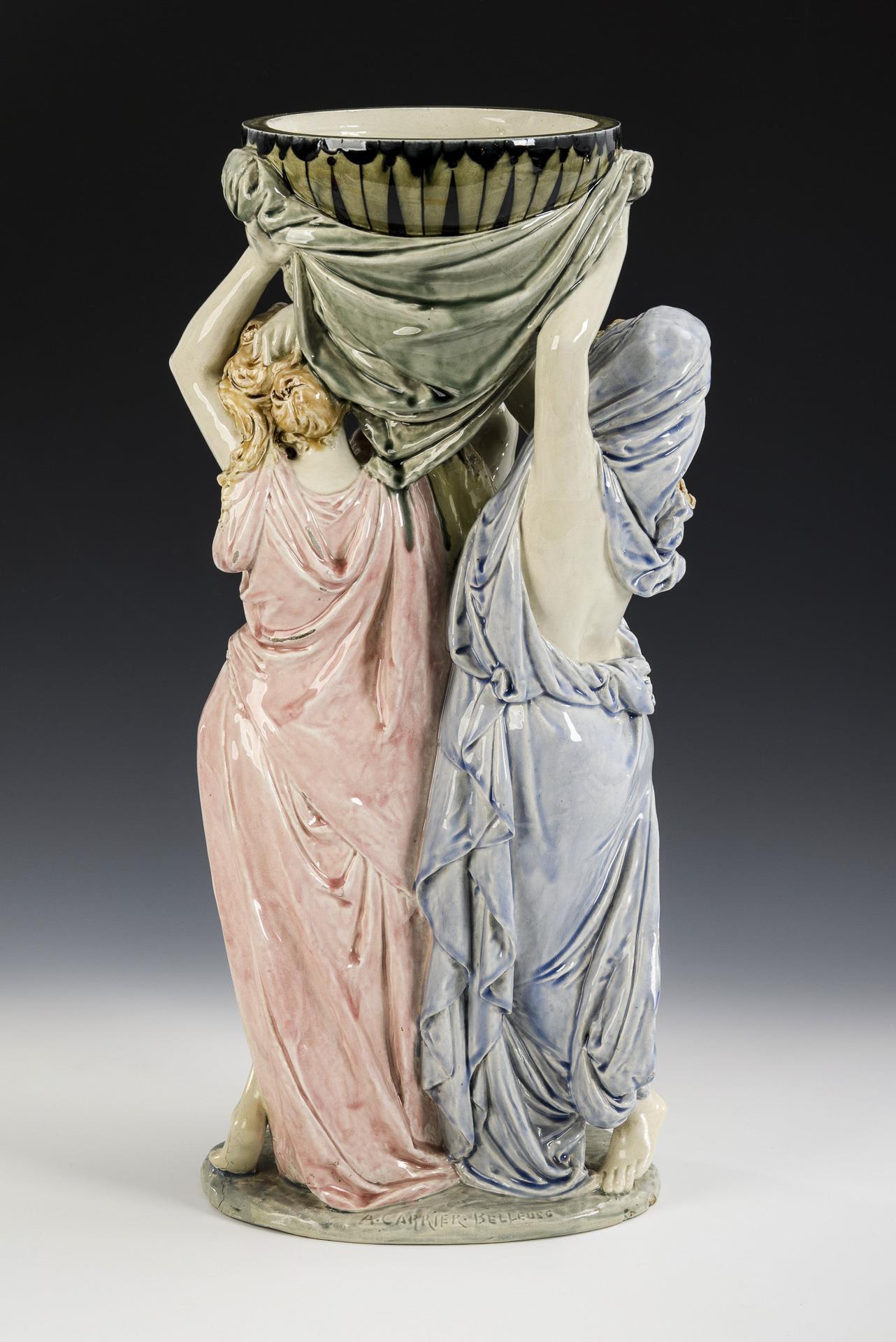 Choisy-le-Roi gehört seit etwa 1804 zu den bedeutenden Zentren der französischen Keramik-Herstellung, das die feinsten Majoliken Frankreichs produzierte und sich ein großes Renommee auf internationalen Ausstellungen verschaffte. Albert-Ernest Carrier-Belleuse (1824-1887 in Sèvres) war ein französischer Bildhauer und Zeichner. Er studierte ab 1840 bei Pierre Jean David d’Angers an der École des Beaux-Arts in Paris. Seit den 1850er Jahren führte er Marmorarbeiten, Bronzeskulpturen und Terrakottabüsten aus. Durch die malerische und naturalistische Behandlung nahmen sie einen höchst lebendigen Ausdruck an. Albert-Ernest Carrier-Belleuse galt als einer der erfolgreichsten dekorativen Bildhauer seiner Zeit und wurde der „Clodion des zweiten Kaiserreichs“ genannt (Claude Michel Clodion, 1738–1814). 1864 freundete er sich mit dem jungen Bildhauer Auguste Rodin an. Nach dem Waffenstillstand 1871 ging Carrier-Belleuse mit Rodin nach Brüssel, um unter seiner Mitarbeit und Assistenz öffentliche Aufträge anzunehmen. Von 1875 bis 1887 war er künstlerischer Direktor und Leiter des Ateliers der Manufacture royale de porcelaine de Sèvres in Sévres. Albert-Ernest Carrier-Belleuse war der Vater des Bildhauers Louis-Robert Carrier-Belleuse (1848–1913), der unter Hippolyte Boulenger 1889 zum künstlerischen Leiter der Faiencerie von Choisy-le-Roi wurde. Vgl. Wikipedia.