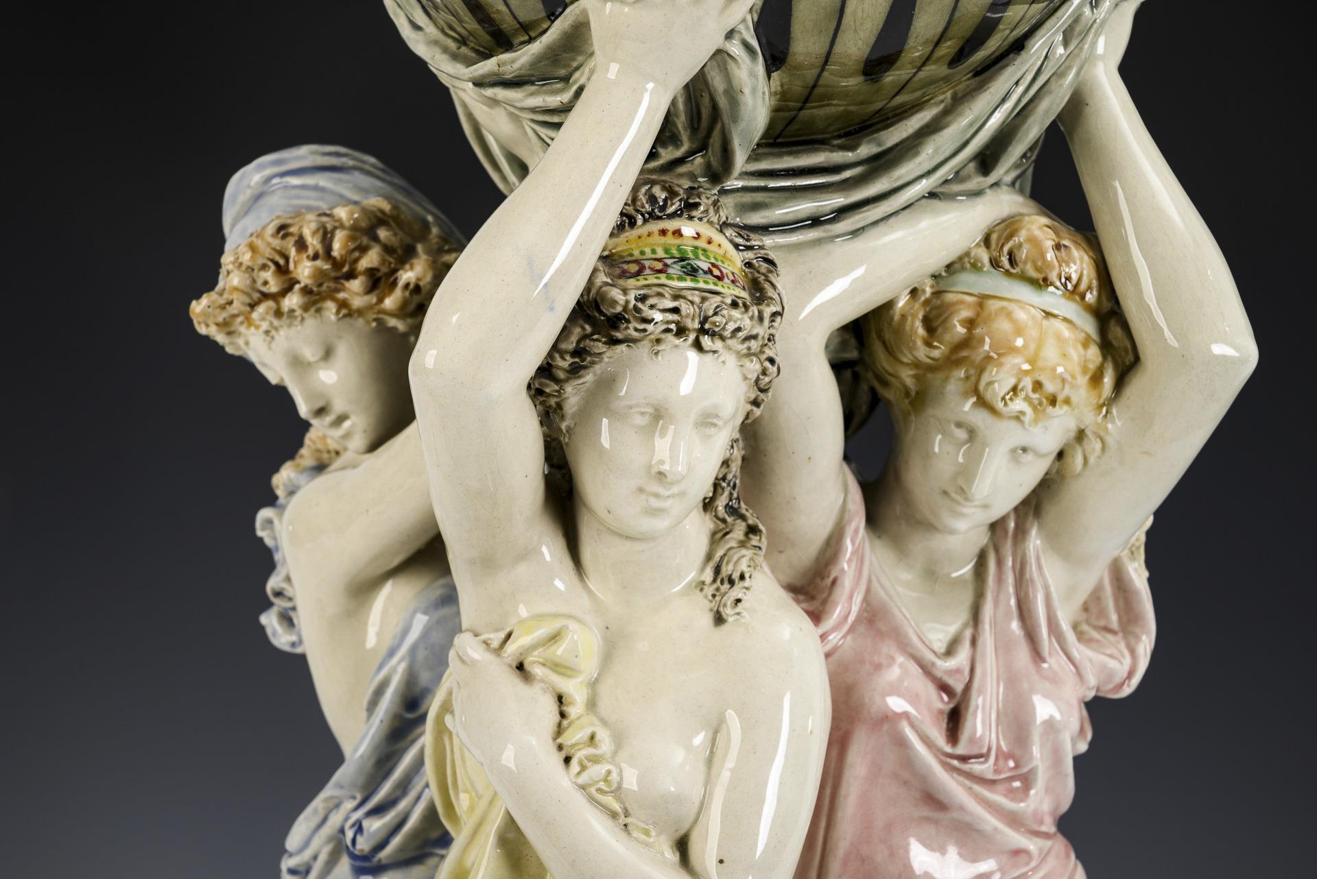 3 elegante Frauen in klassizistischen Gewändern, die 1 große Schale halten, auf Ovalsockel. Am Sockel restauriert, partiell kleine Glasurfehlstellen, in der Schale fein rissig.