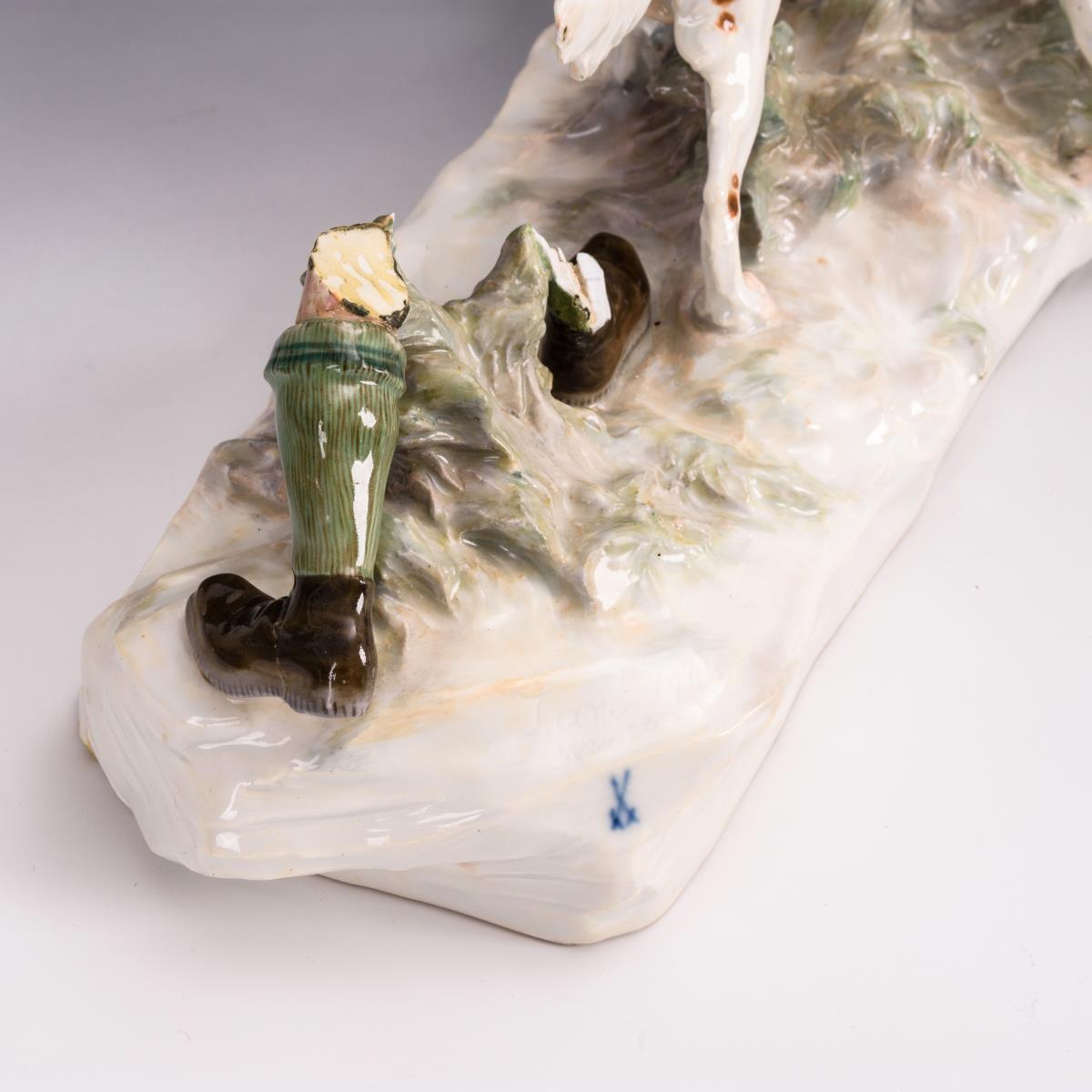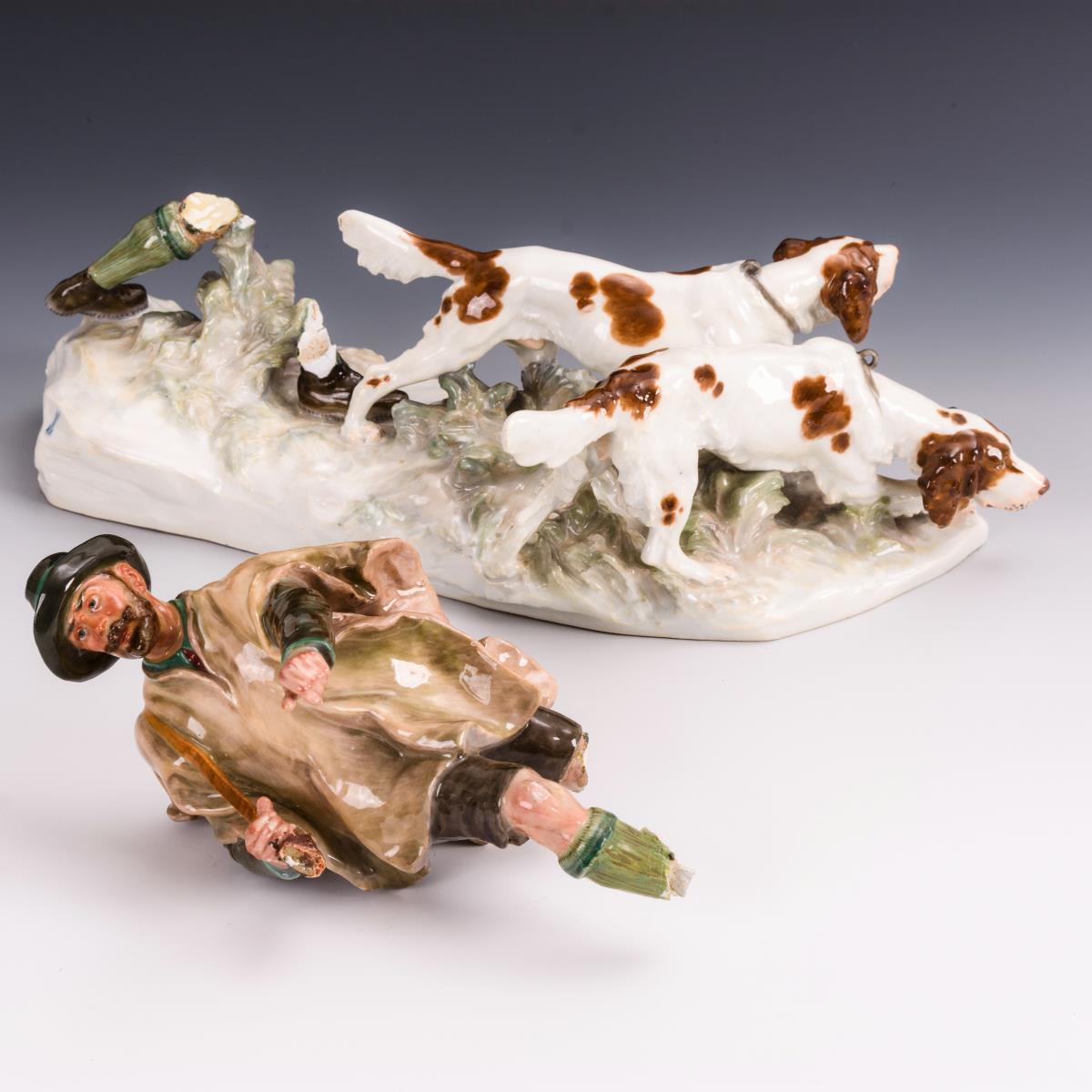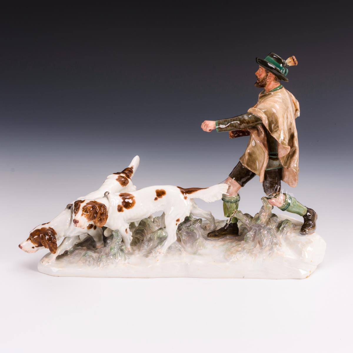 Restaurierungsbedürftige Gruppe eines über einen Grassockel laufenden, zwei Hunde an der Leine führenden Jägers. Jäger abgebrochen (lose), Gewehr restauriert und defekt, Gamsbart am Hut geklebt.