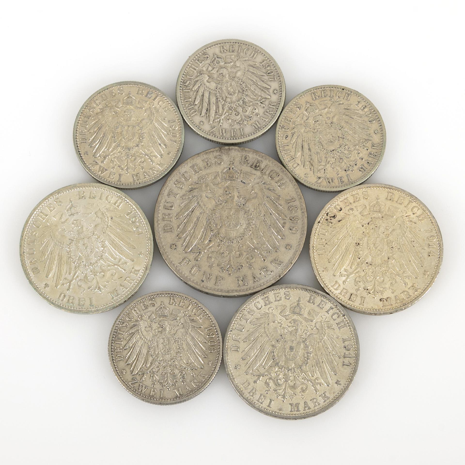 "Freie und Hansestadt Hamburg": 5 Mark 1899; 3 Mark 1911, Münzort J. / "Wilhelm II. Koenig von Württemberg": 3 Mark 1911; 2 Mark 1907; 2 Mark 1900. / 3 Mark 1914, "Friedrich II. Grossherzog von Baden", 2 Mark 1907, "Friedrich Grossherzog von Baden"; 2 Mark 1906, "Friedrich und Luise von Baden 1856 - 1906". Zustand: sehr schön.