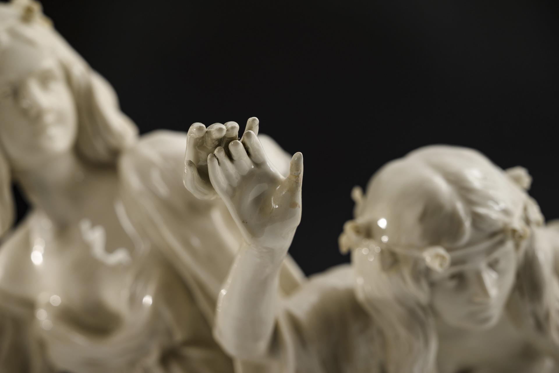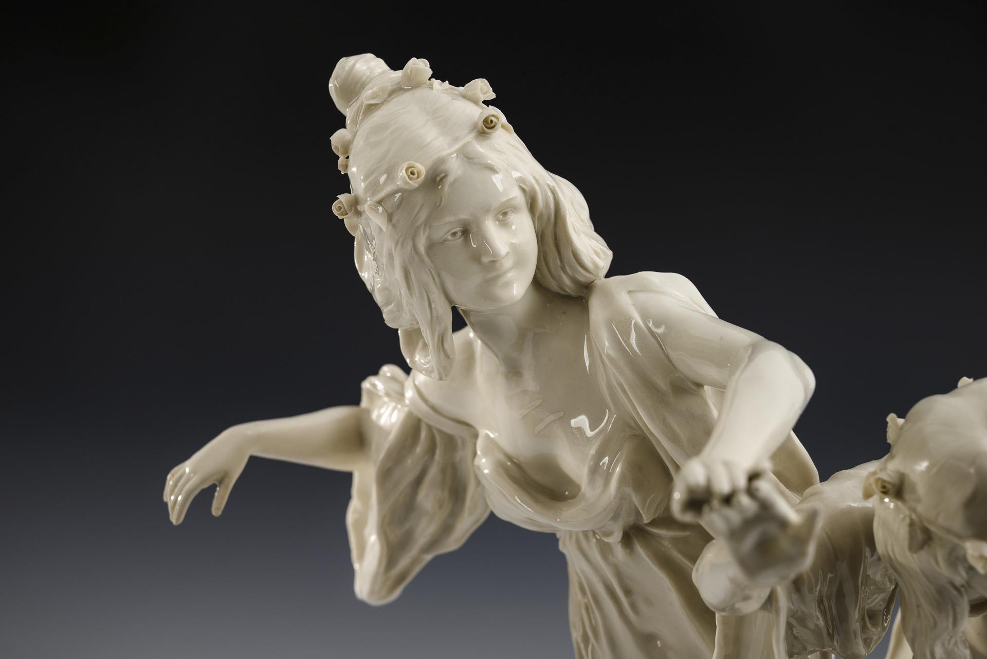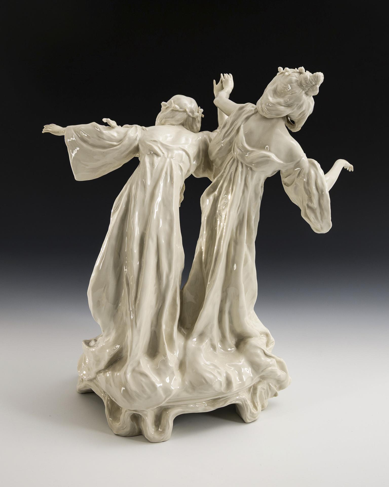 Ausdrucksvoll gestaltete Plastik zweier junger Frauen in wallenden Kleidern und mit Rosenkränzen im Haar, auf einem Sockel mit Frauenkopffüßen. Hände restauriert, 1 Finger geklebt.