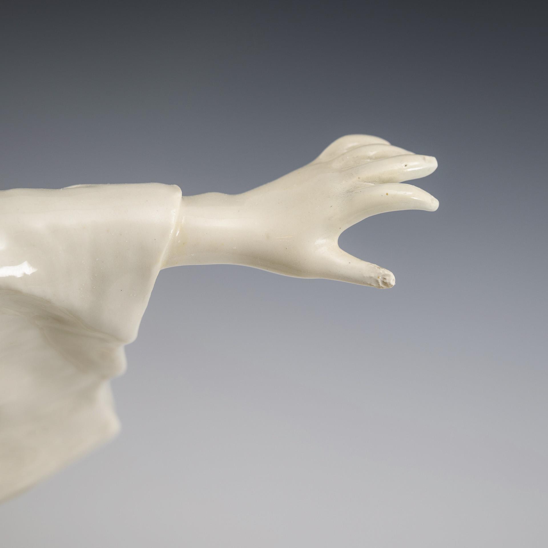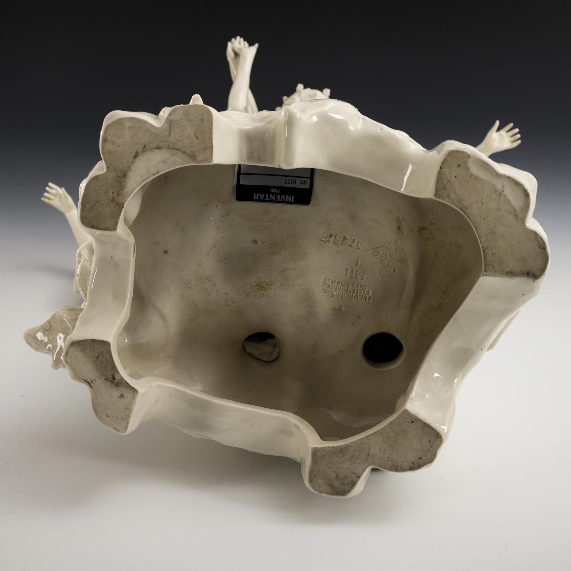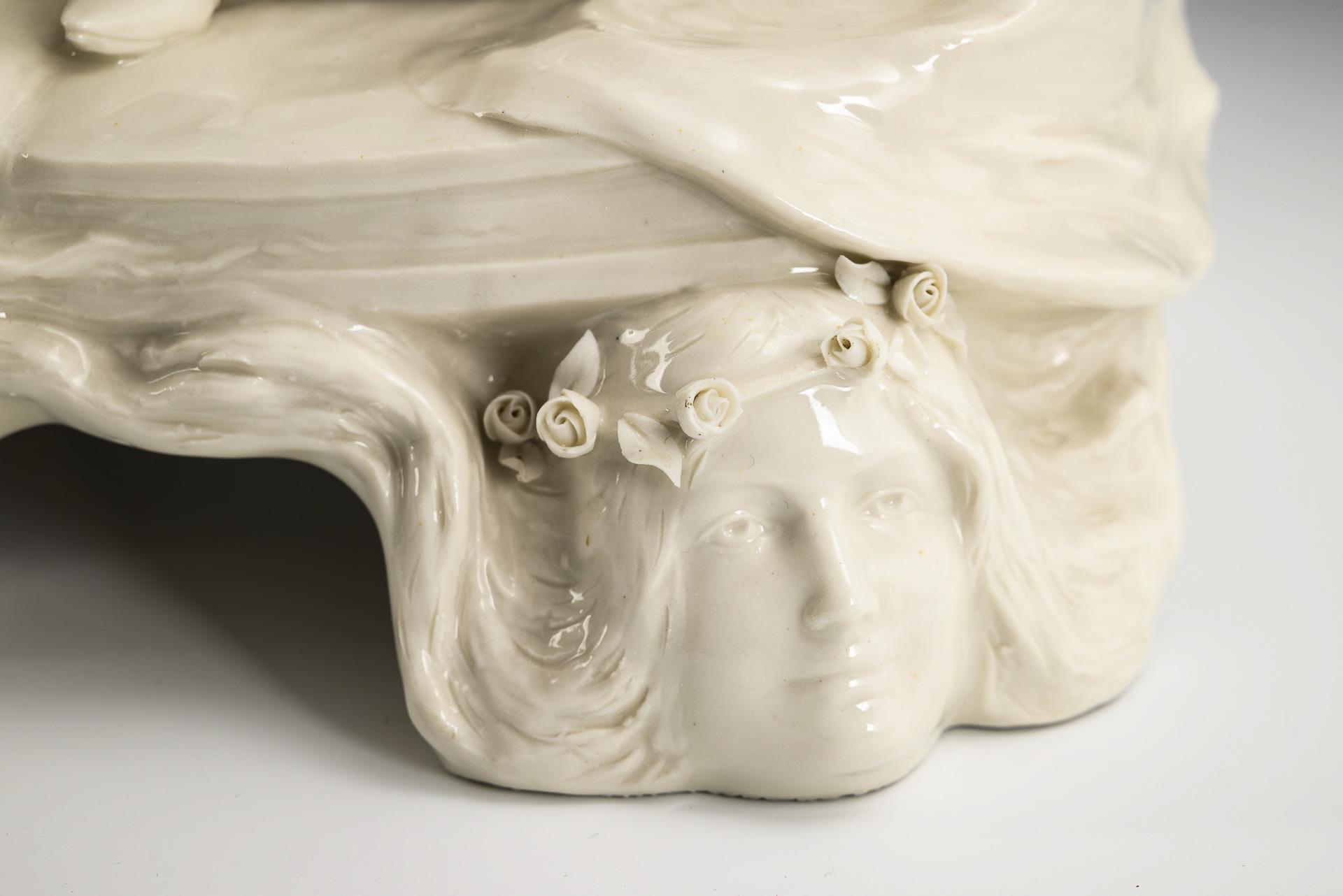 Ausdrucksvoll gestaltete Plastik zweier junger Frauen in wallenden Kleidern und mit Rosenkränzen im Haar, auf einem Sockel mit Frauenkopffüßen. Hände restauriert, 1 Finger geklebt.