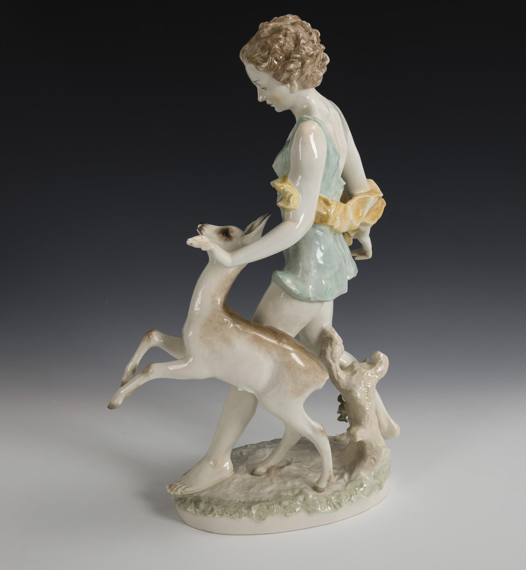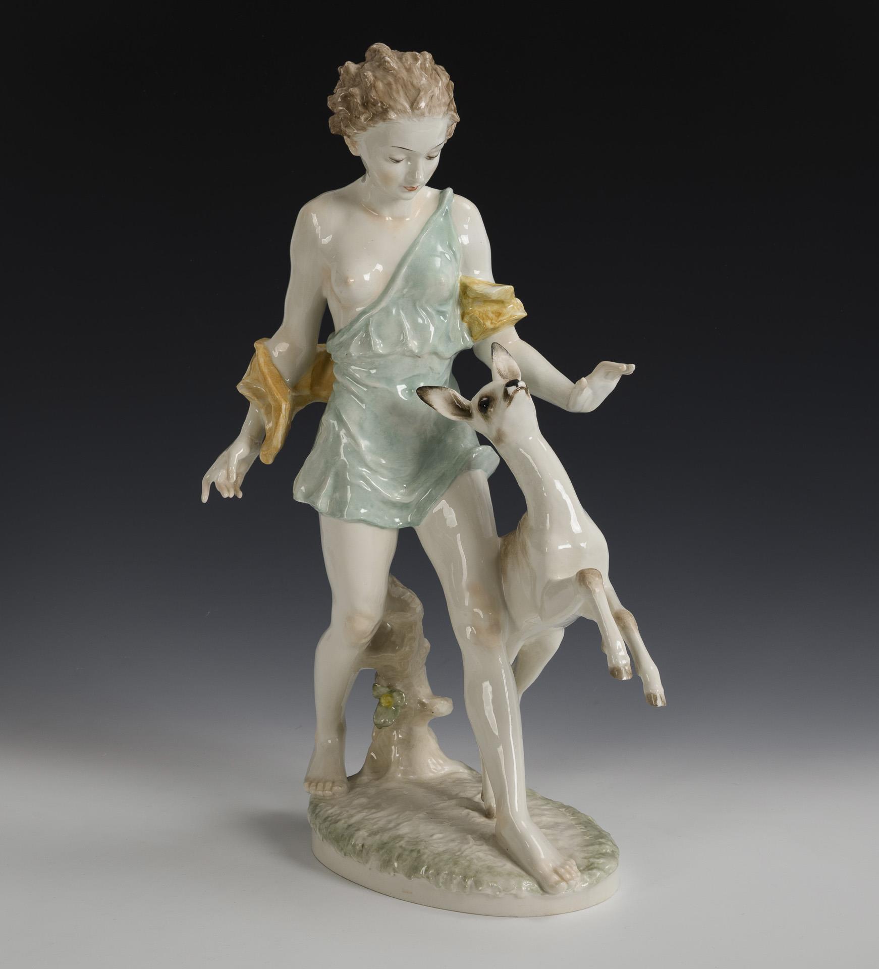 Auf einem Natursockel laufende junge Frau mit Rehkitz. Linker Arm und rechte Hand restauriert.
