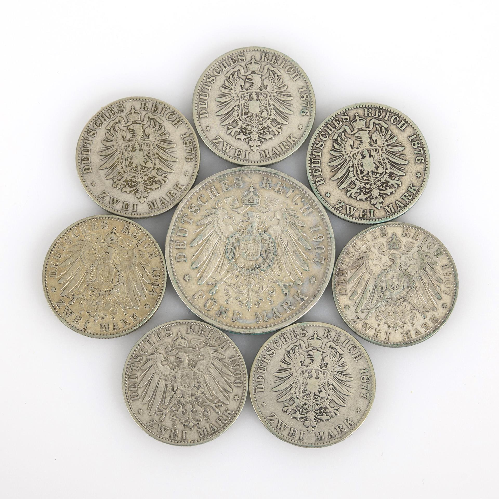 5 Mark 1907, "Otto Koenig von Bayern" / 2 Mark 1907, "Otto Koenig von Bayern". / 2 Mark 1876, "Ludwig II Koenig v. Bayern" / "Albert Koenig von Sachsen": 5x 2 Mark, 2x 1876, 1877, 1900, 1904. Zustand: sehr schön.