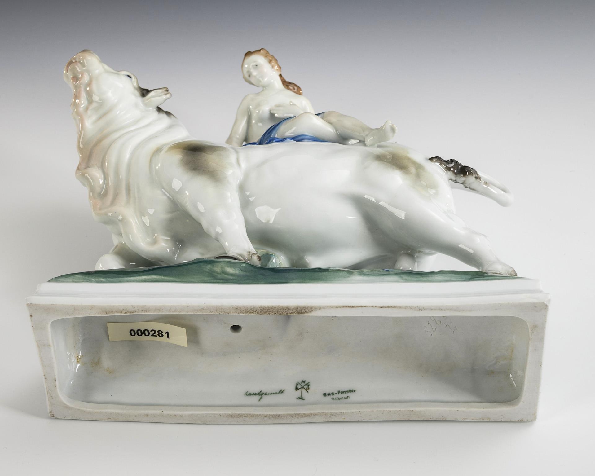 Auf einem Natursockel stehender Stier, eine junge Frau als Europa auf dem Rücken tragend.