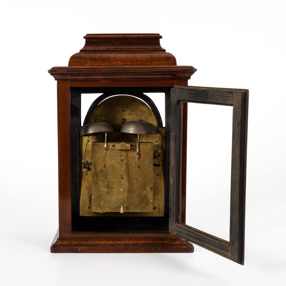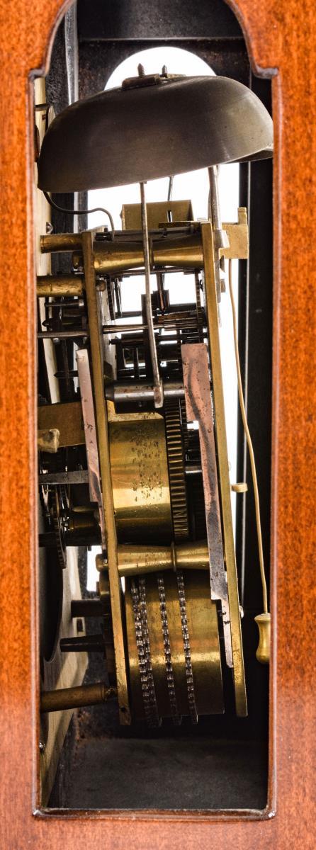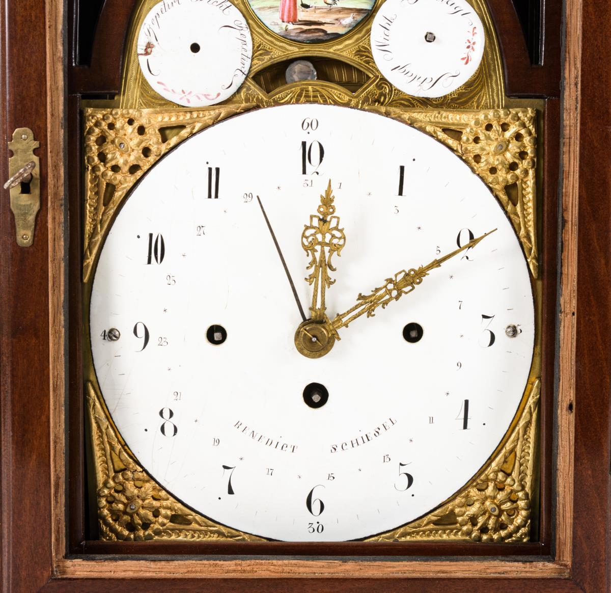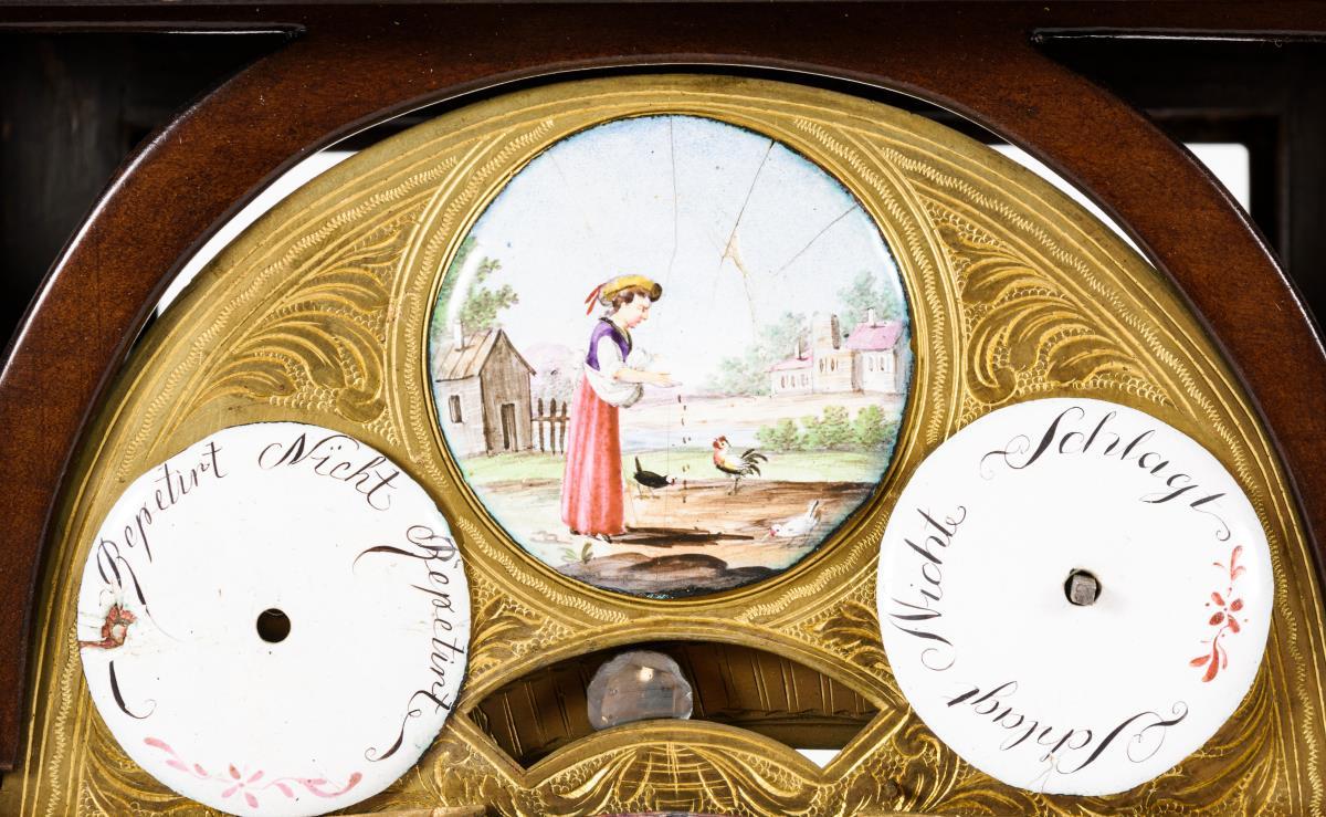 Weißes Emailzifferblatt mit arabischen Zahlen, Minutenkranz, Datumsanzeige und durchbrochenen Zeigern. Bogenfeld mit Sichtpendel und einer farbig gemalten Emailplakette mit Bäuerin beim Füttern der Tiere. Herstellerprägung Anzeige: Benedict Schiesel.
