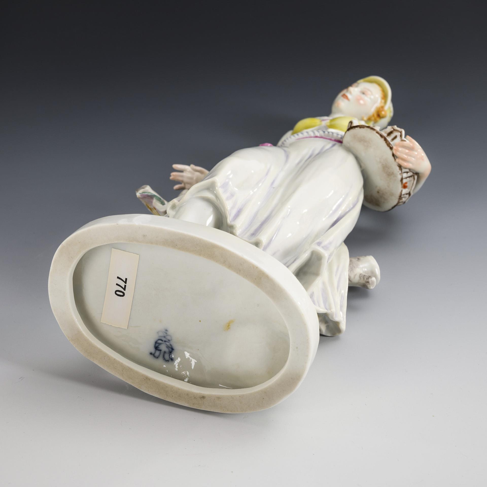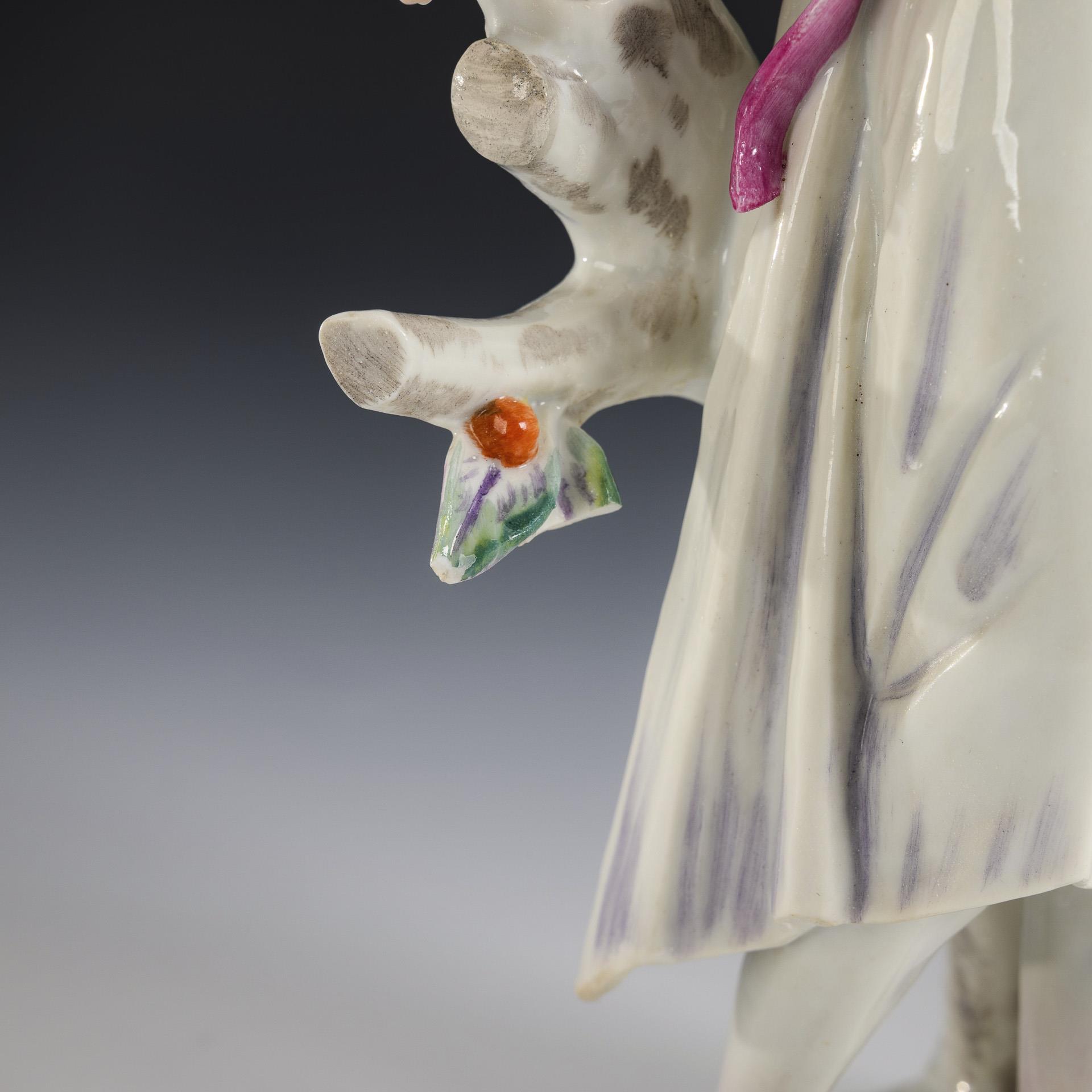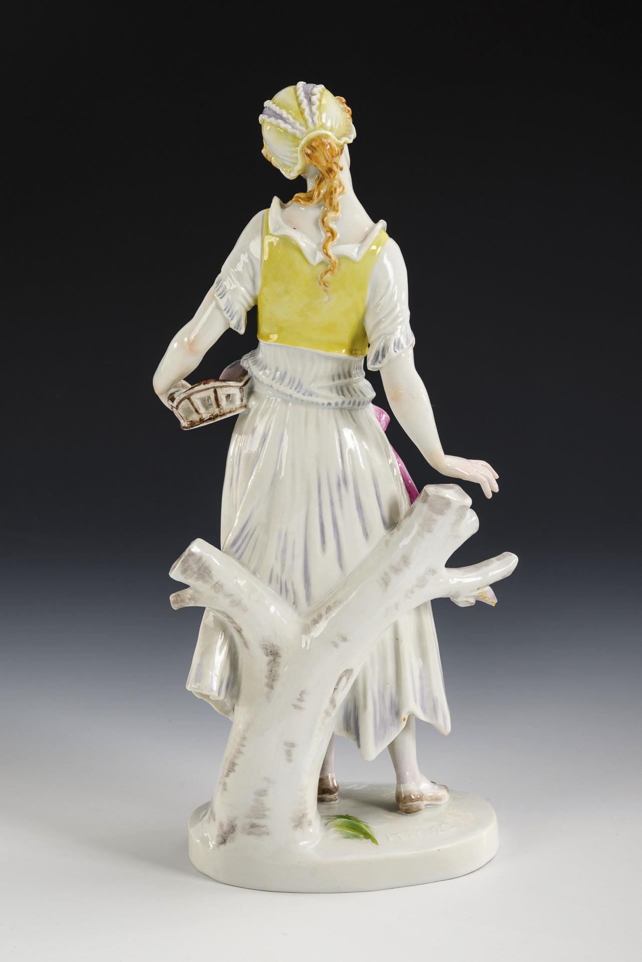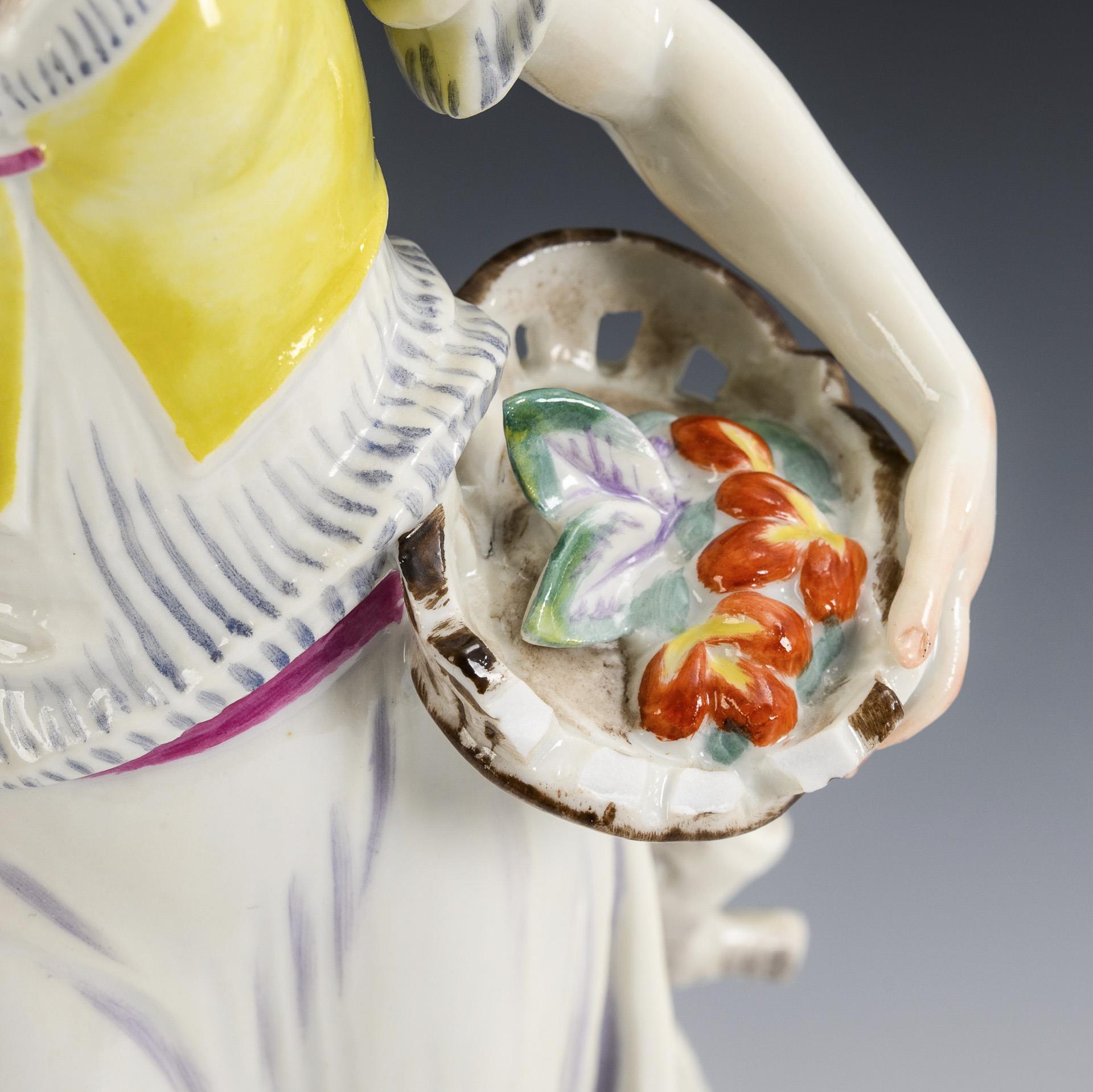 Auf einer Ovalplinthe stehende junge Frau mit Früchtekorb. Rechte Hand restauriert, Korb bestoßen, Chips am Sockelrand.