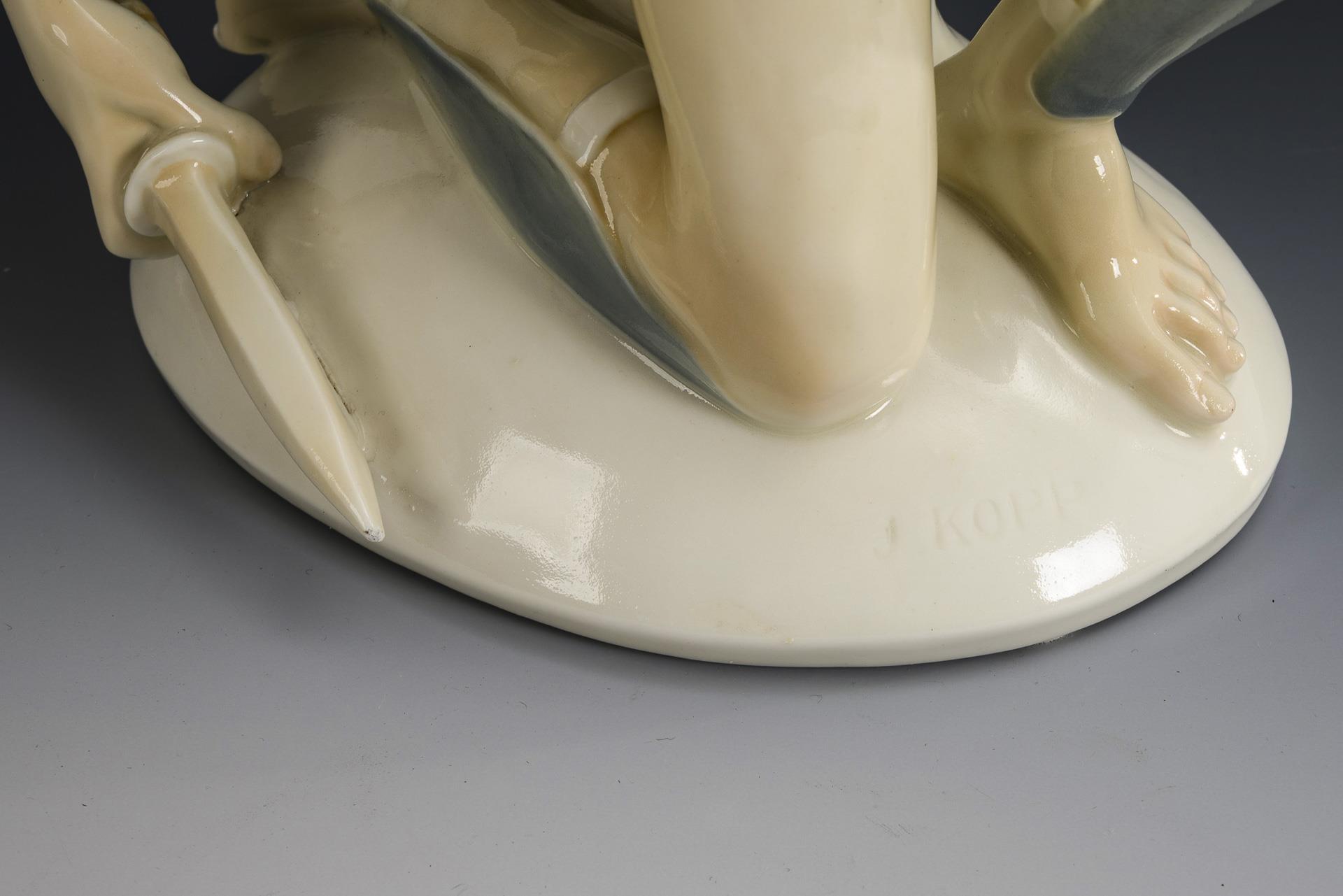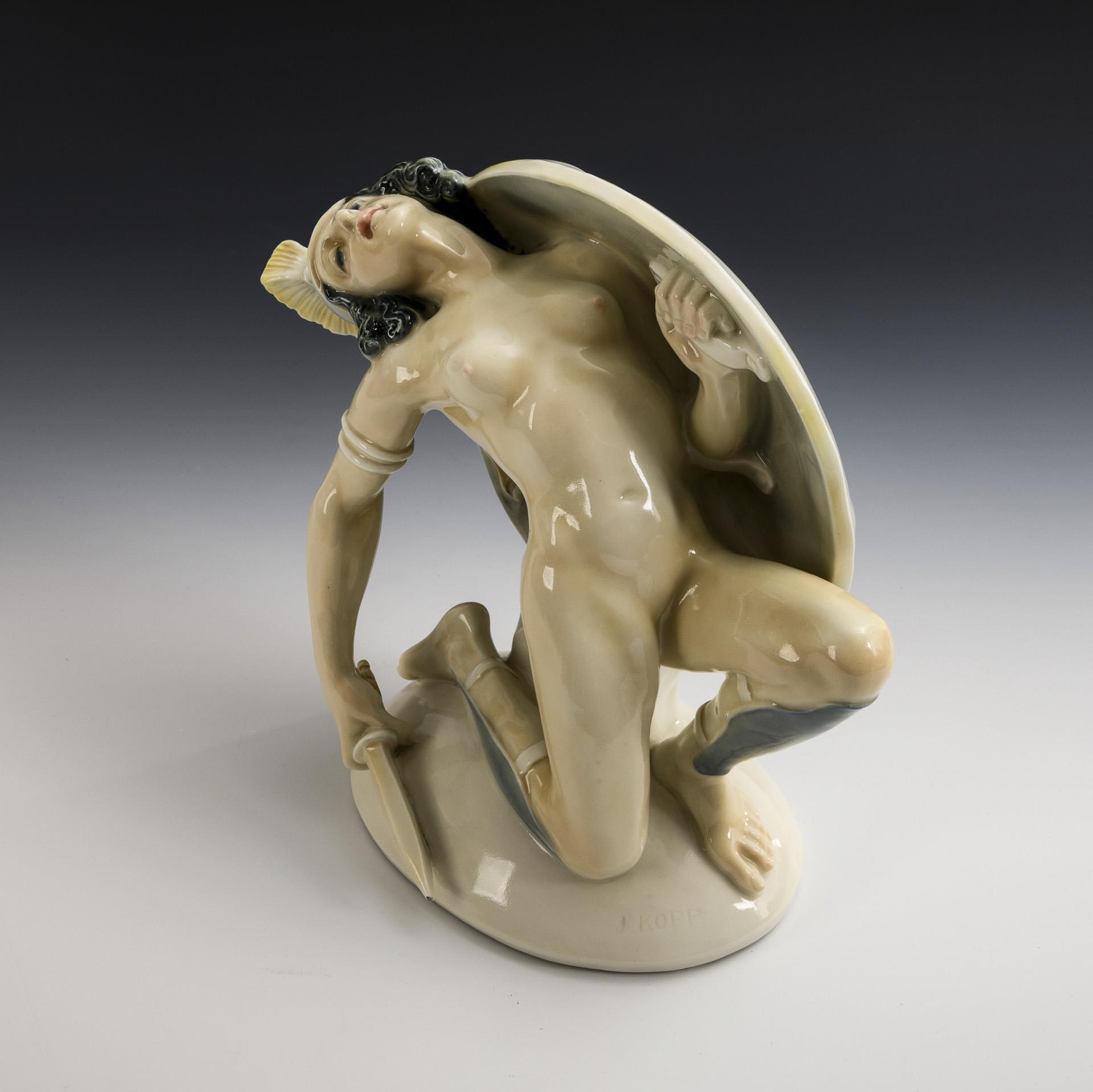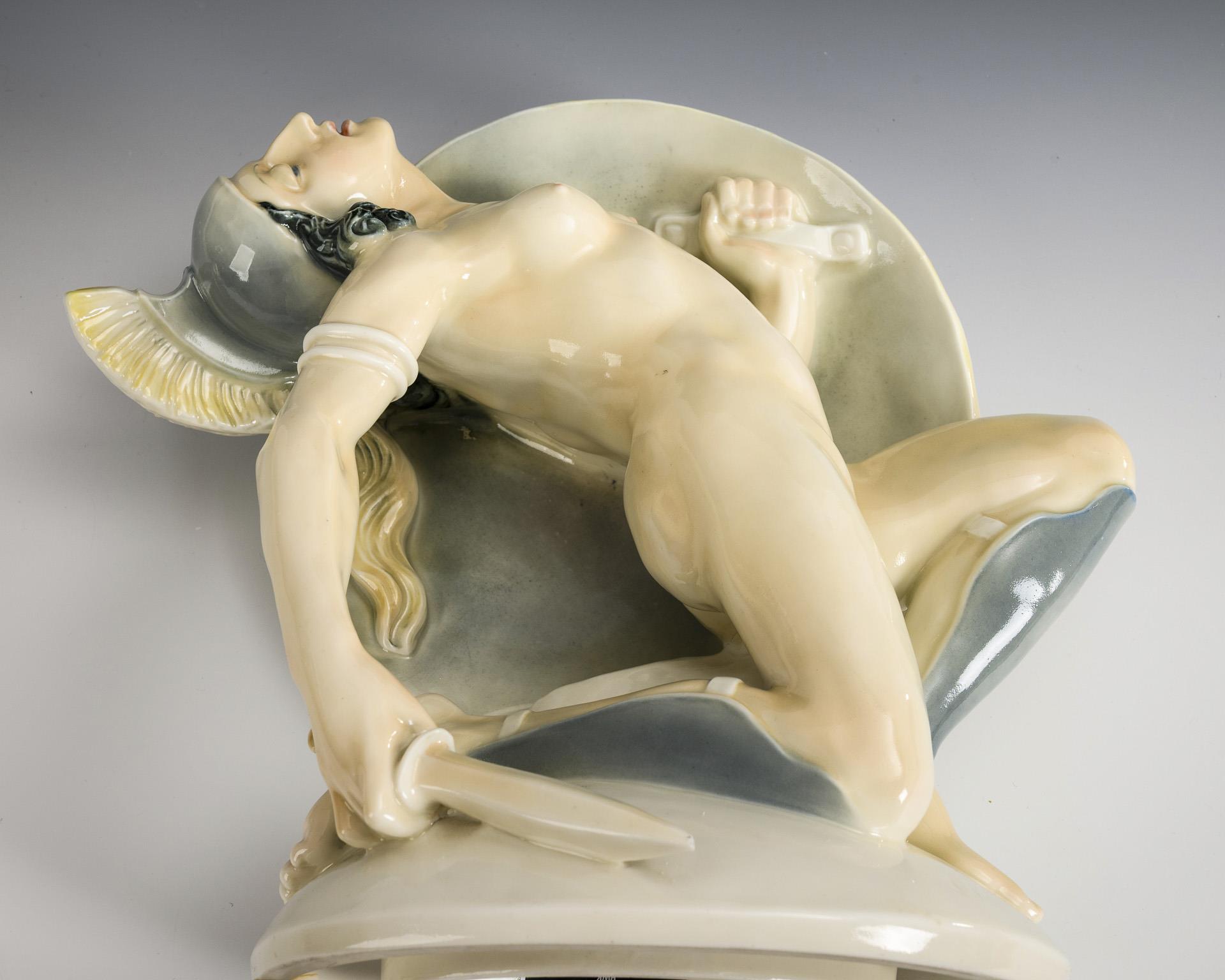 Auf einem Ovalsockel kniender Frauenakt mit Schild, Dolch und Helm. Dolchspitze bestoßen, verso Stützspur am Haar.