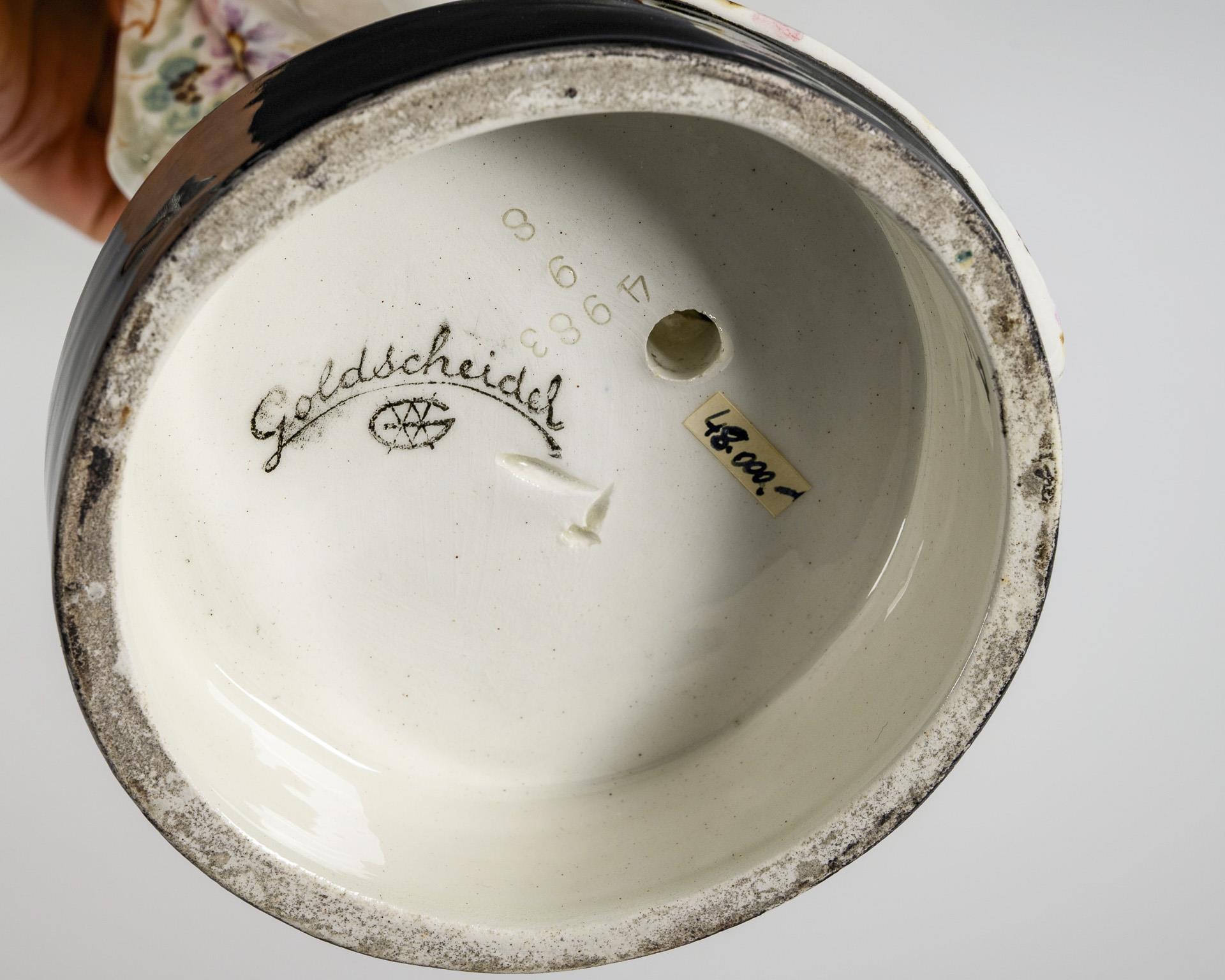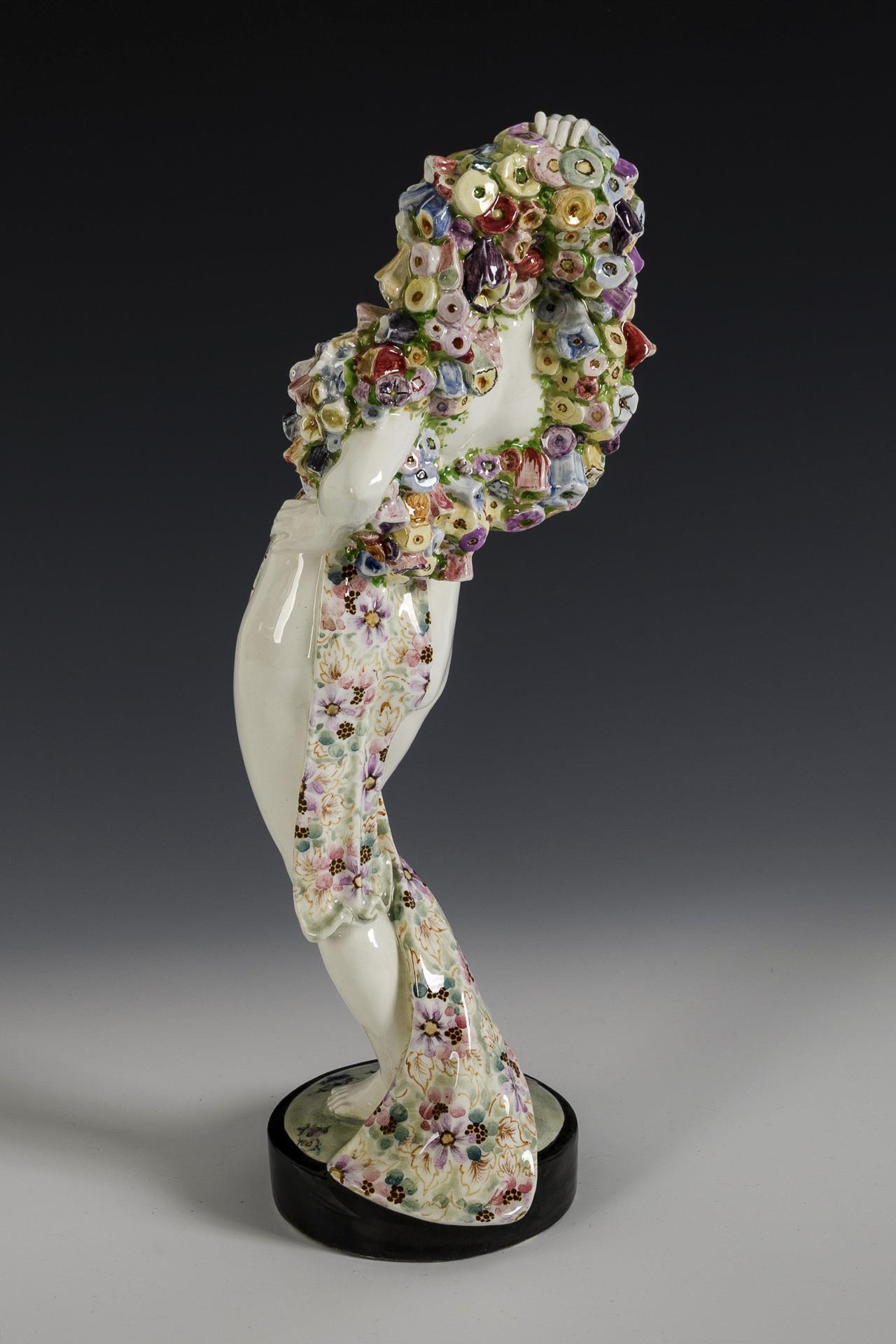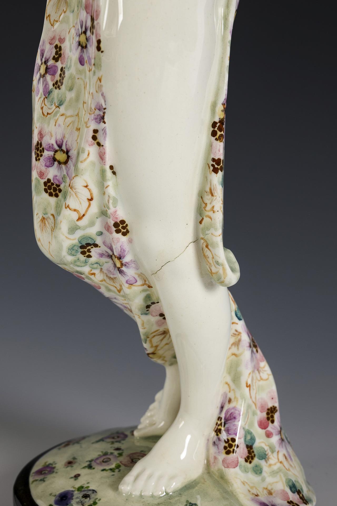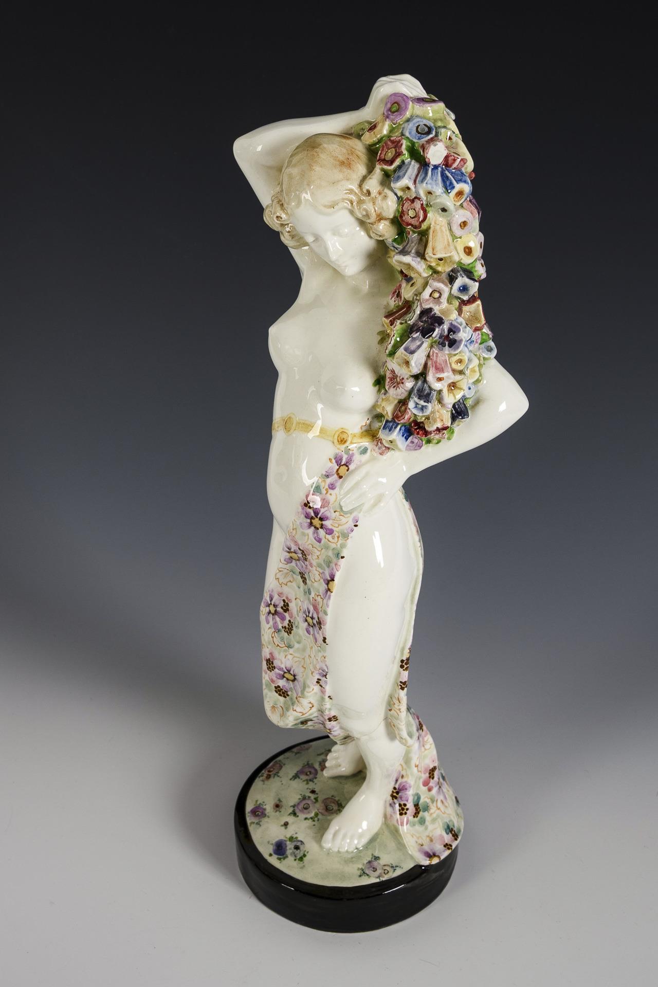 Stehender Frauenakt mit Blütengirlande, auf schwarzem Rundsockel. Brandriss am linken Knie, partiell Glasurchips.