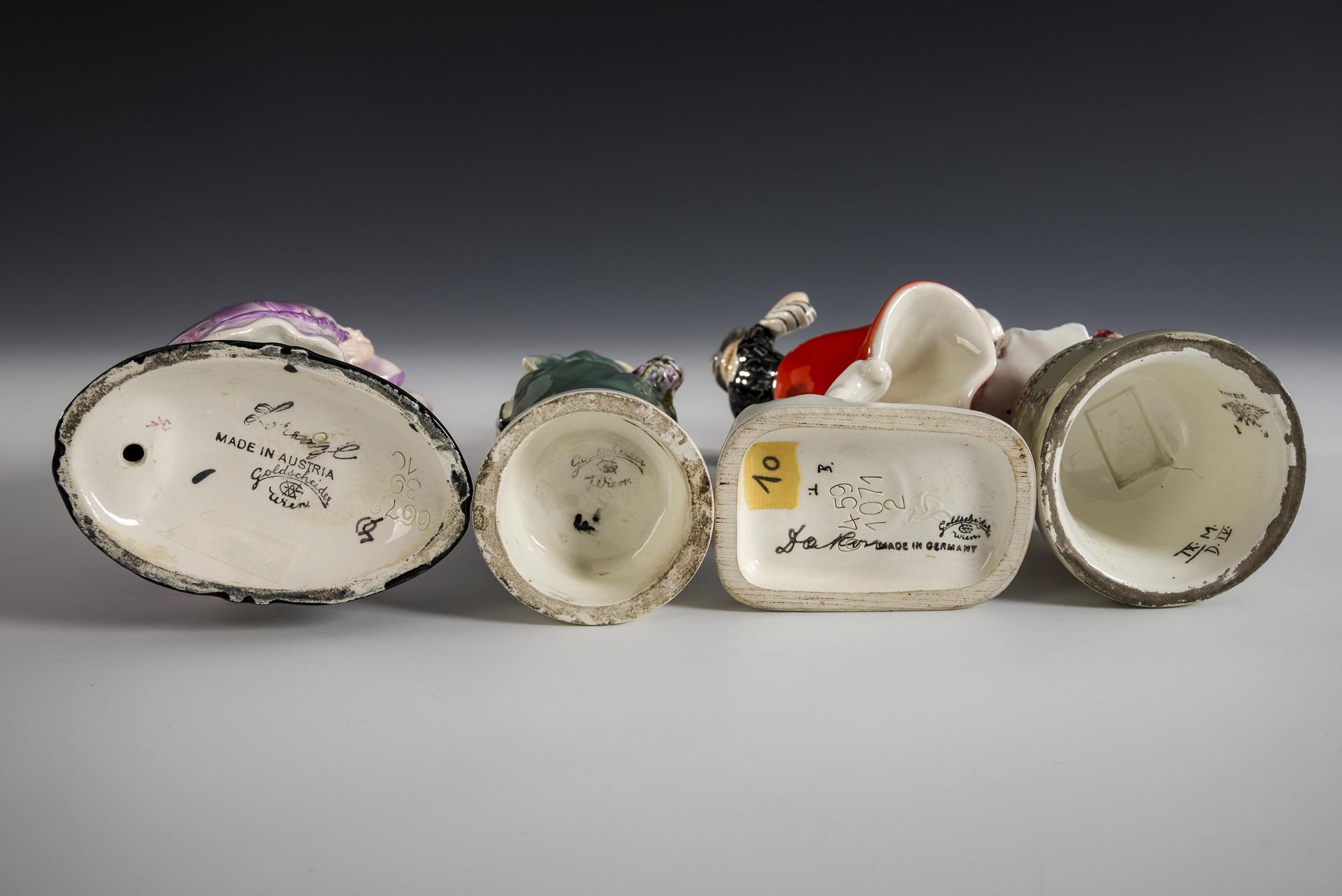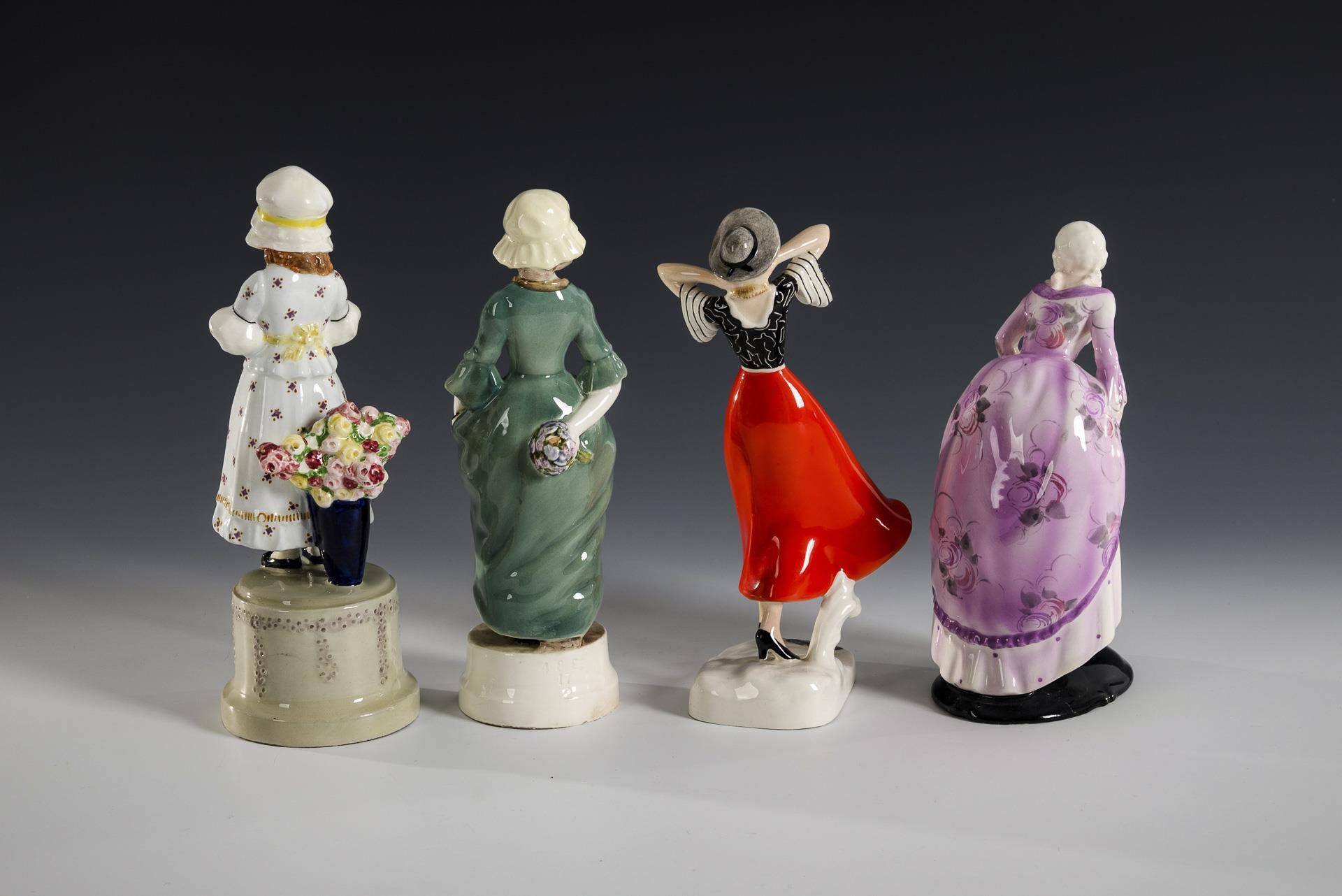 Kleines Blumenmädchen mit Blumenvase (Modell-Nr. 4401 43 11, signiert "Polter"). Mädchen in grünem Biedermeier-Kleid mit Buch und Blumenstrauß (Modell-Nr. 4893 17 2, signiert "Perigot"). Rokoko-Dame in violettem Kleid (Modell-Nr. 6672 39 10, signiert "Lorenzl"). Art-déco-Modedame mit Hut und rotem Rock (Modell-Nr. 6459 1071 2, signiert "Lorenzl"). Rokoko-Dame mit restauriertem Sockel, kleines Blumenmädchen mit restauriertem Hut und Sockel.