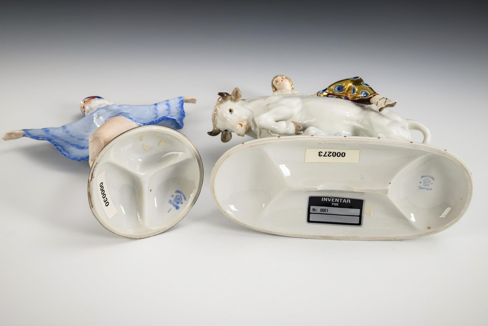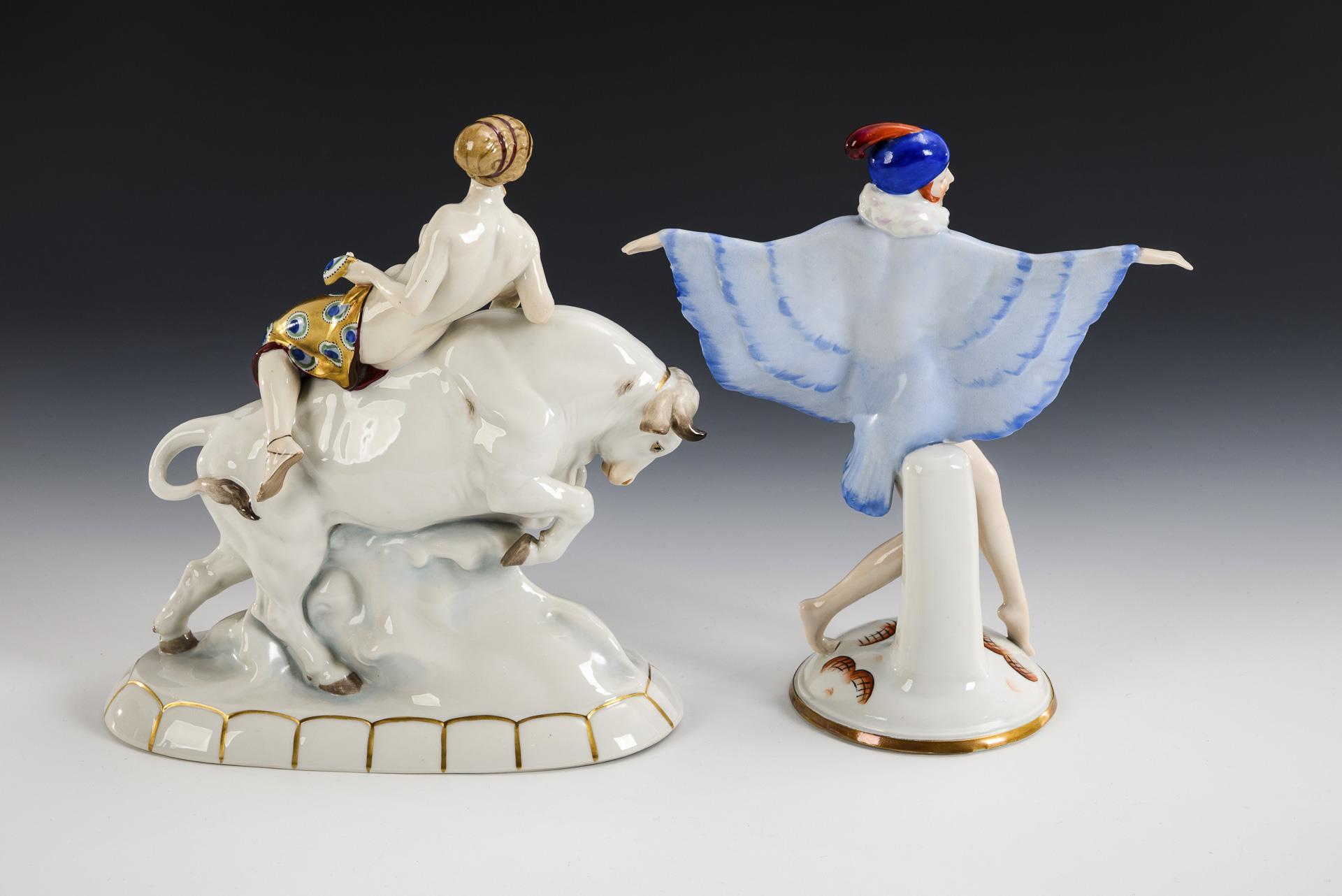 1x der über Wellen springende Stier mit der Europa auf dem Rücken. / 1x Modell-Nr. 4412, Entwurf 1922 von Josef Lorenzl (1892-1950) für Goldscheider, Wien: schreitende junge Frau im Federkostüm. Linke Hand der Tänzerin bestoßen.
