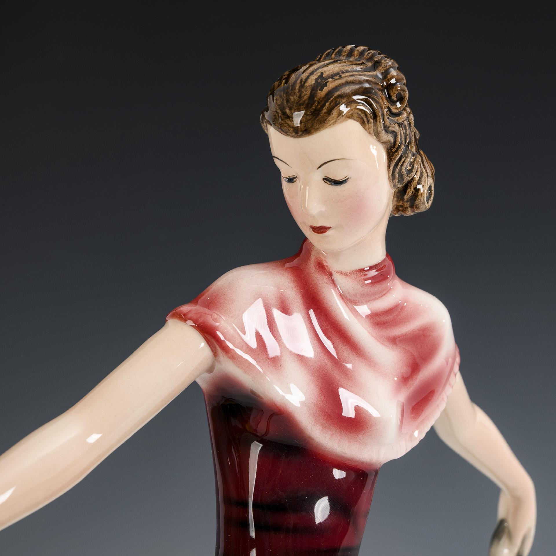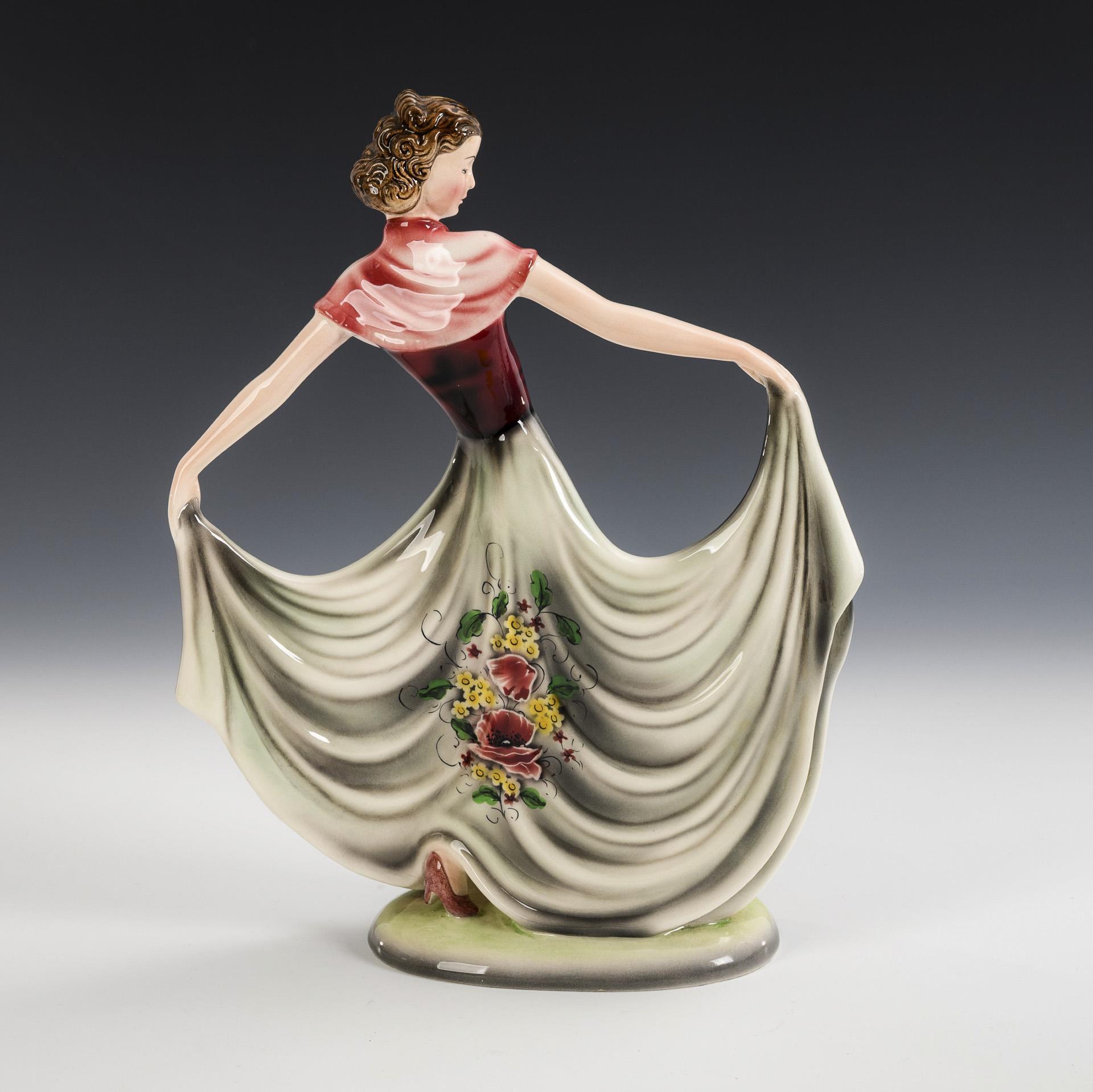 Art-déco-Tänzerin "Susette" in rot geblümtem Kleid. Wiener Manufaktur Friedrich Goldscheider.