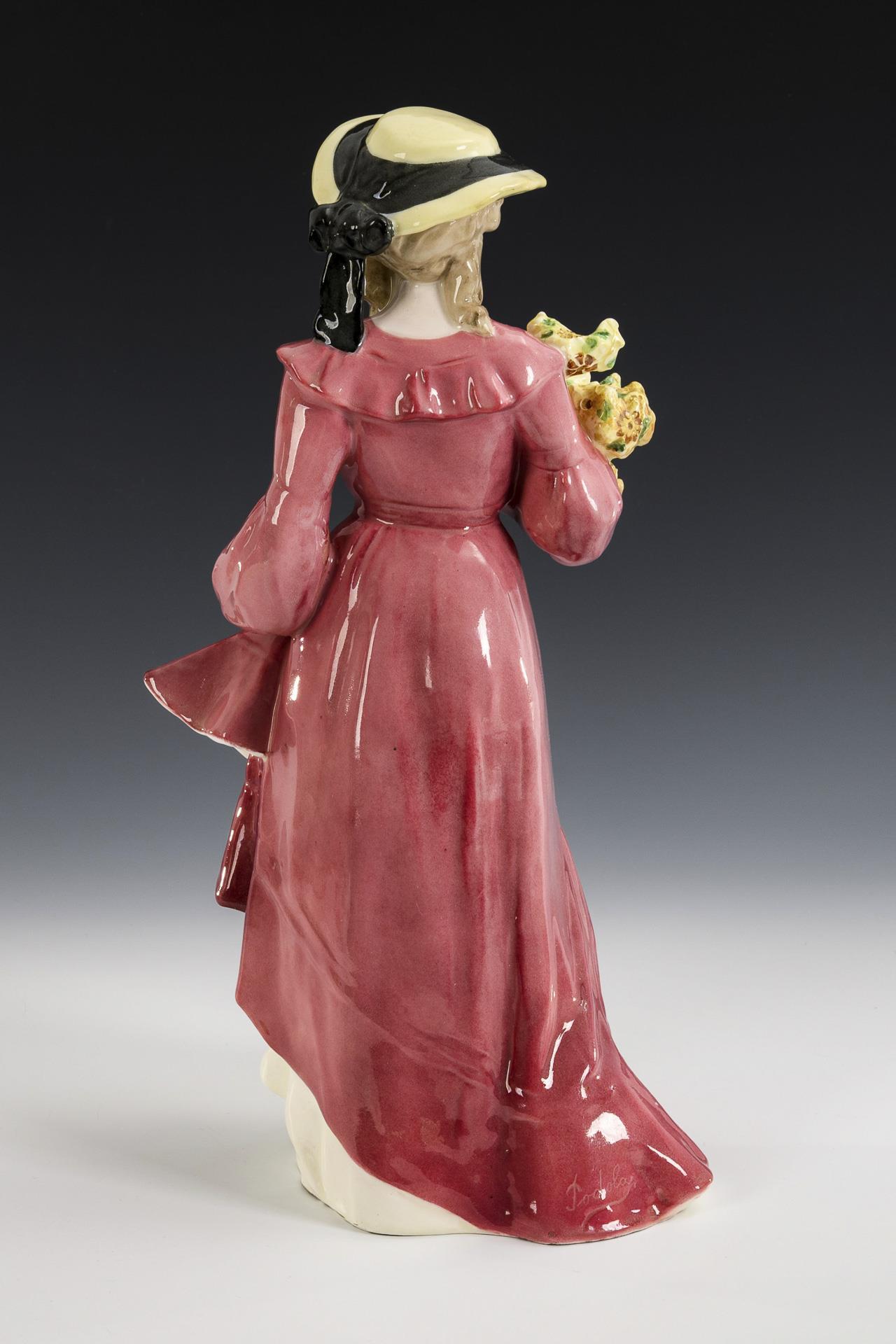 Elegante Dame in roséfarbenem Kleid, mit buntem Blumenstrauß und gelbem Hut.