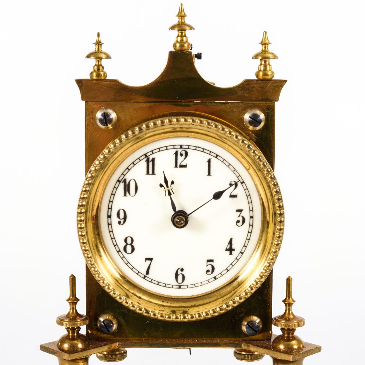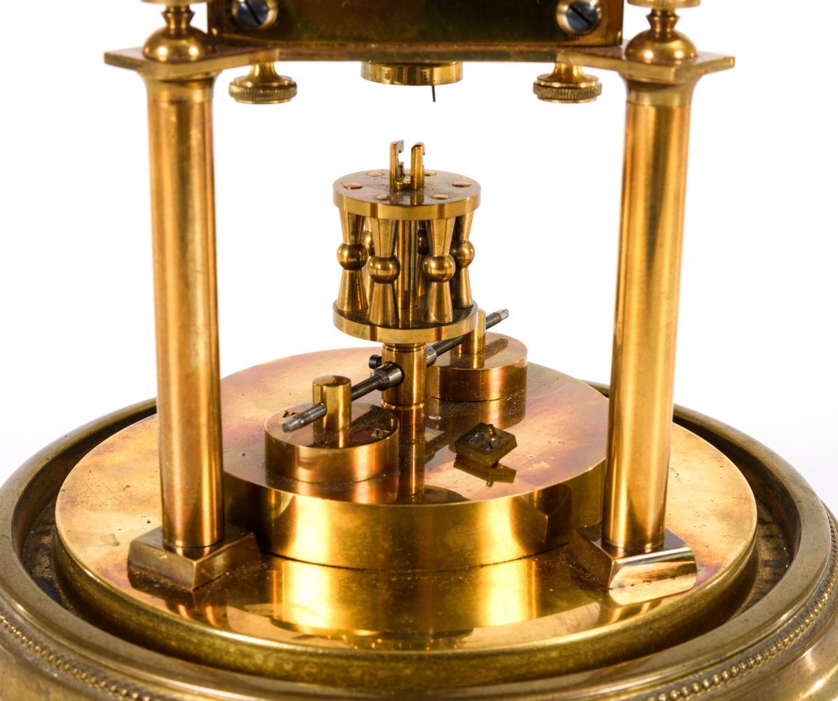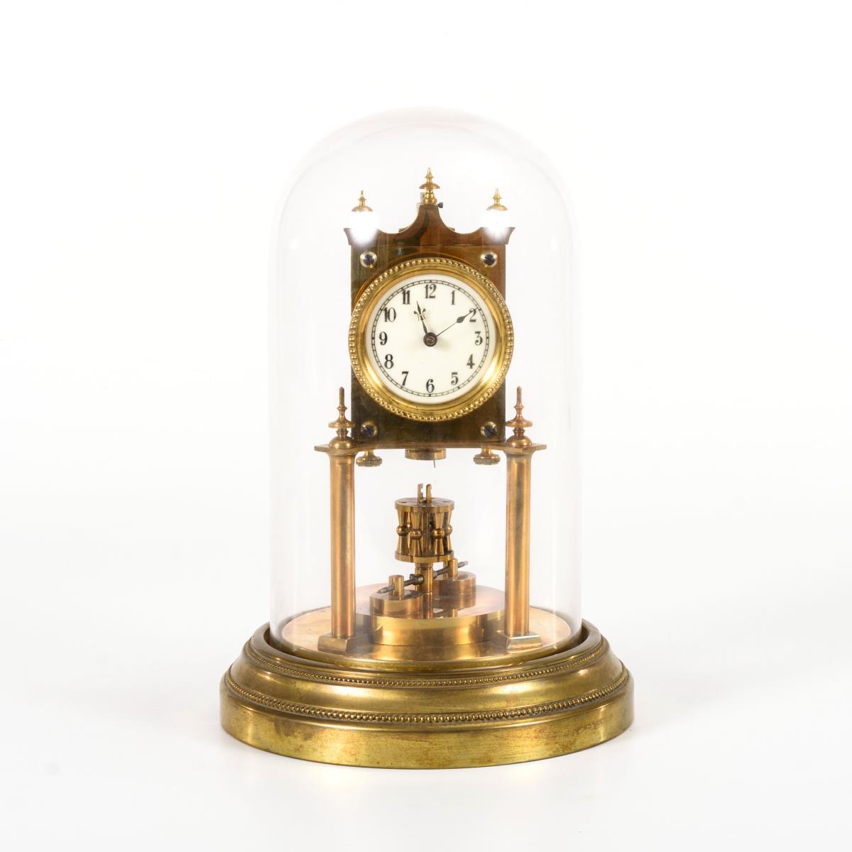 Mit 3 Zapfen bekröntes Uhrwerk auf 2 glatten Säulen und rundem Profilsockel mit Perlbändern. Mit Glasdom. Funktion nicht geprüft. Pendelaufhängung defekt, Glasrand gechippt, Altersspuren.