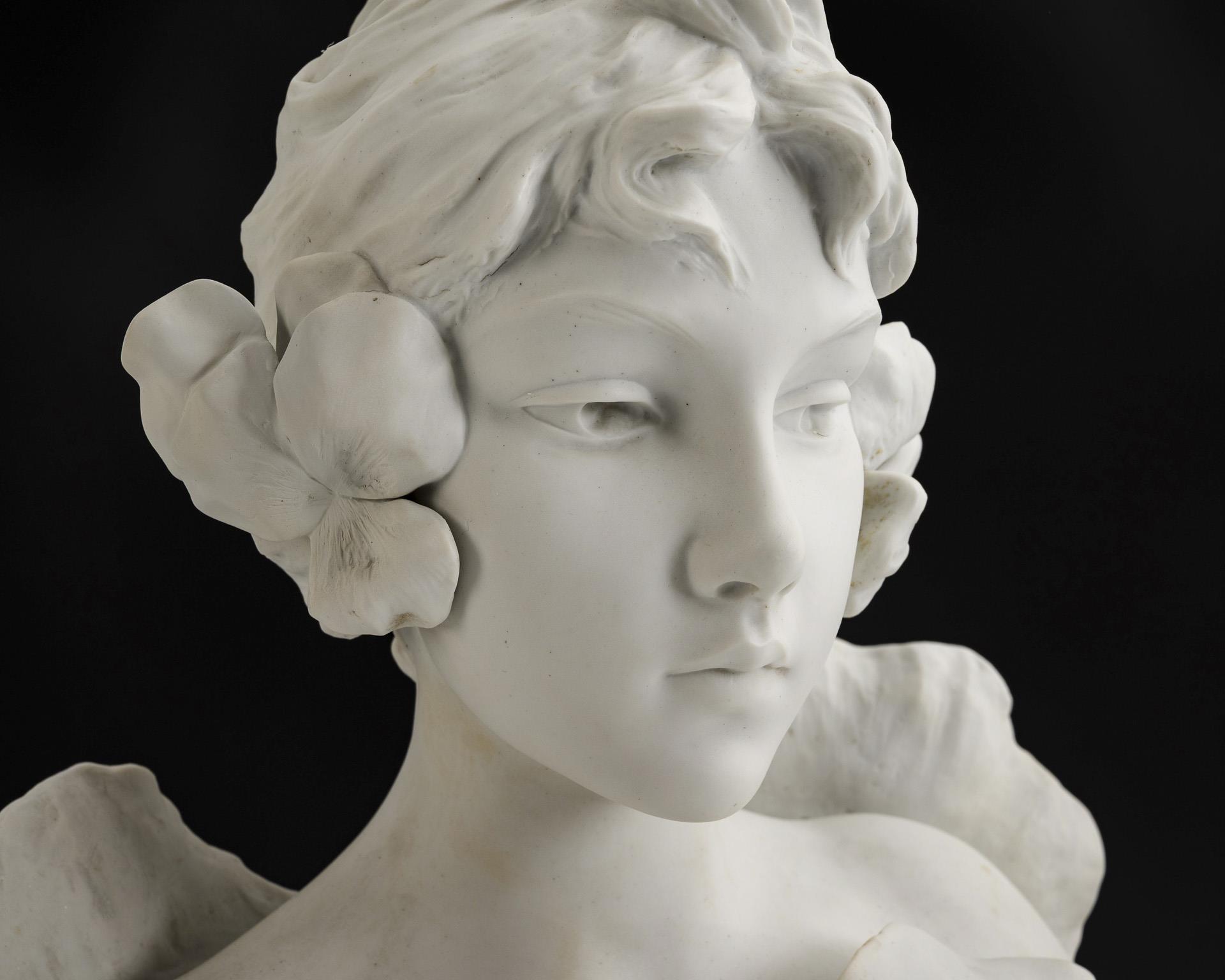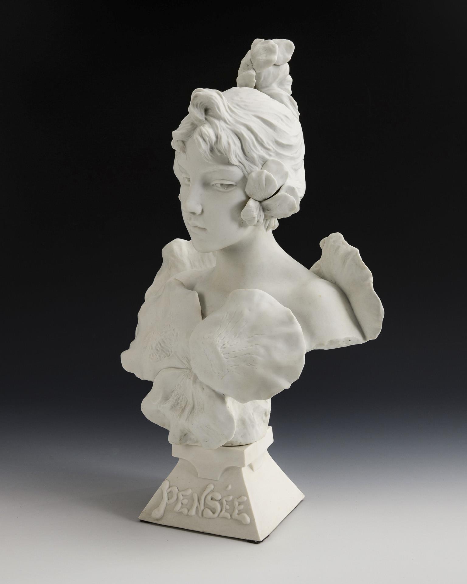 Büste eines Mädchens mit blütengeschmücktem Haar, auf dem Sockel bezeichnet "Pensée".