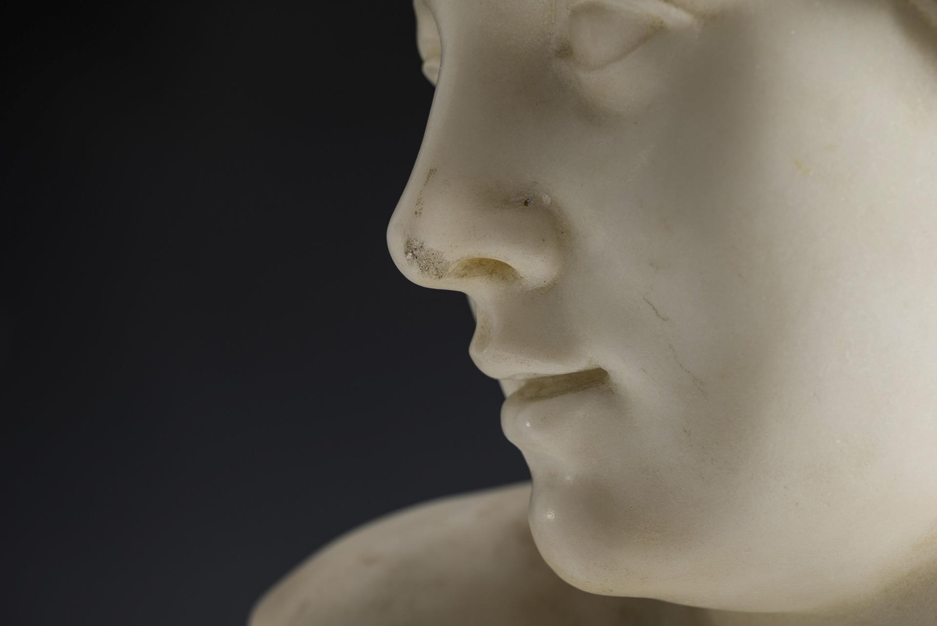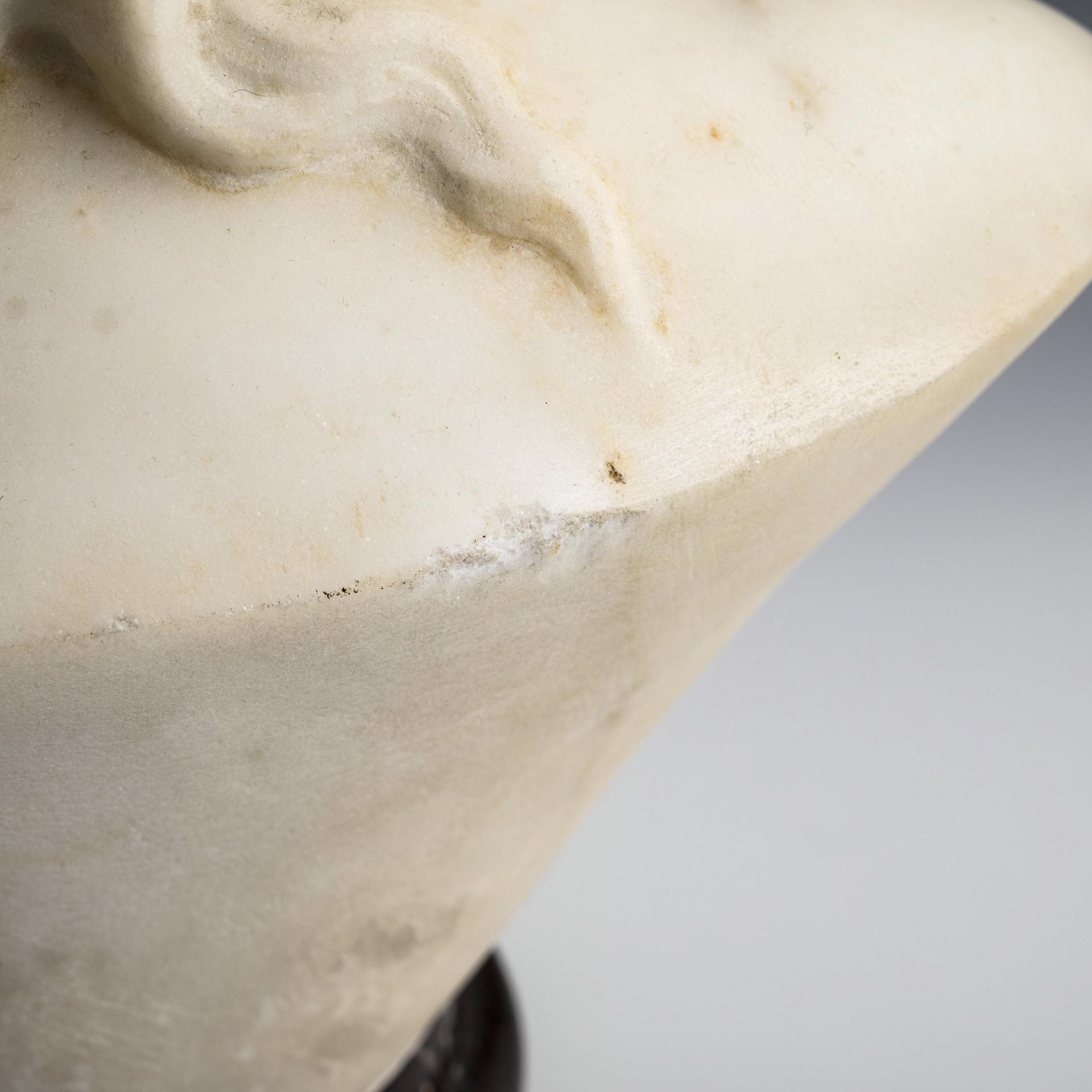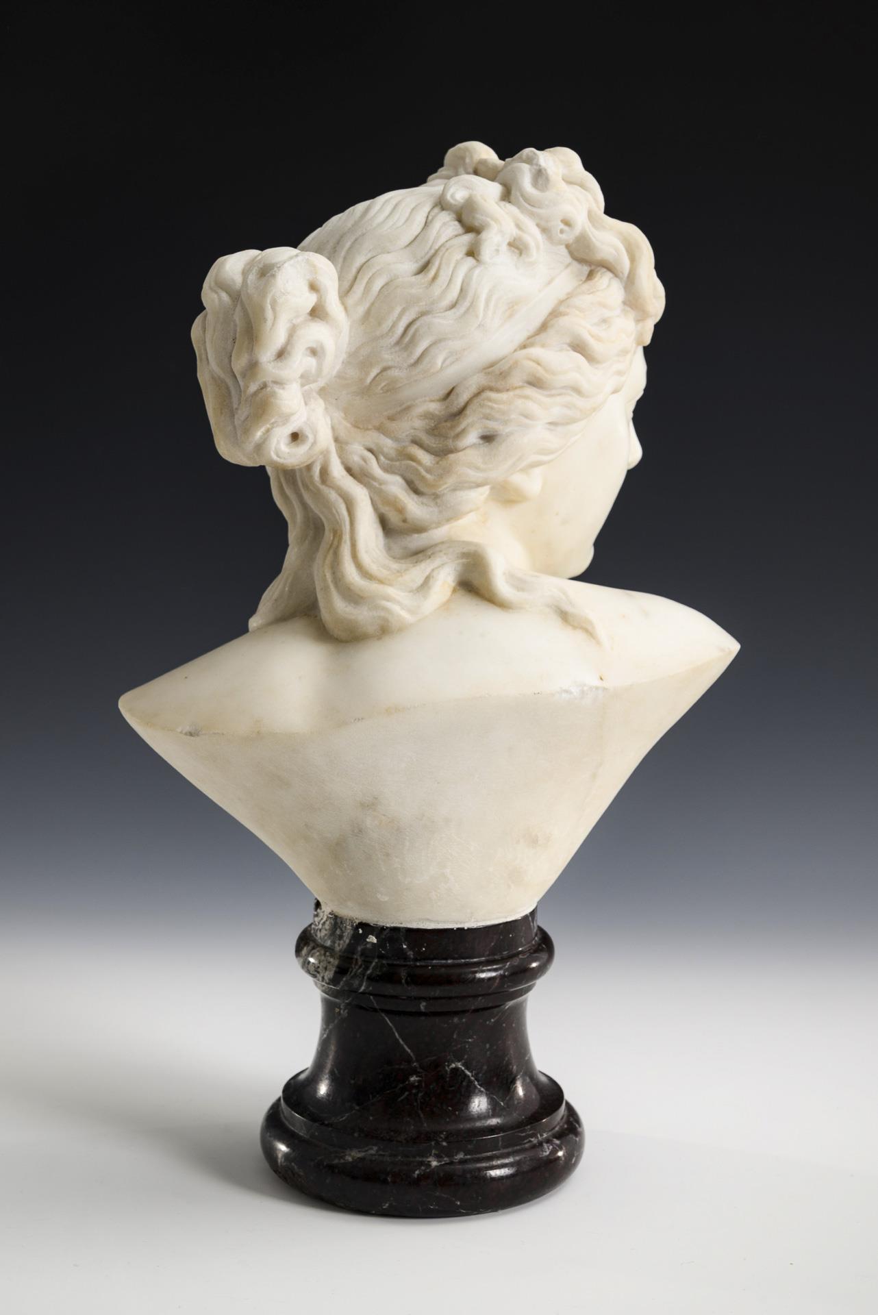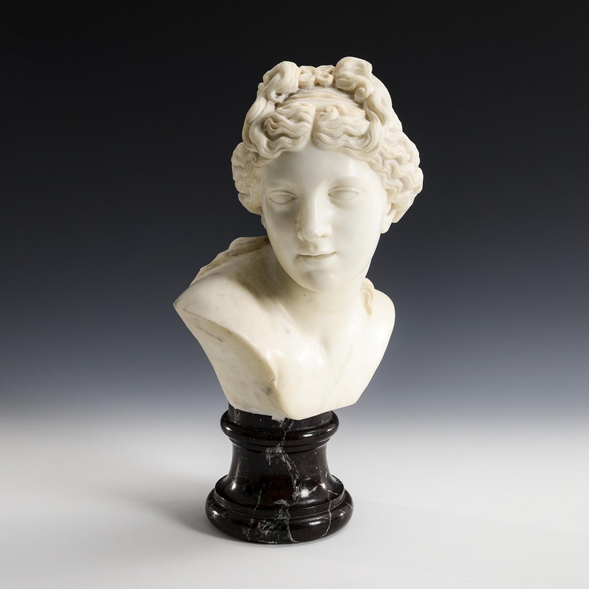 Marmorbüste einer jungen Frau mit hochgebundenen Haaren. Abplatzungen an Nase und Hals, Sockel teils ausgebrochen.