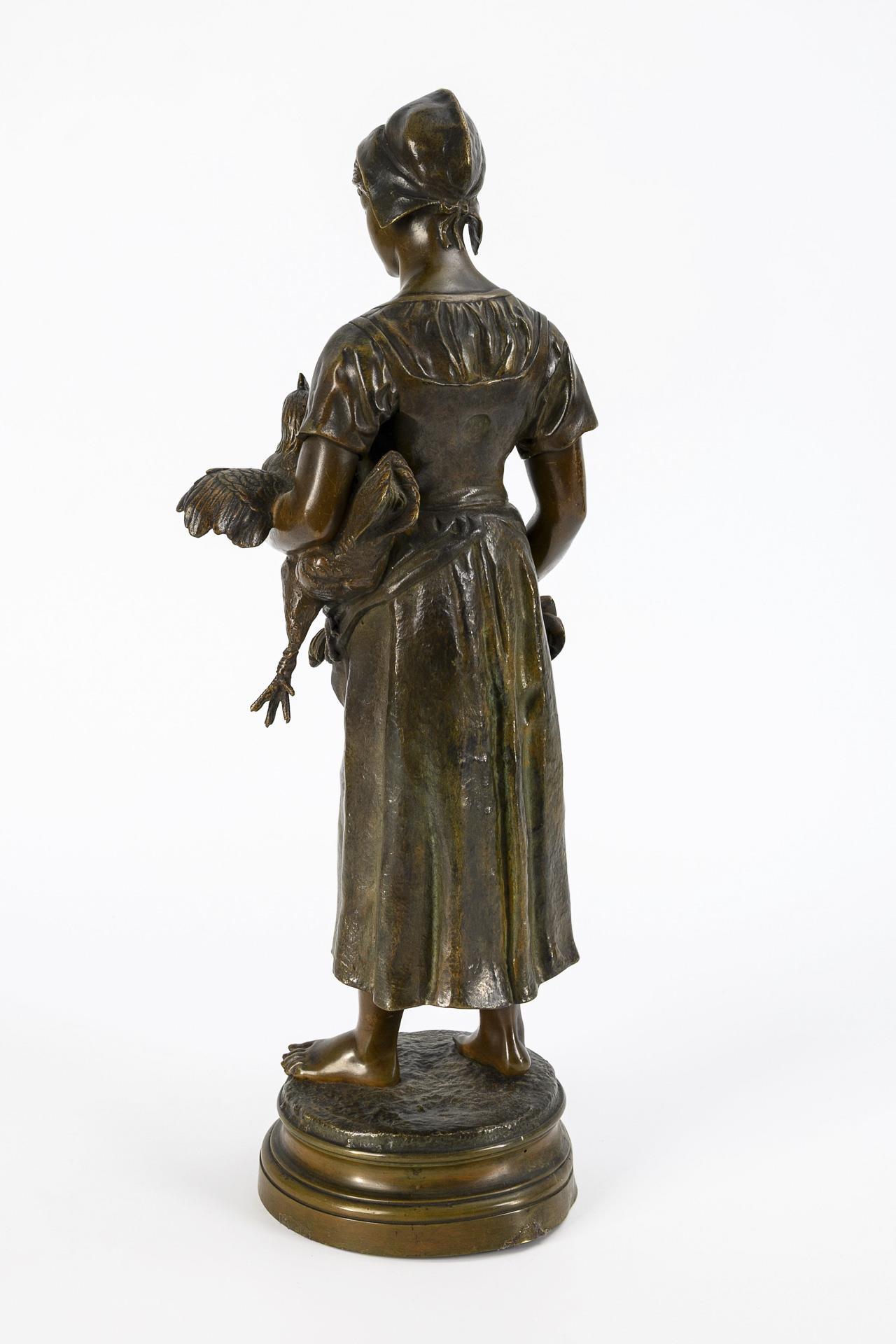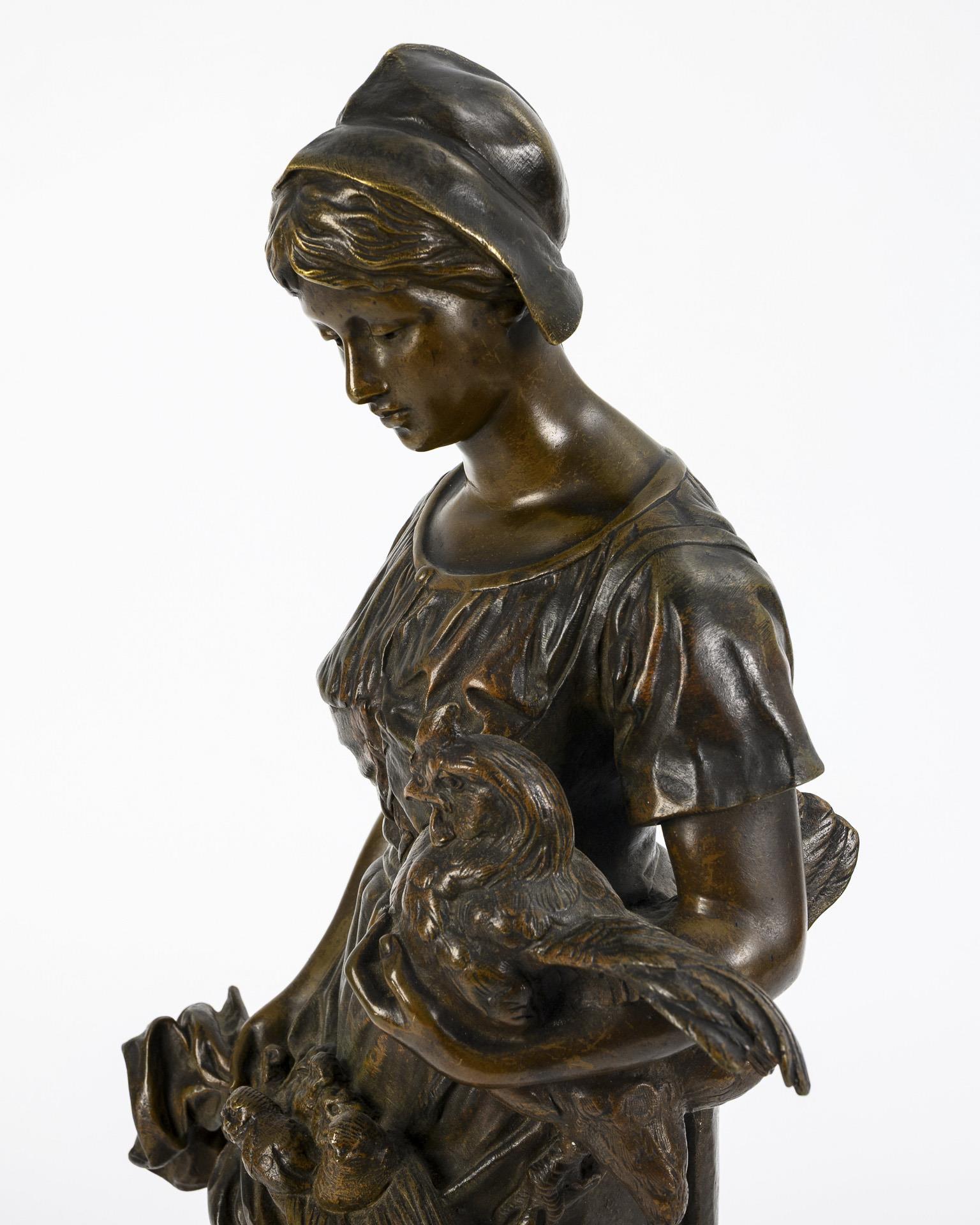 Stehende junge Bäuerin mit einen Huhn auf dem Arm und dessen Küken in der Schürze. Patina etwas berieben, Bronze-Plinthe verbeult mit Ausbesserung.