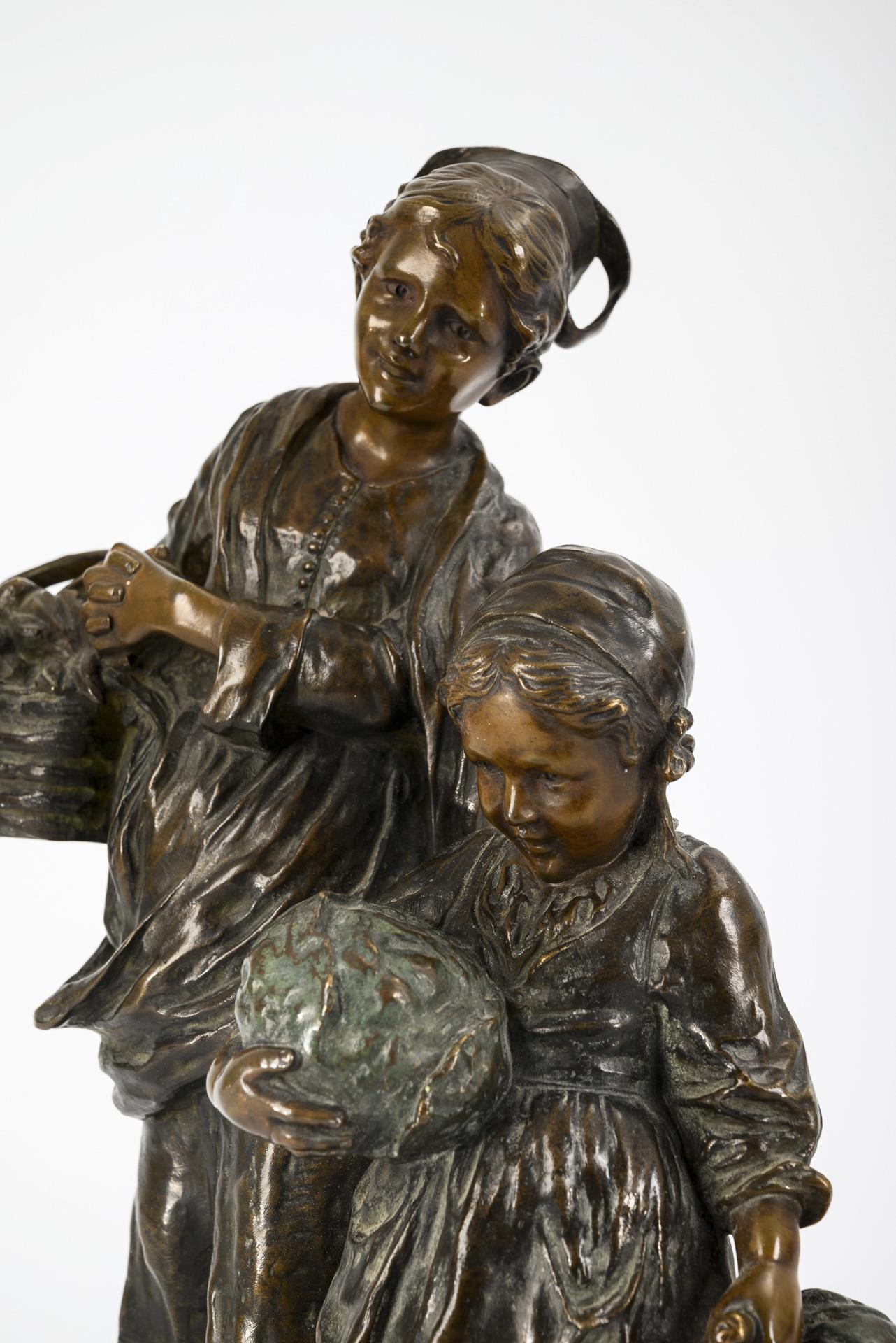 Zwei vergnügte Mädchen mit gefülltem Korb bzw. zwei Kohlköpfen wohl auf dem Weg zum Markt.