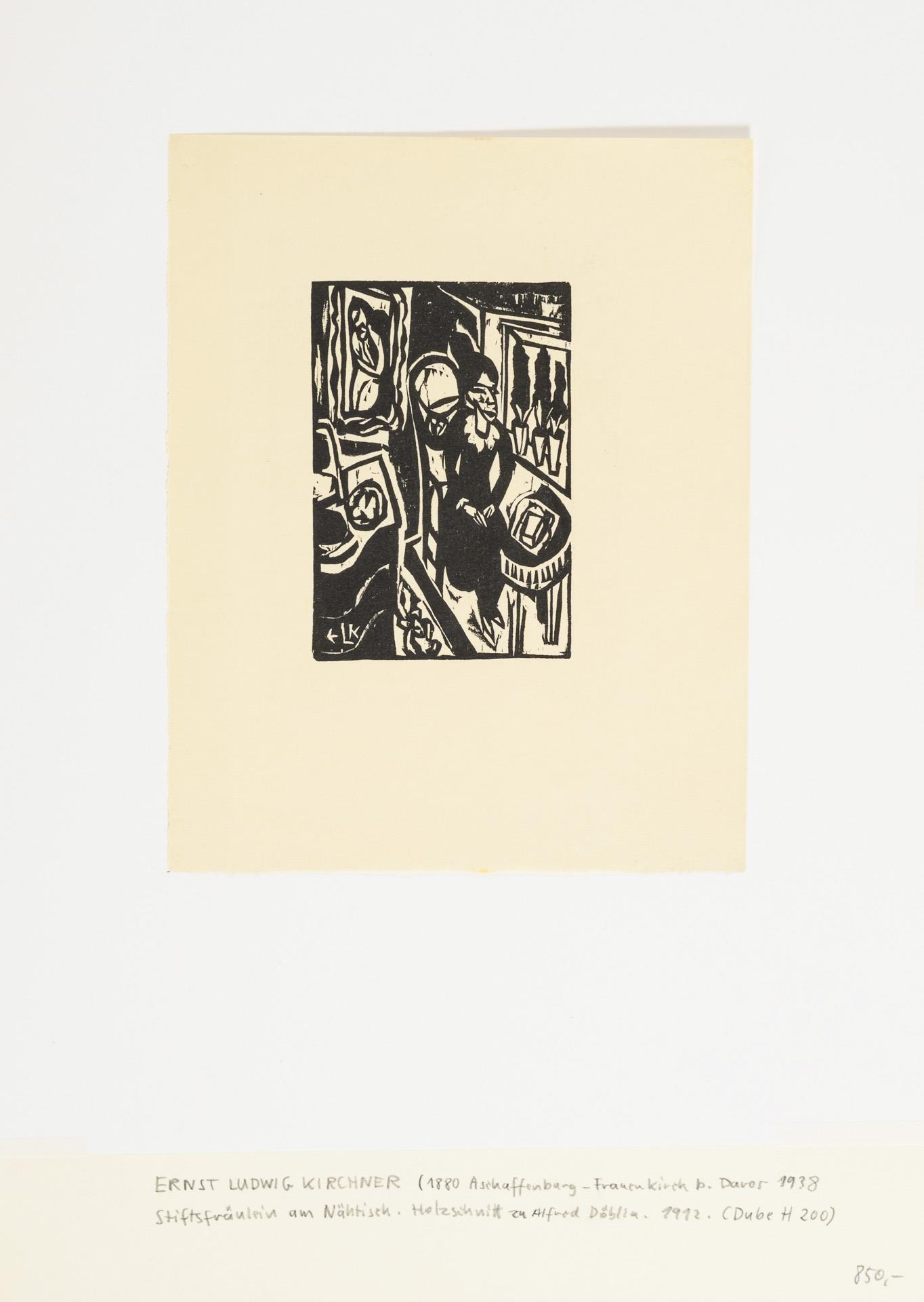 Aus "Das Stiftsfräulein und der Tod" von Alfred Döblin, Alfred Richard Meyer Verlag Berlin-Wilmersdorf, 1913. Kräftiger Druck, Blatt wohl an zwei Seiten leicht beschnitten, eine unauffällige Stauchspur am Blattrand, unter Passepartout nicht zu sehen.
