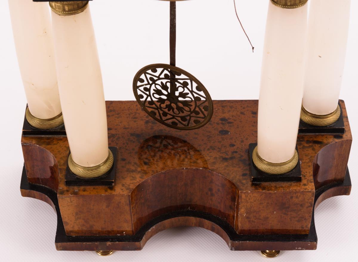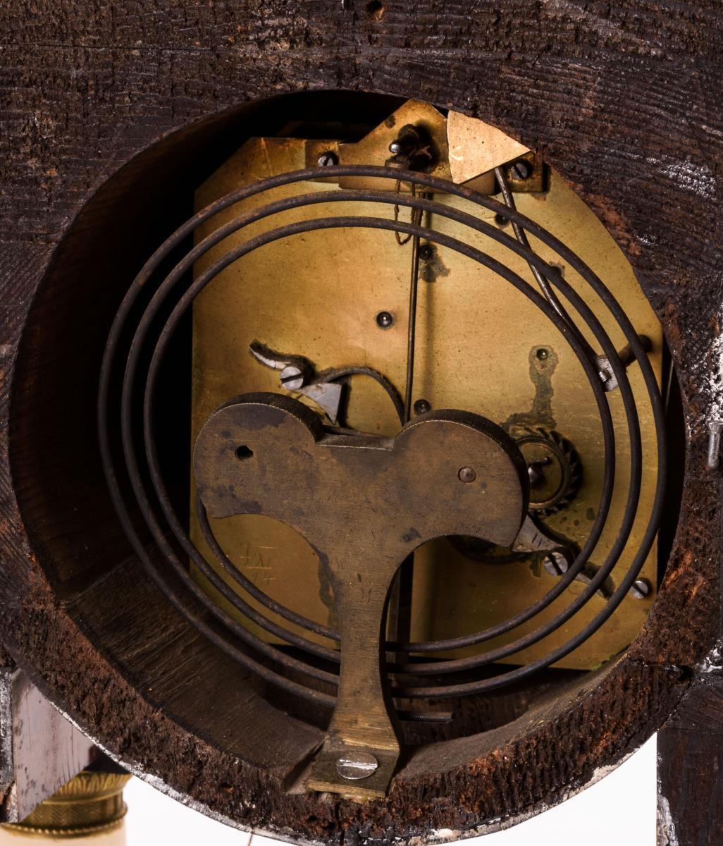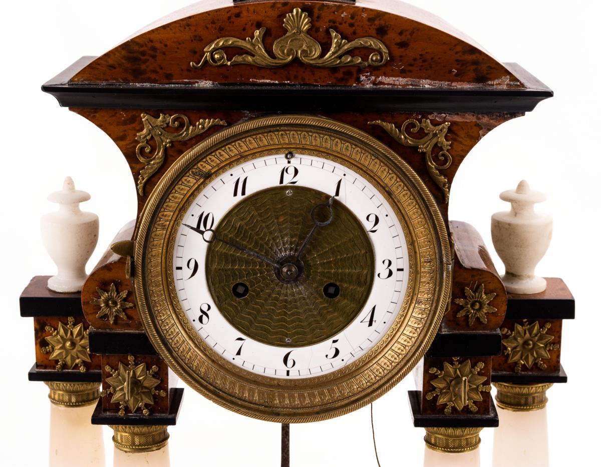 Klassizistische Portaluhr mit 4 Säulen und Bogengiebel, bekrönenden Alabasterurnen und floralen Zierbeschlägen. Läuft nicht. Alt restauriert, mit Ergänzungen. Mit Defekten und Fehlstellen, restaurierungsbedürftig.
