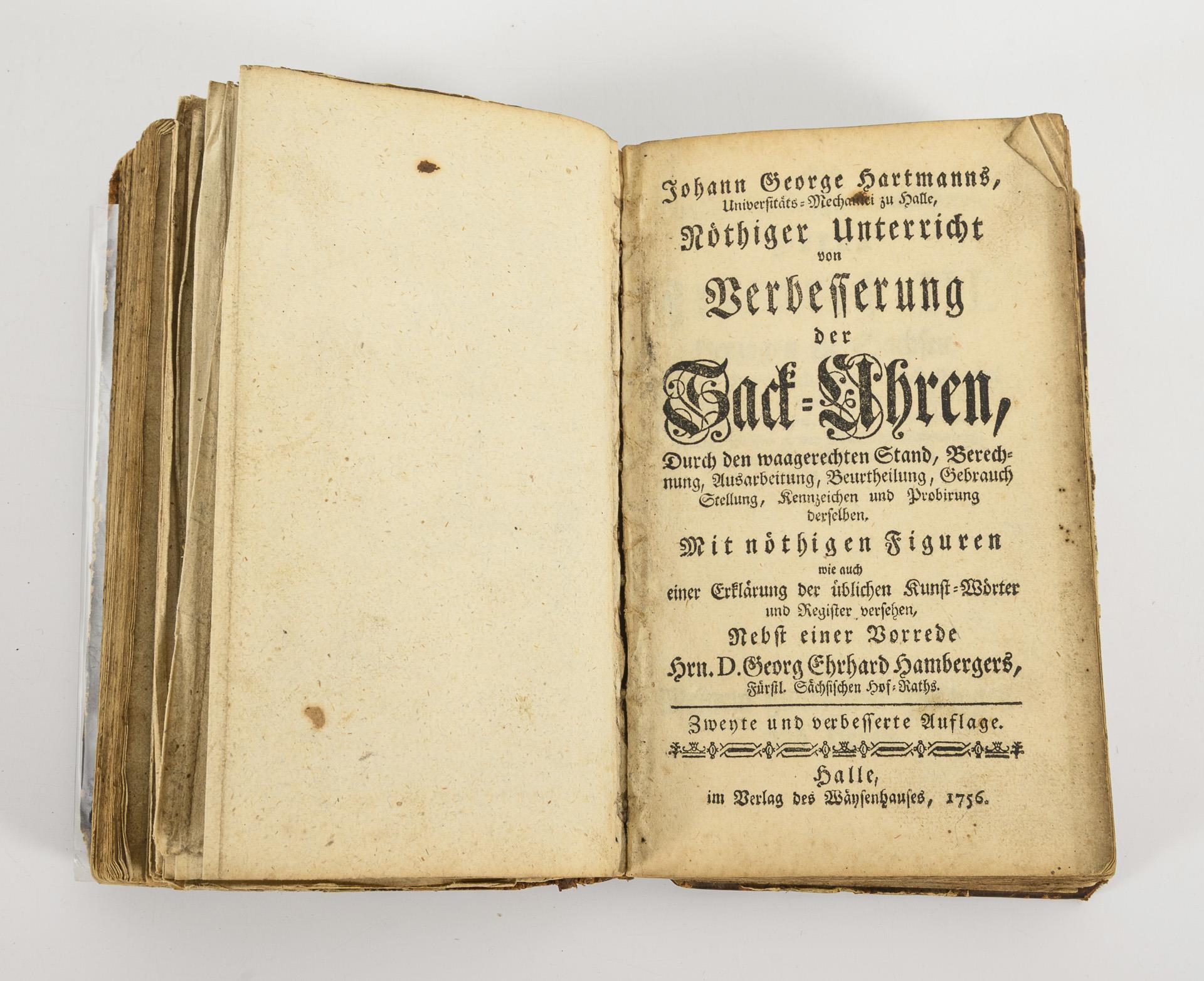 Titelblatt, 12, 210 mit zahlreichen Tabellen und Rechenbeispielen, (22) Seiten und 15 Falttafeln (Nummer 1-16, Nr. 2 fehlt), "... Verbesserung der Sack-Uhren ..., nebst einer Vorrede ... Georg Ehrhard Hambergers (Zweyte und verbesserte Auflage), (26), 90, (6) Seiten, ohne Faltblätter. Halbledereinband der Zeit. Buch beinhaltet Wand-, Secunden-, Monath-, Jahr-, Tisch-, Stutz- und Sackuhren. Beiliegend einige jüngere Blätter "Zeitgleichungs-Tabellen". Altersgemäß stärkere Nutzungsspuren.
