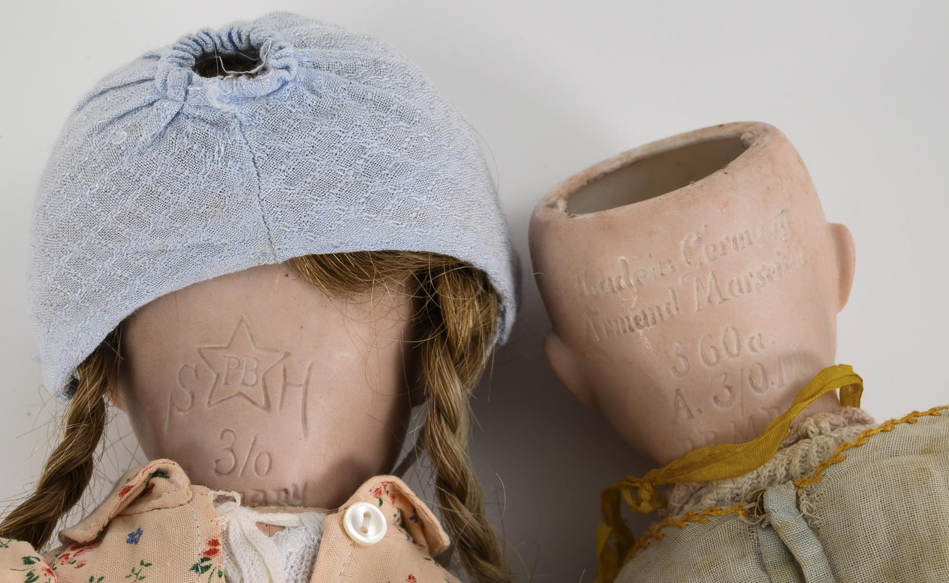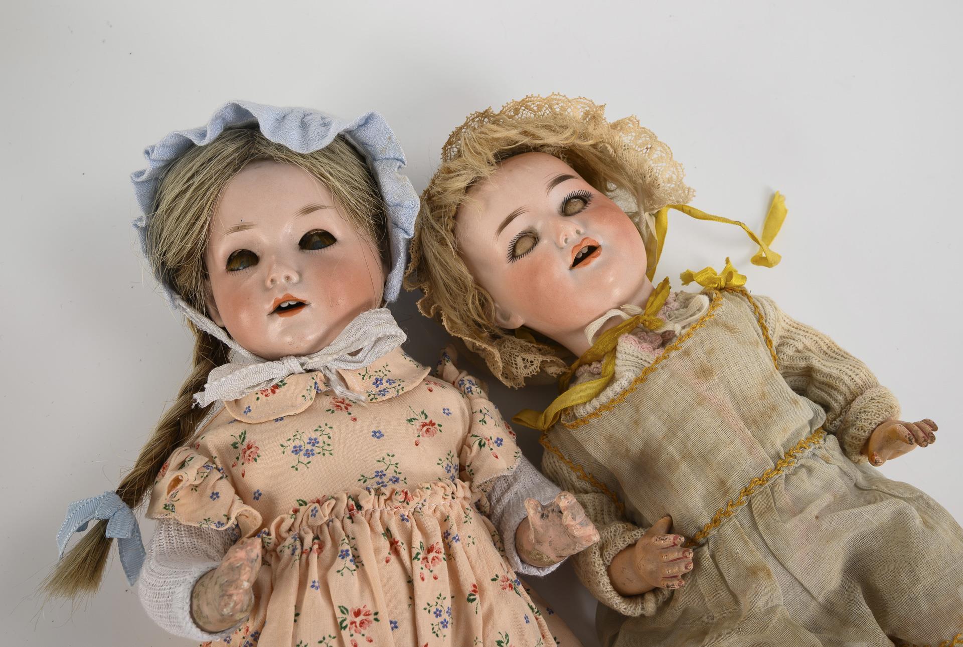 Beide mit Kurbelkopf, blauen Schlafaugen und 5-teiligem Sitzbabykörper. Charaktermädchen (Schönau & Hoffmeister) mit geflochteten Zöpfen und rosa Kleid mit Blumendruck. 1 Finger repariert, 1 Zeh bestoßen. / Charakterbaby (Armand Marseille 560a) mit Mohairperücke und hellem Kleidchen. Etwas tiefliegende Augen mit Silberblick. / Beide Köpfe durchleuchtet: ohne Defekte, Körper mit Farbabrieb.