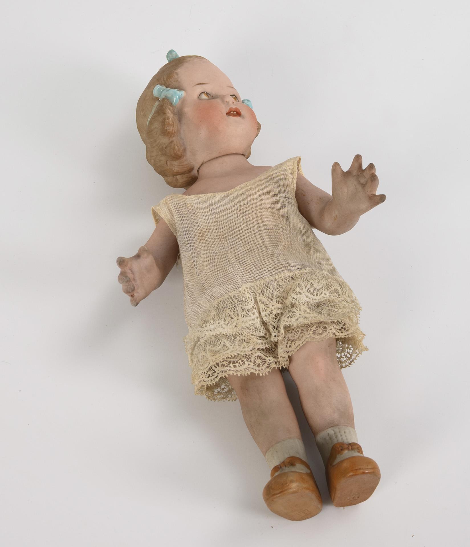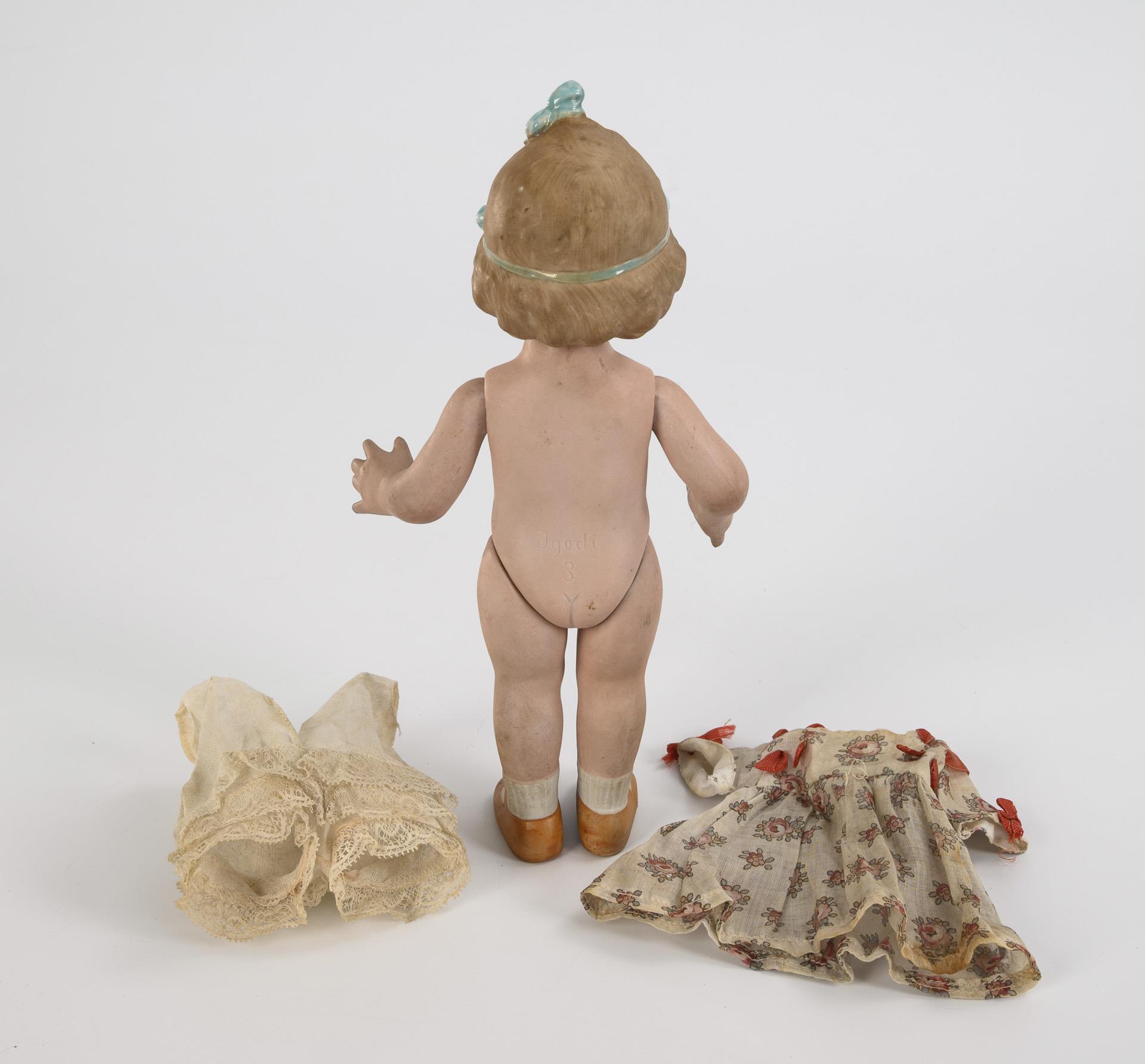 Drehbarer Igodi-Kopf mit gemalten Schielaugen, modellierten Haaren und Haarschleifen. 5-teiliger Stehpuppenkörper mit modellierten Schuhen. Helles Kleidchen mit Blumendruck. 1 winziger Chip am Kopfansatz.