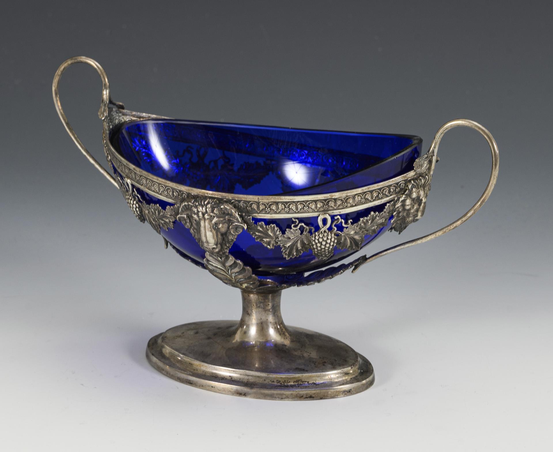 Silberne Fußschale mit kobaltblauem Glaseinsatz.