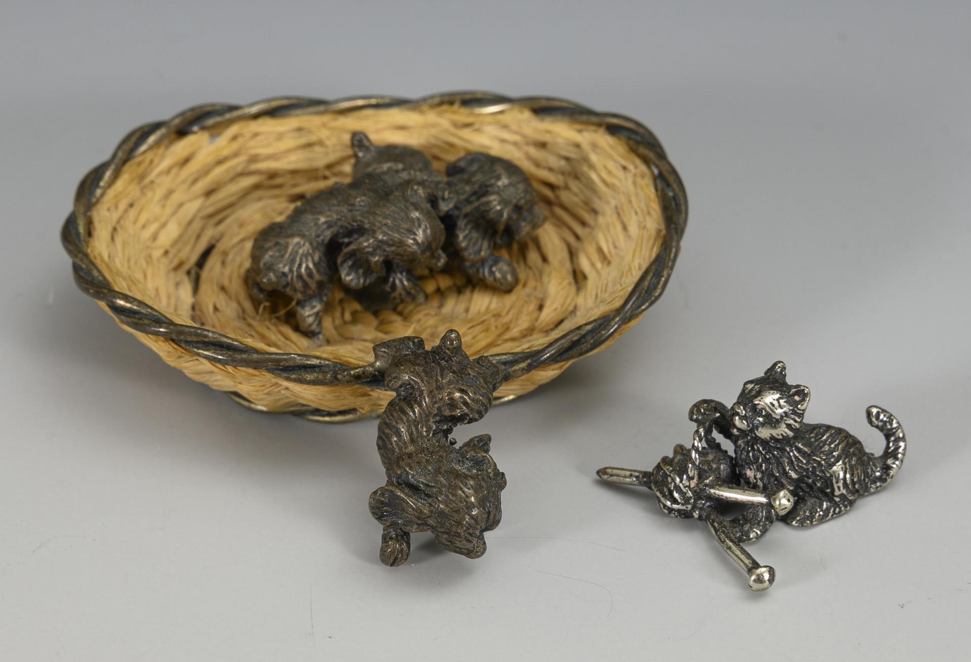 Hund, Korb mit Hundewelpen und Katze mit Wollknäuel.