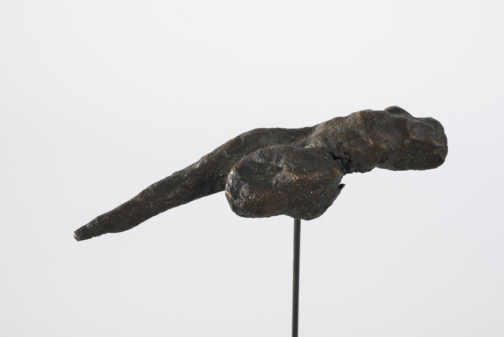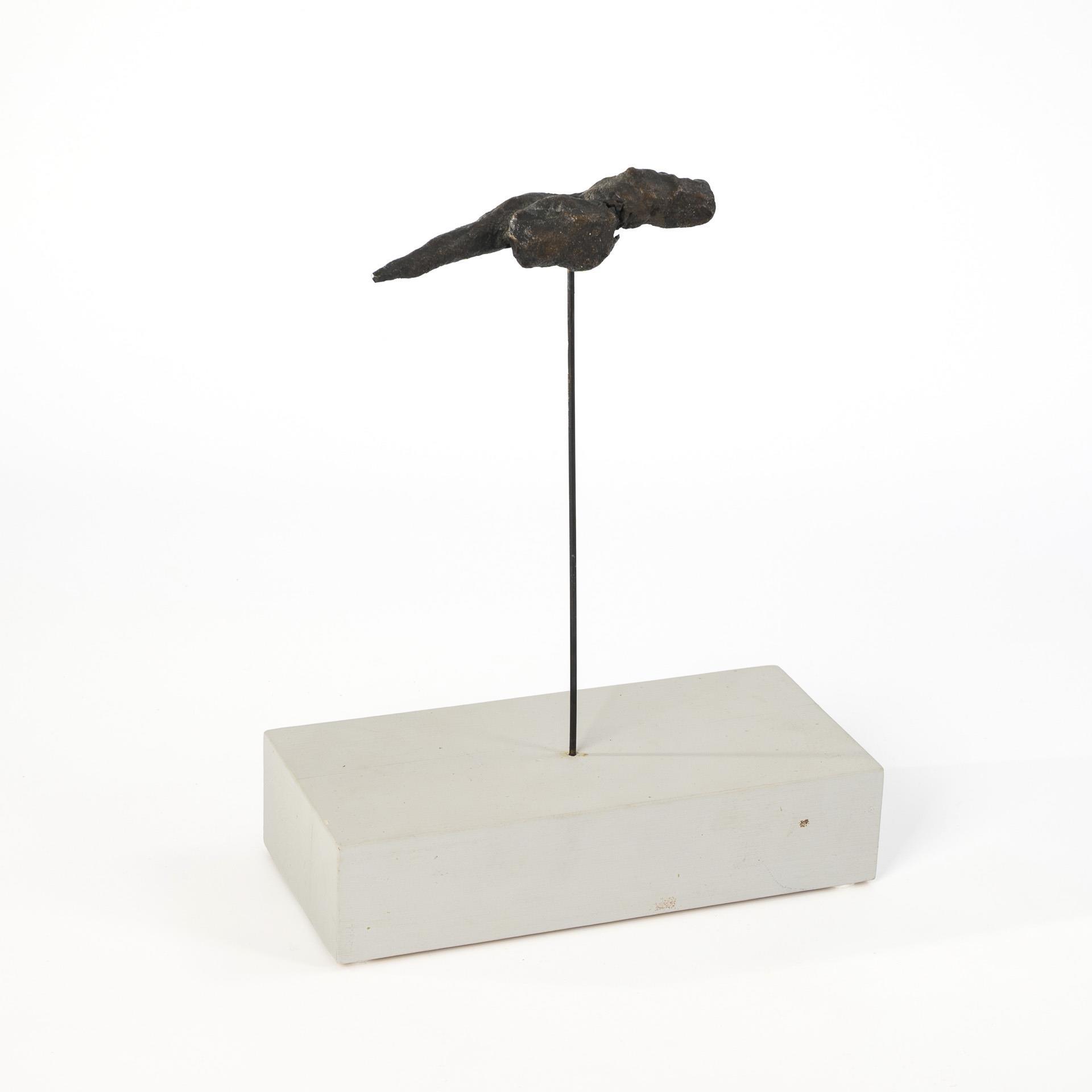 Bronze patiniert, Messingdraht, Nadelholzsockel grau gefasst. 2012. Bronze unbezeichnet, unter dem Sockel signiert/datiert/betitelt mit Zusatz "Unikat" und "S-034". L Bronze 15,5 cm, gesamt 33 x 25 x 12 cm. 1,4 kg.