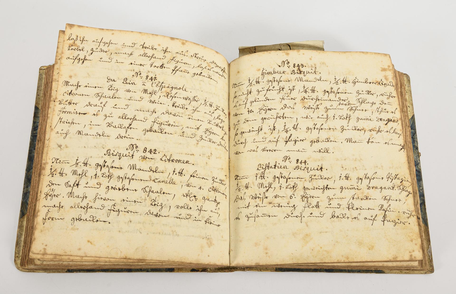 Wohl 524 Rezepte in einheitlicher Handschrift und viele weitere Rezepte ohne Nummerierung und von anderer Hand. Davon ca. 54 Rezepte für Kuchen und Torten. Wohl gehobenere Küche. Im Vorsatz: "Johann Friedrich Berger A. 1782". Das Buch stammt aus Schwabach bei Nürnberg, das zum Markgrafentum Ansbach gehörte, nach Information des Einlieferers. Die Rezepte beginnen mit der Nr. 519. Halbpergamenteinband.