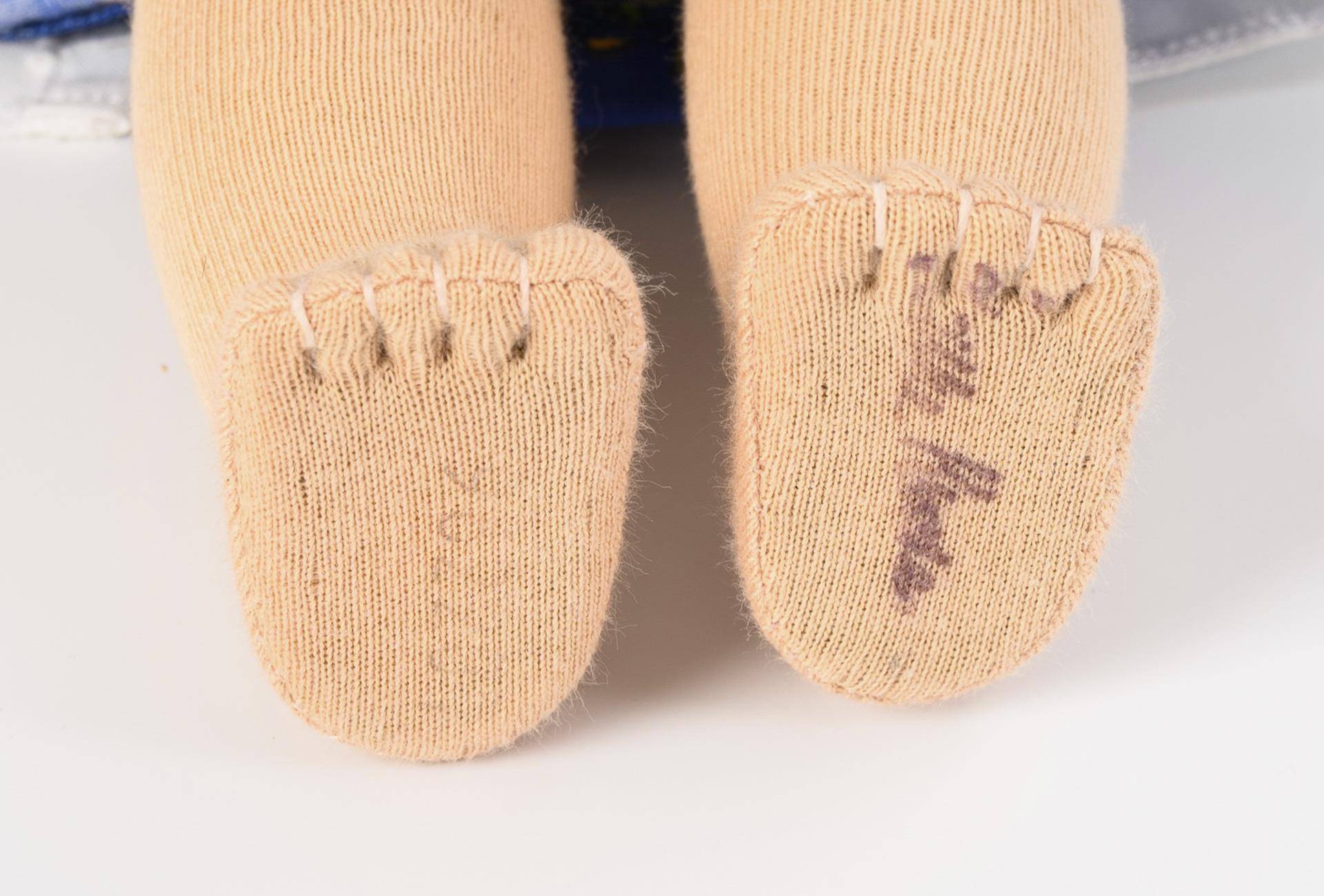 Kurbelkopf aus Kunststoff, gemalte blaue Augen, Echthaarperücke mit geflochtenem Zopf. Schlanker Stoffkörper mit Schlenkerarmen, Beine mit Scheibengelenken. Blaues Kleid, weiße Schürze, weiße Lederschuhe. Unbespielt.