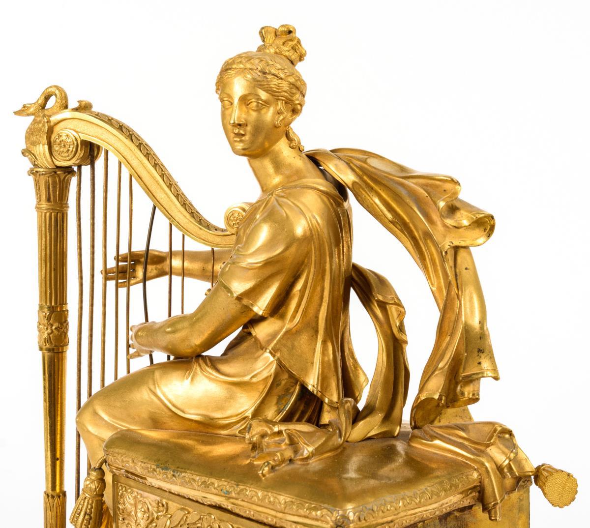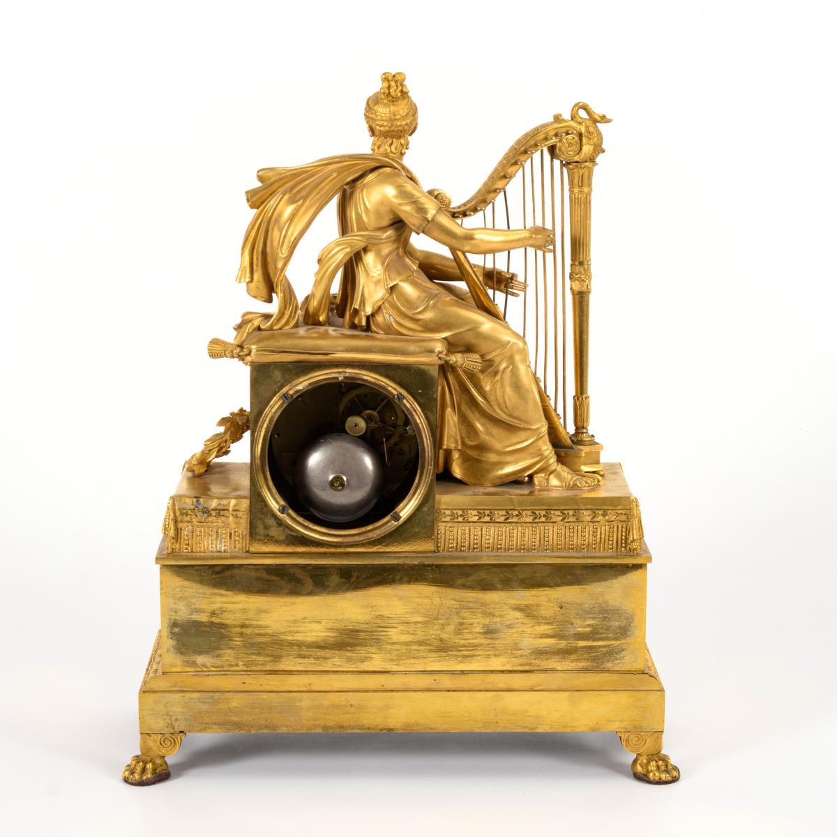 Reliefverzierter Sockel mit bekrönender Antikenfigur beim Harfespiel. Läuft an.