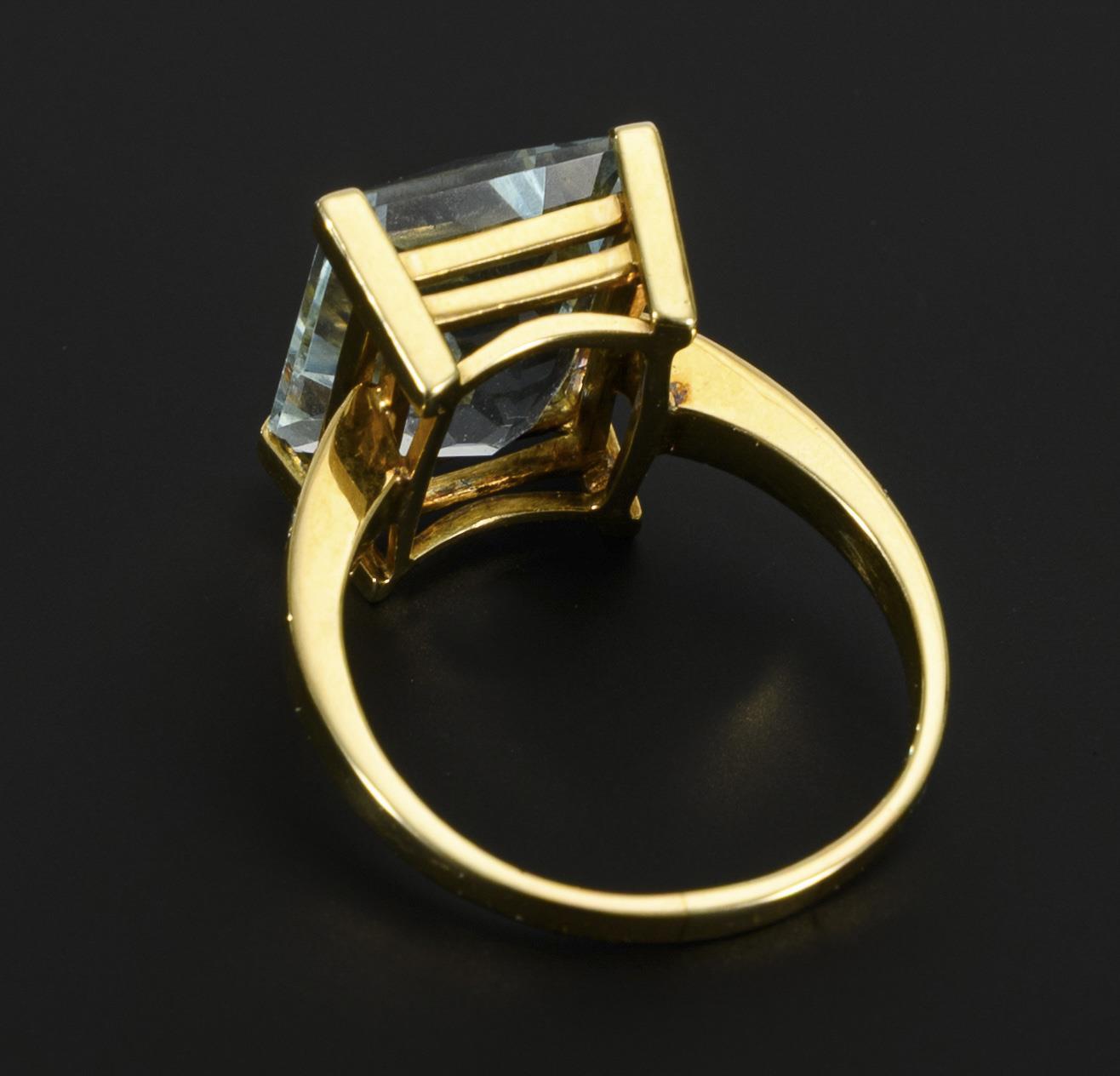 Gelbgold 585 gestempelt. Ringgröße 62, der hellblaue Farbstein (in der Fassung gemessen) ca. 15,03 x 12,14 mm. 8,0 g.