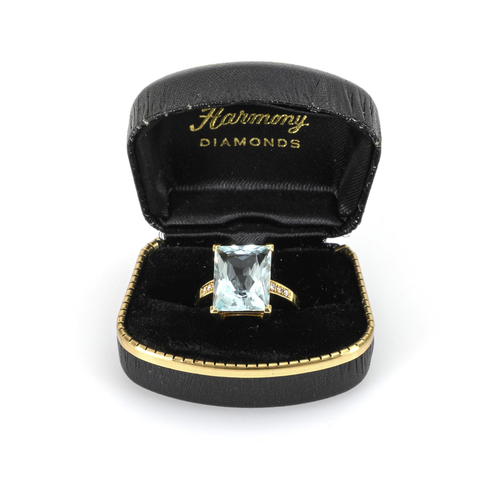 Ring mit einem großen blauen Farbstein, wohl Aquamarin, in Chatonfassung, an den zarten Ringschultern von je 3 kleinen Brillanten eingefasst. Unterseitig mit Spuren einer Ringgrößenerweiterung.