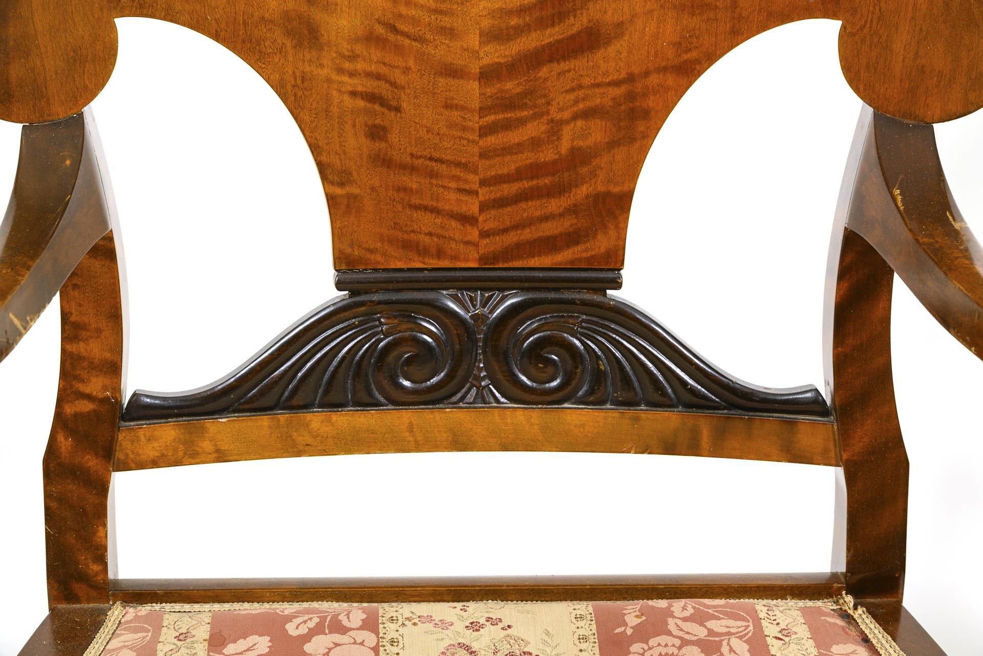 Salongarnitur aus 2 Polsterstühlen und 2 Armlehnstühlen mit gespiegelt furnierten Schaufellehnen und ebonisierter Volutenversprossung, gerundete Armlehnen mit Endvoluten, auf 4 leicht ausgestellten Vierkantbeinen. Ergänze Polsterung und rosé-weiß gestreifter Stoffbezug mit floralem Muster. Alters- und Gebrauchsspuren, mit Defekten, Bezüge fleckig, restaurierungsbedürftig.